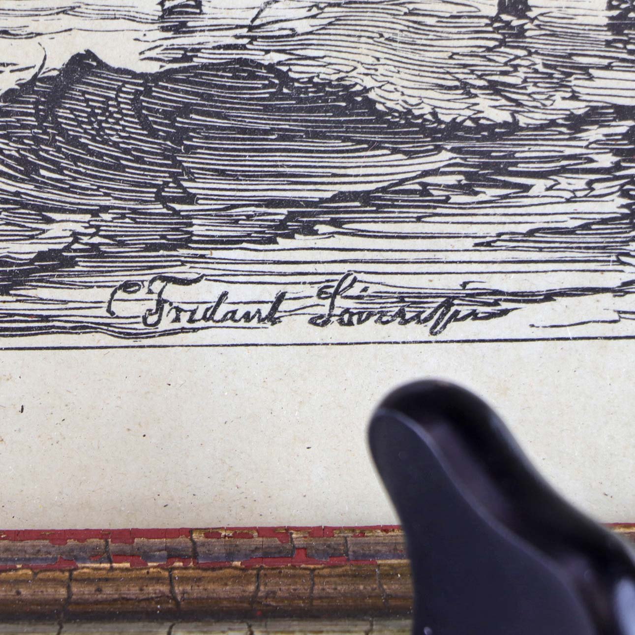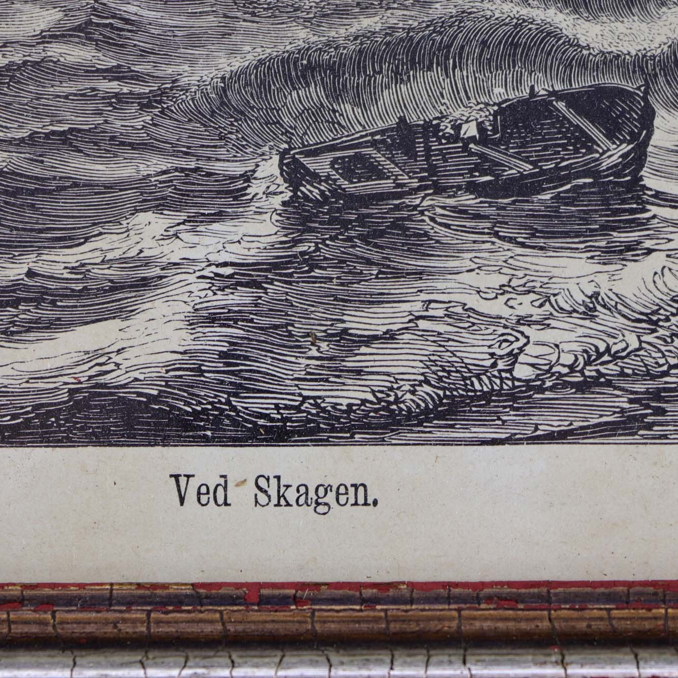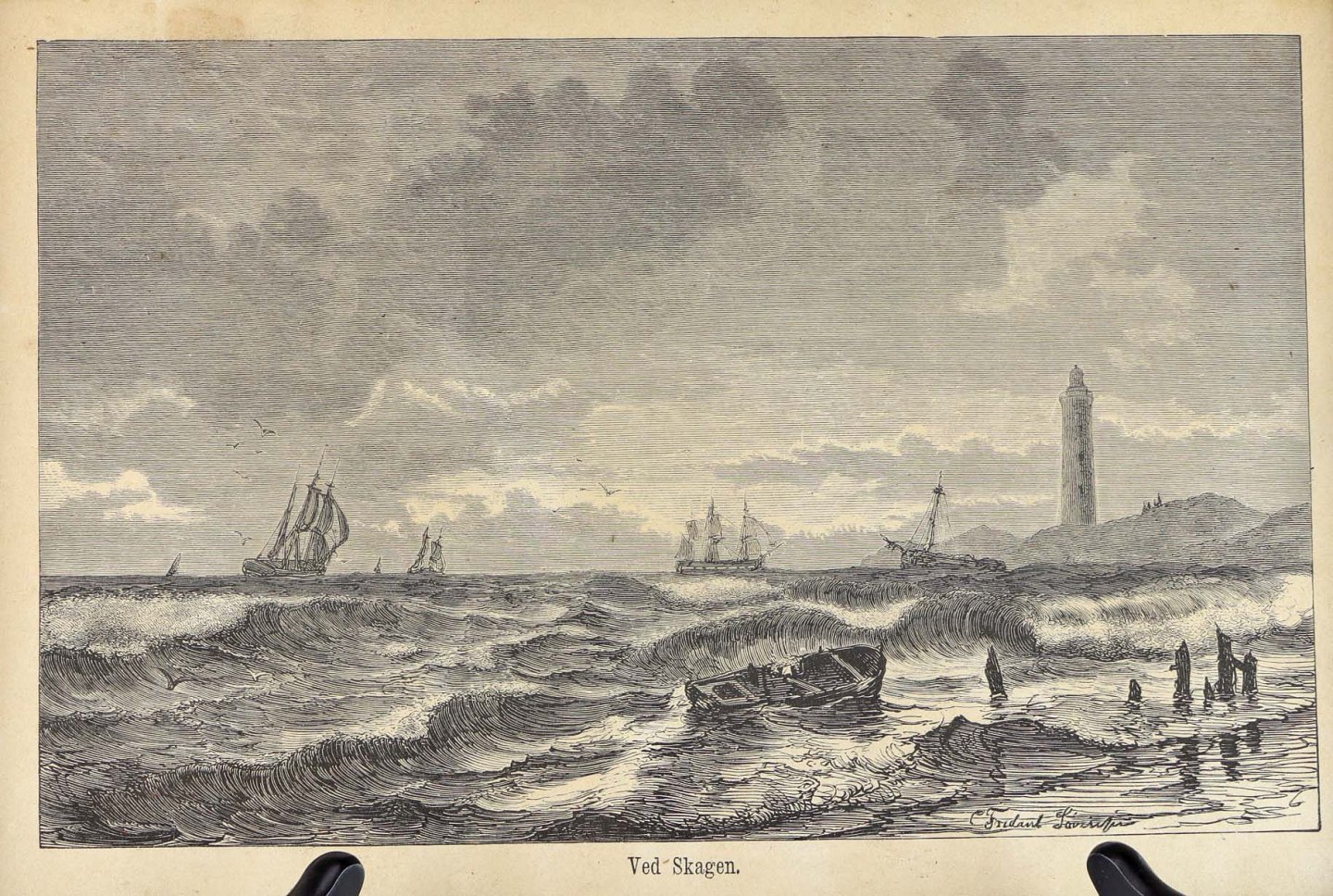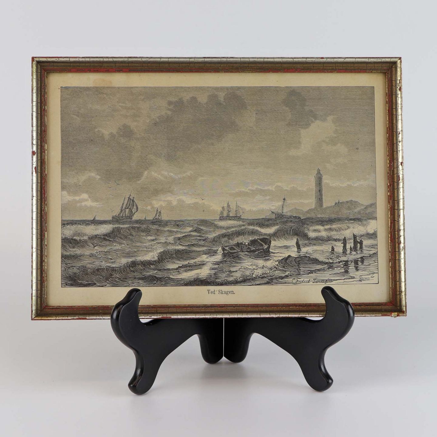 Radering med motiv af sejlskibe, mennesker og fyrtårn.