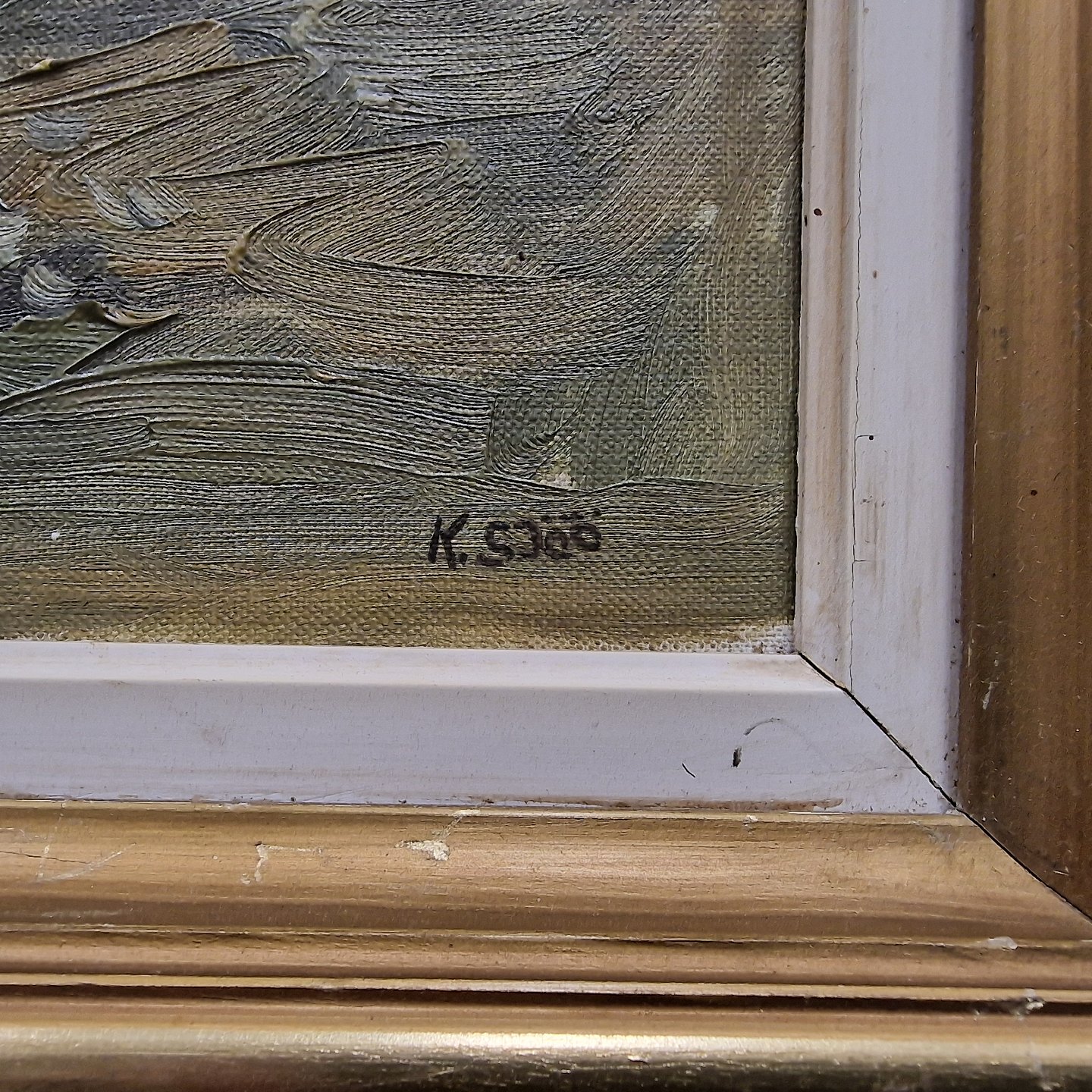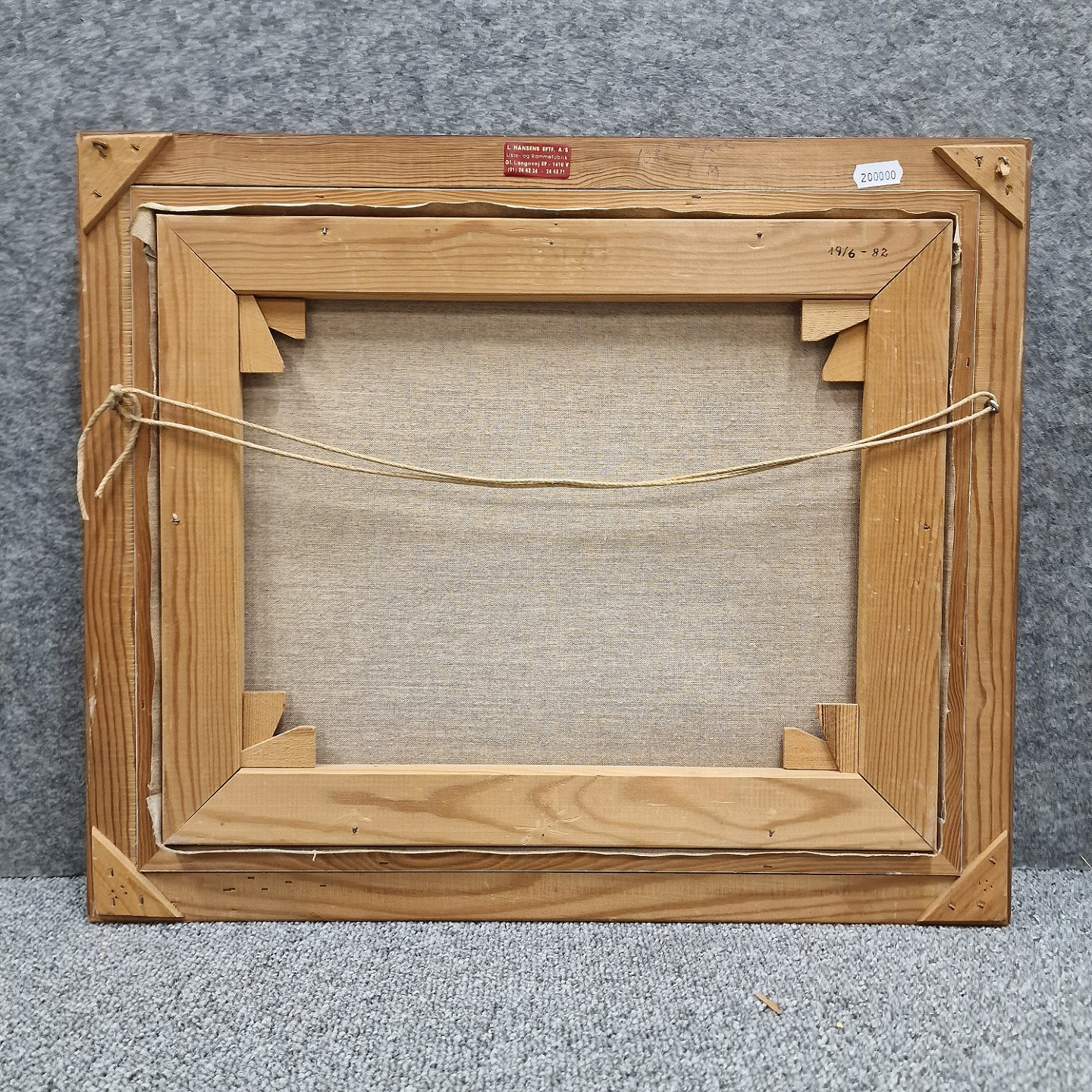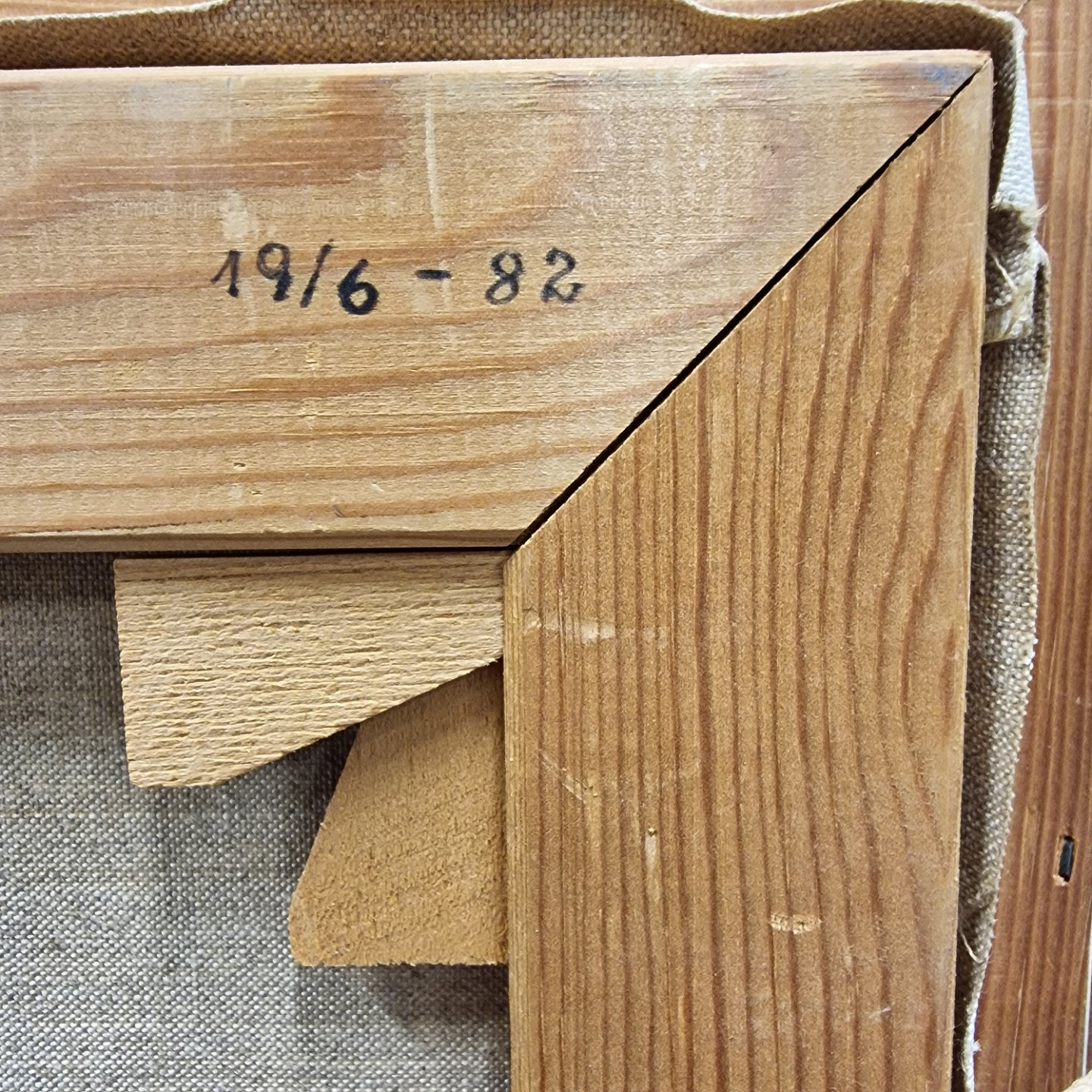 Oliemaleri på lærred. Landskabsmaleri med motiv af kampesten ved skov af birketræer Dateret 19/6-82