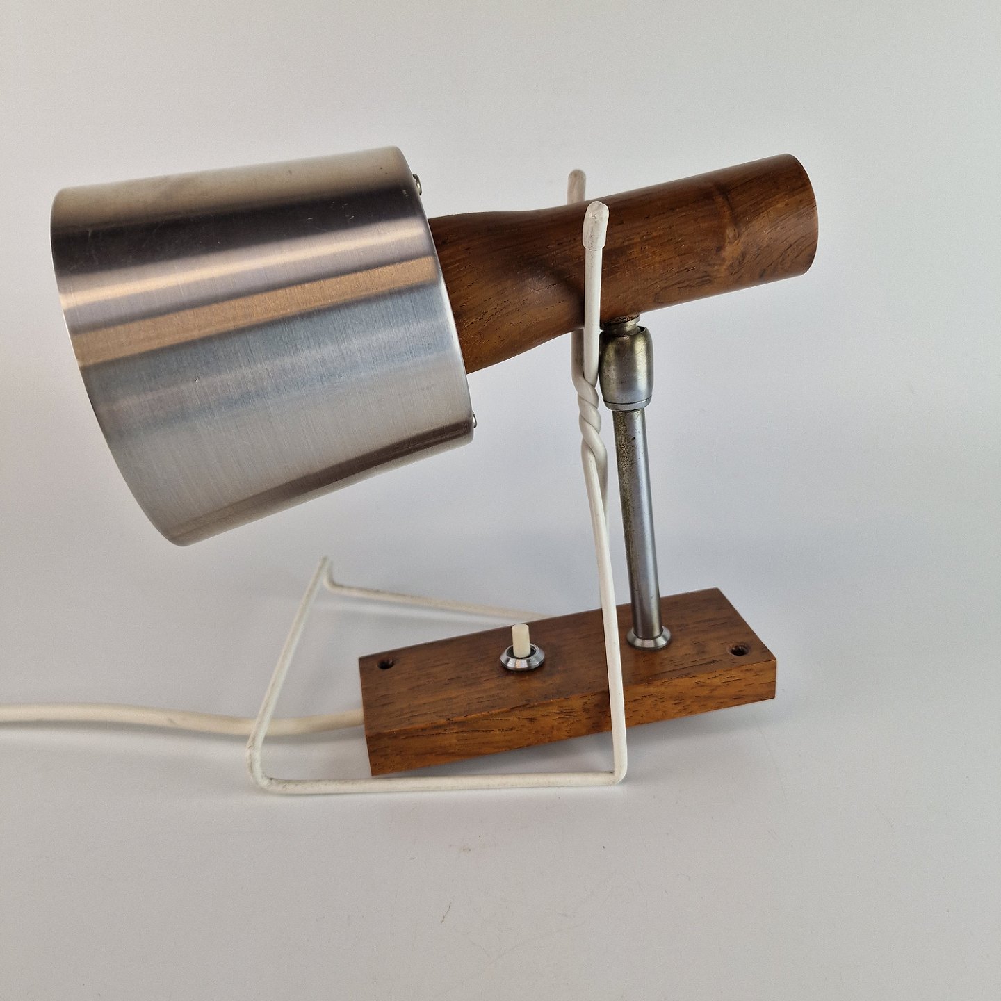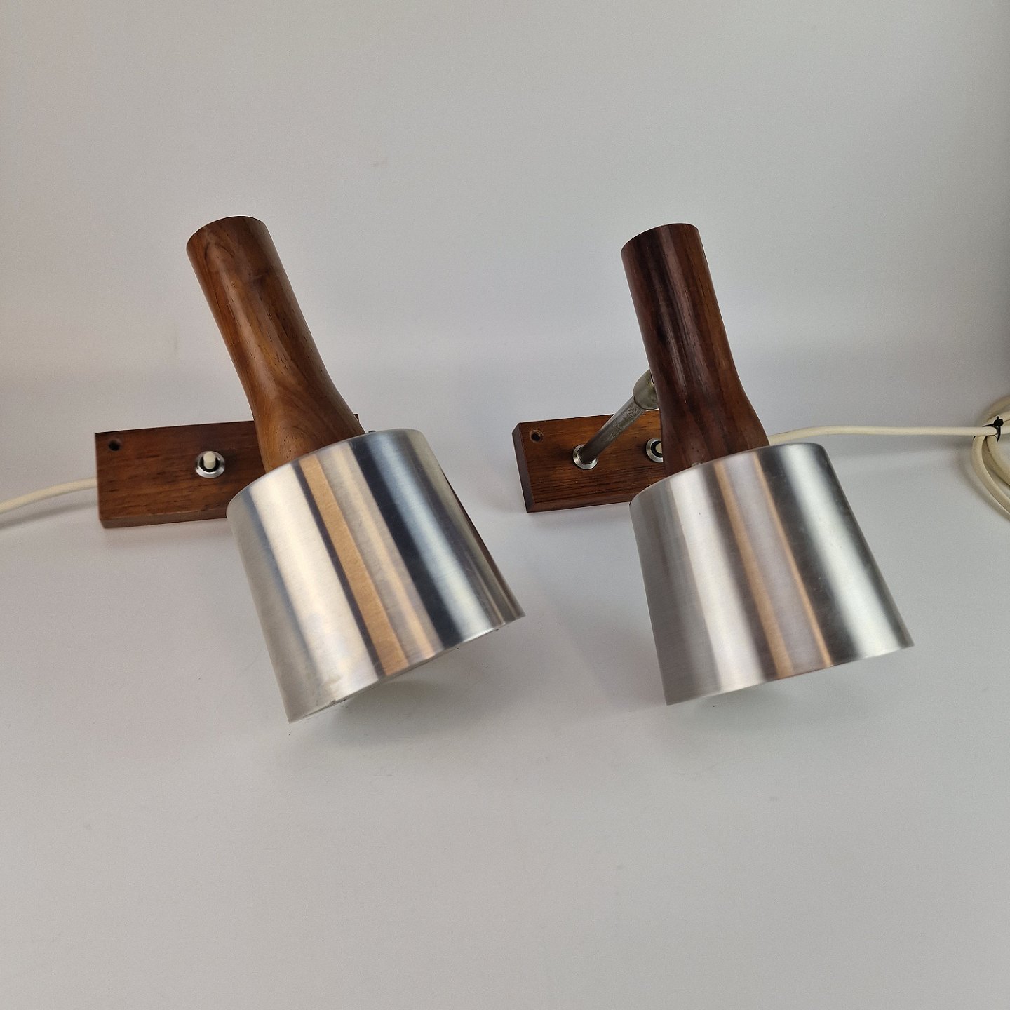 To væglamper med holder af palisander og skærm af aluminium. Kontakten er en trykknap. Prisen er for 2 styk