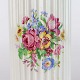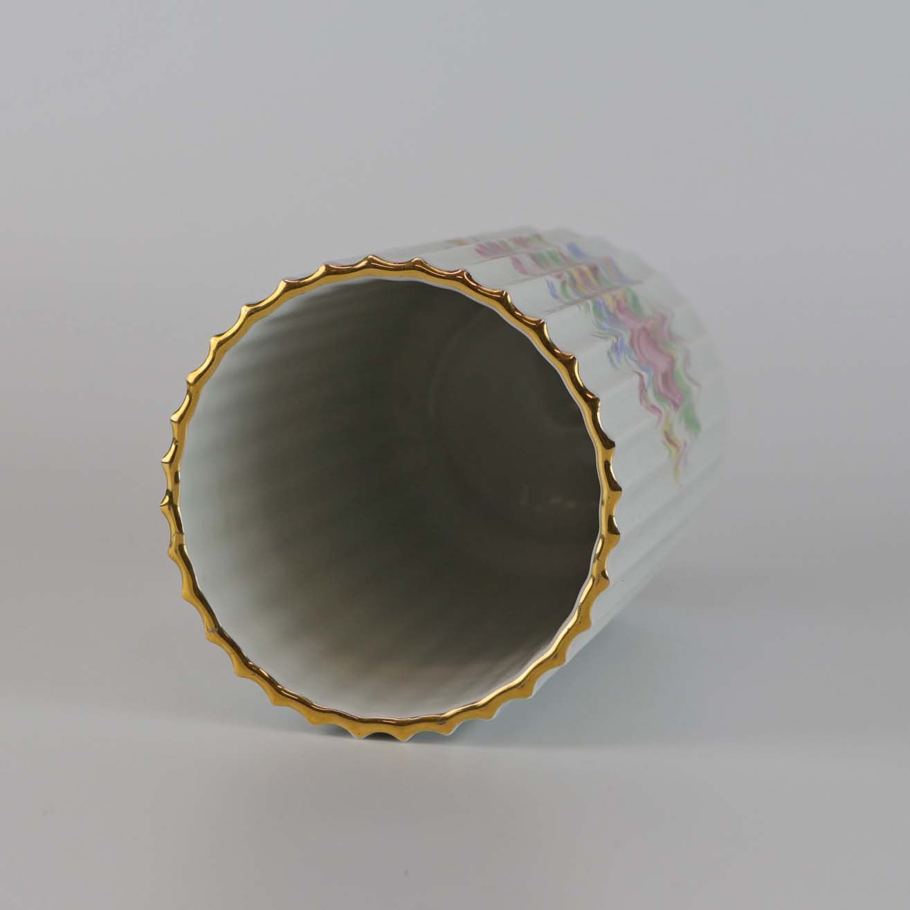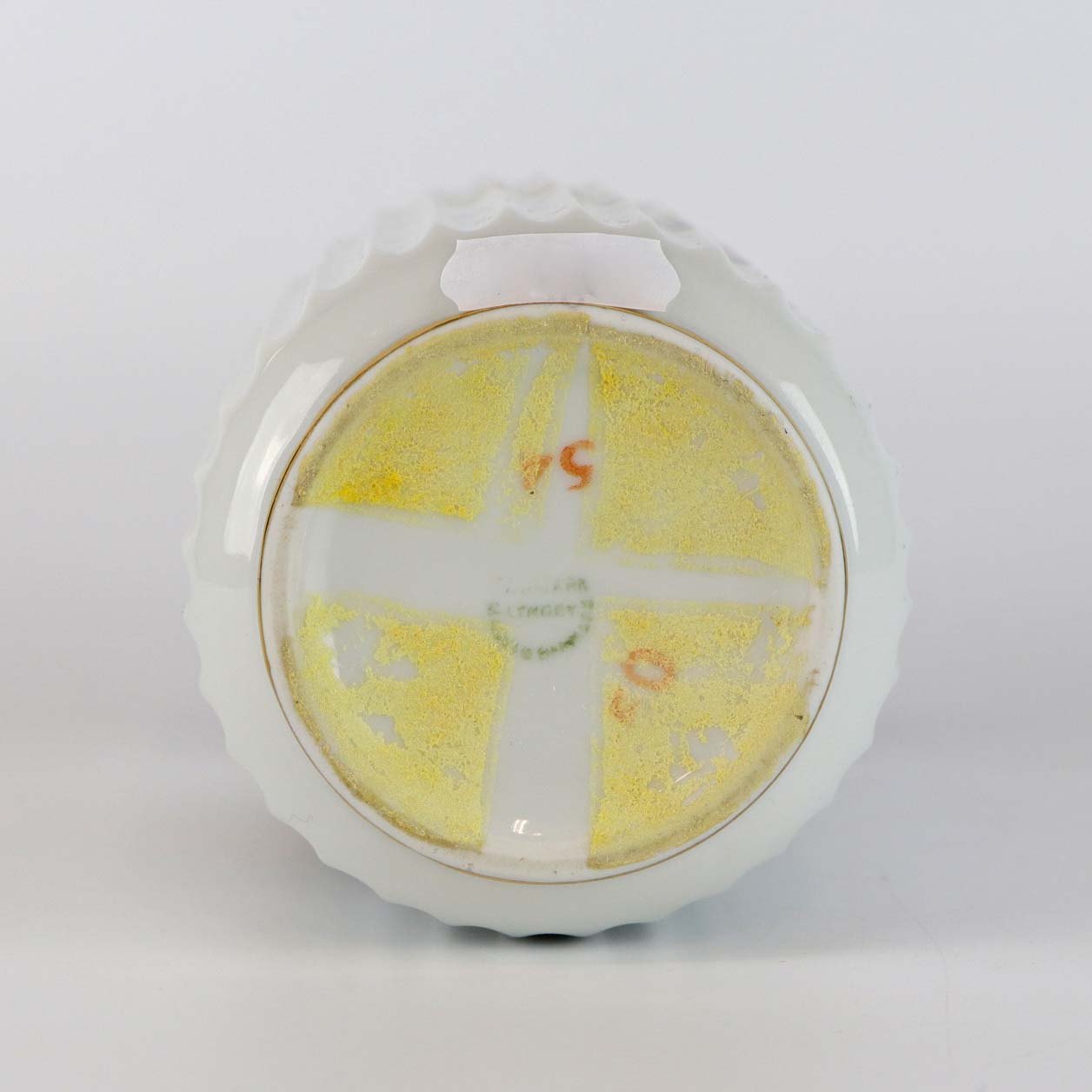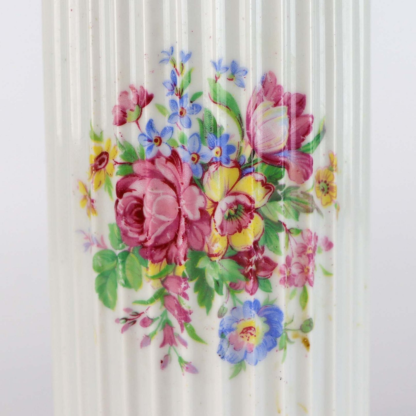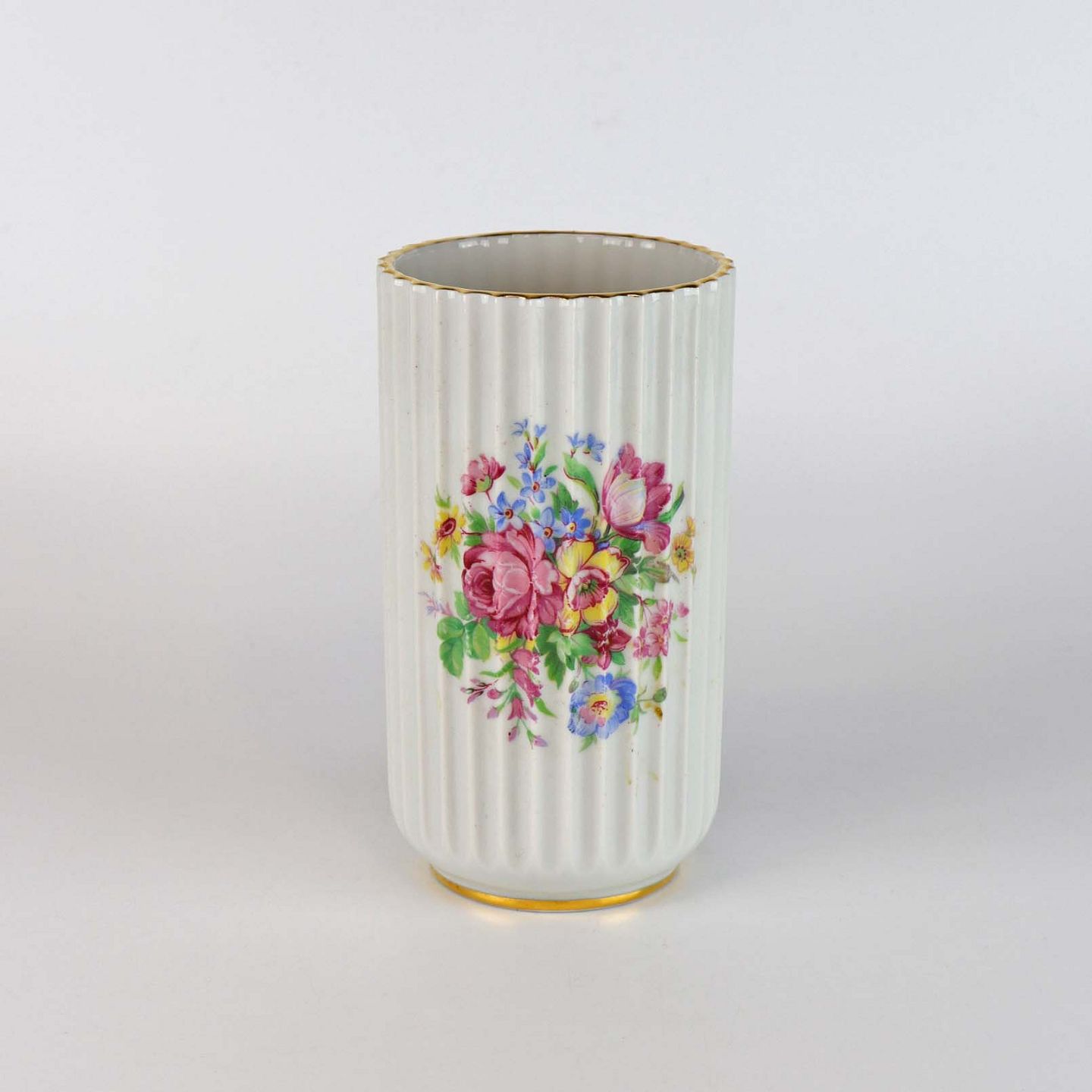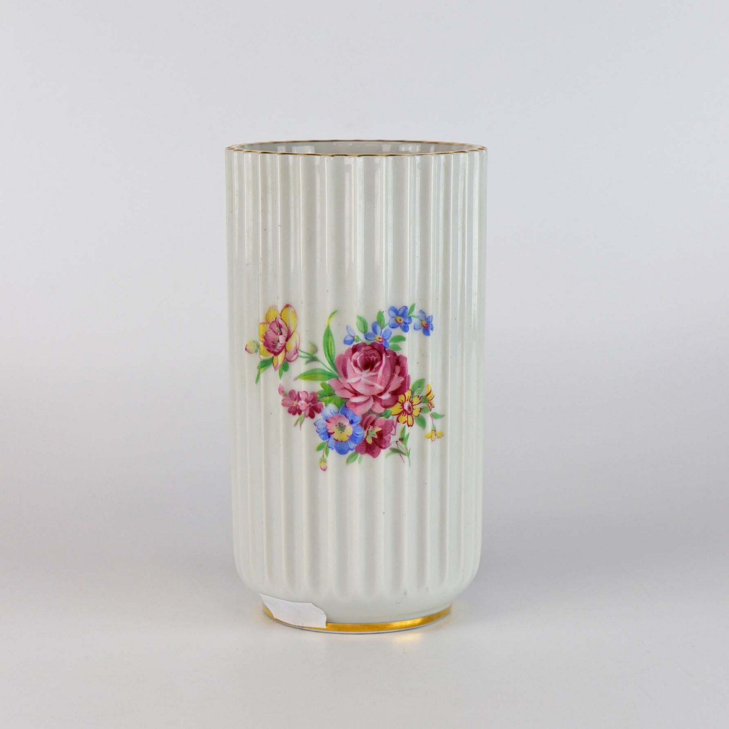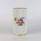 Hvid riflet vase med overført blomstermotiv og guldkant. Markedsført som Lyngby