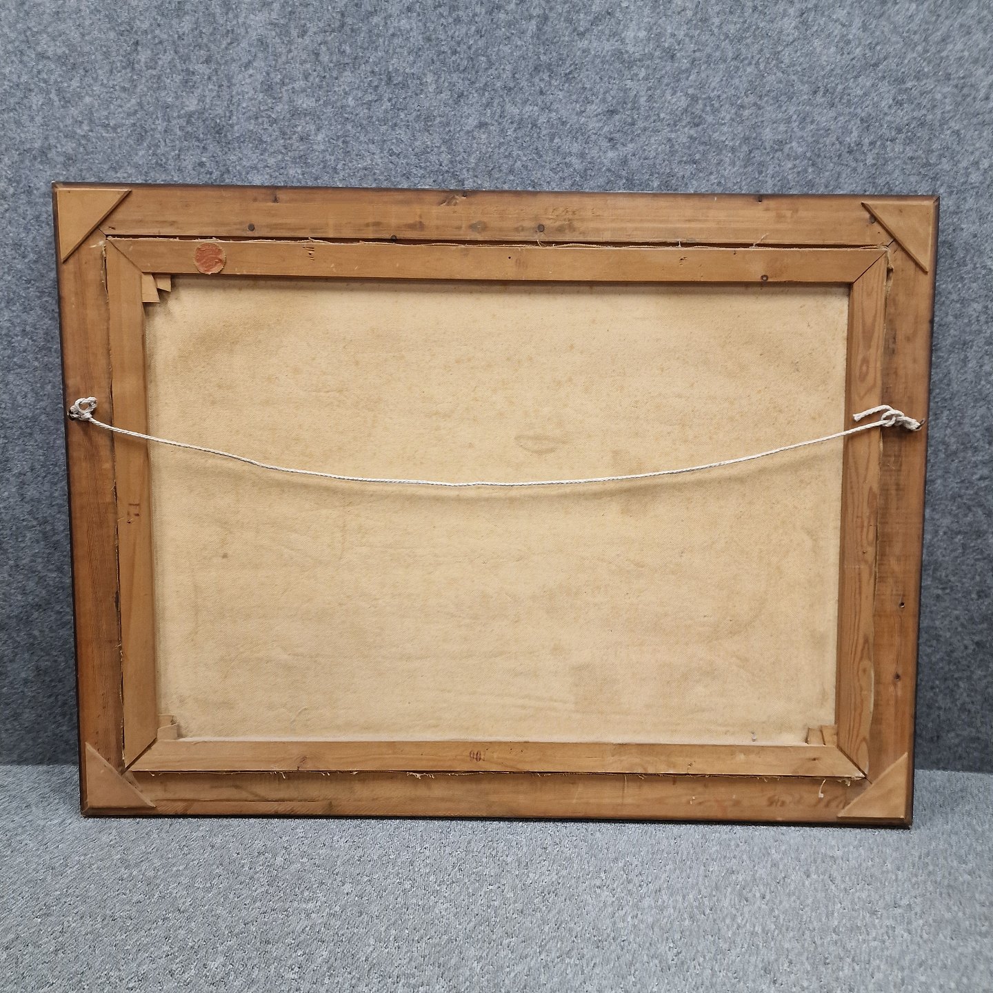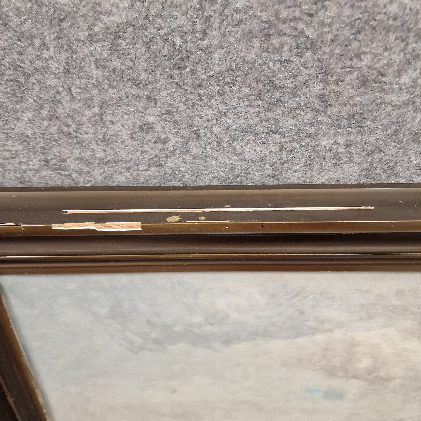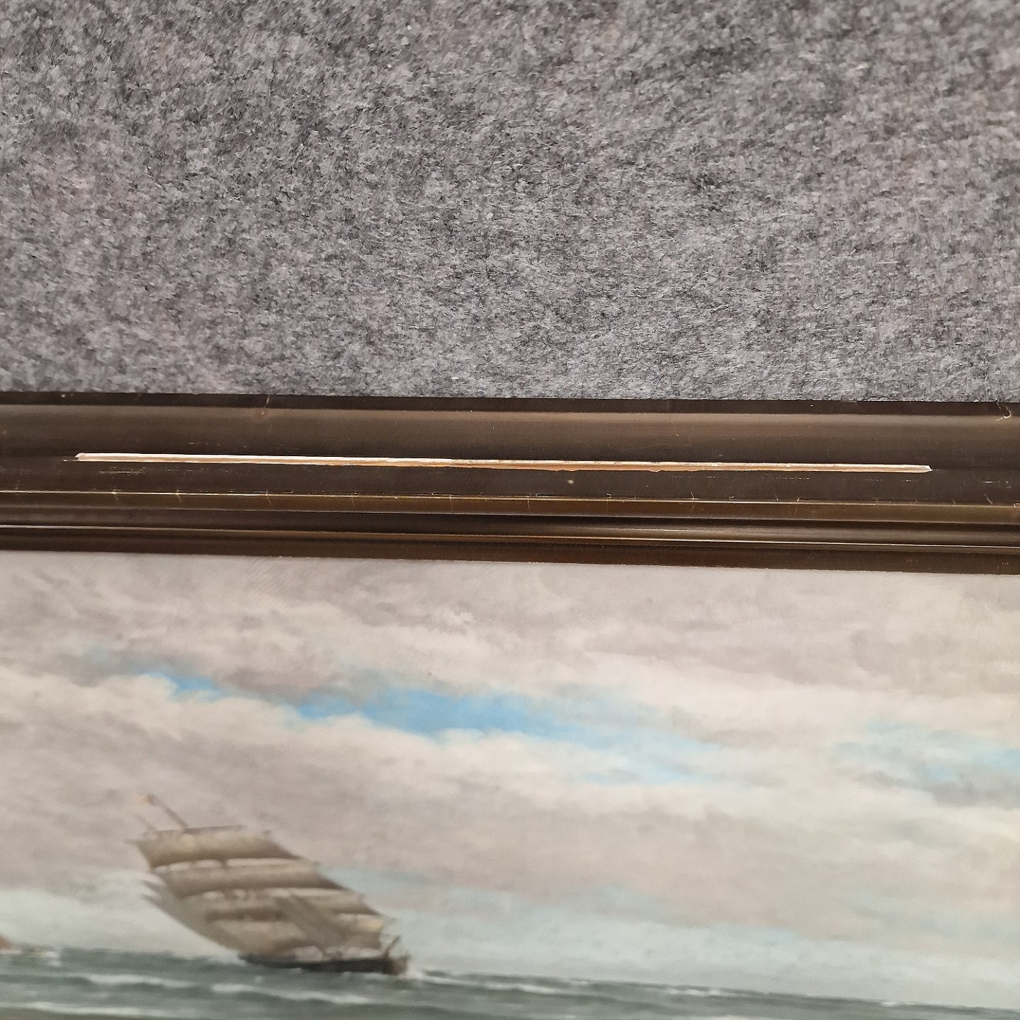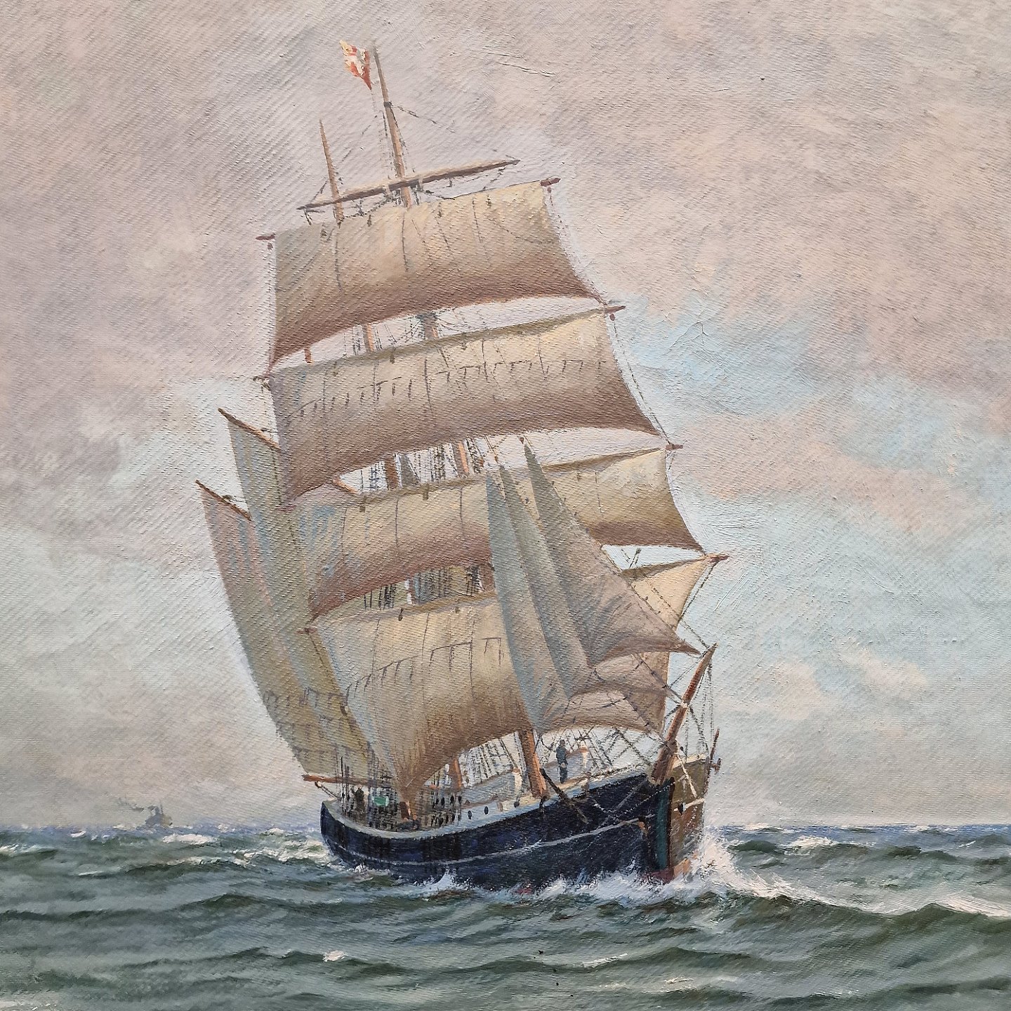 Oliemaleri på lærred. Skibsmaleri af tremastet skonnert og mindre sejlbåd på havet