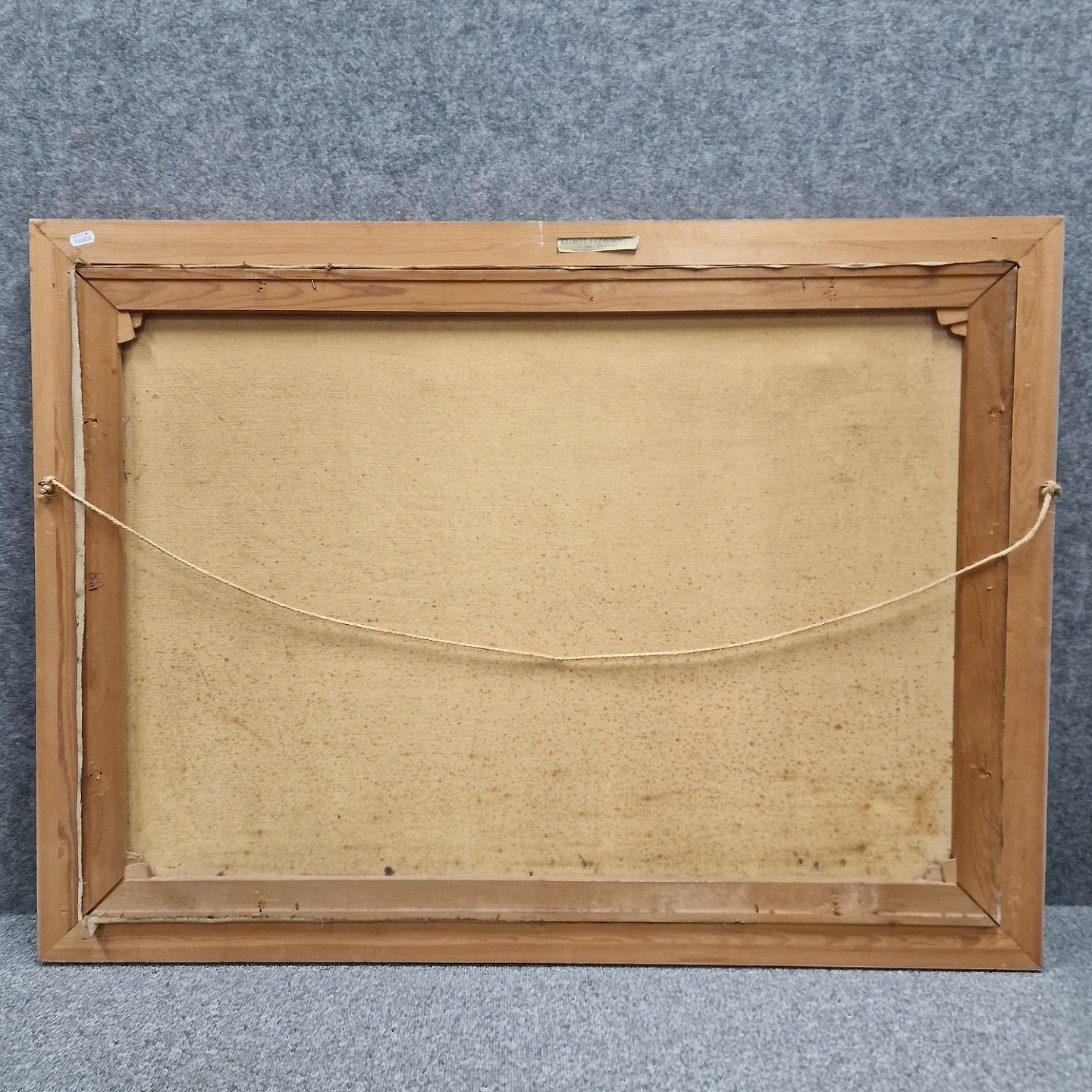 Oliemaleri på lærred i træramme. Bymaleri af marked på Østerågade i Aalborg. Til højre ses Jens Bangsbo stenhus