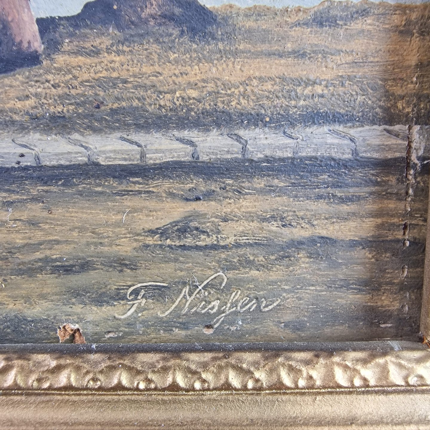 Maleri på plade med motiv af en kvinde og en mand med en sø. Dateret 28/3 1913. Titel " Am Mühlenteich" som er en sø i tyske Bredstedt