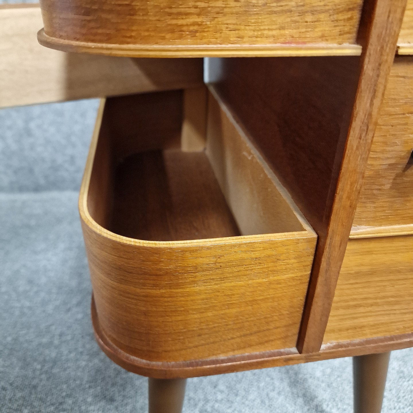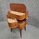 Sybord af teaktræ. Bordet har mange opbevaringsrum, nogle med skillevægge i, og håndtag så bordet nemt kan flyttes