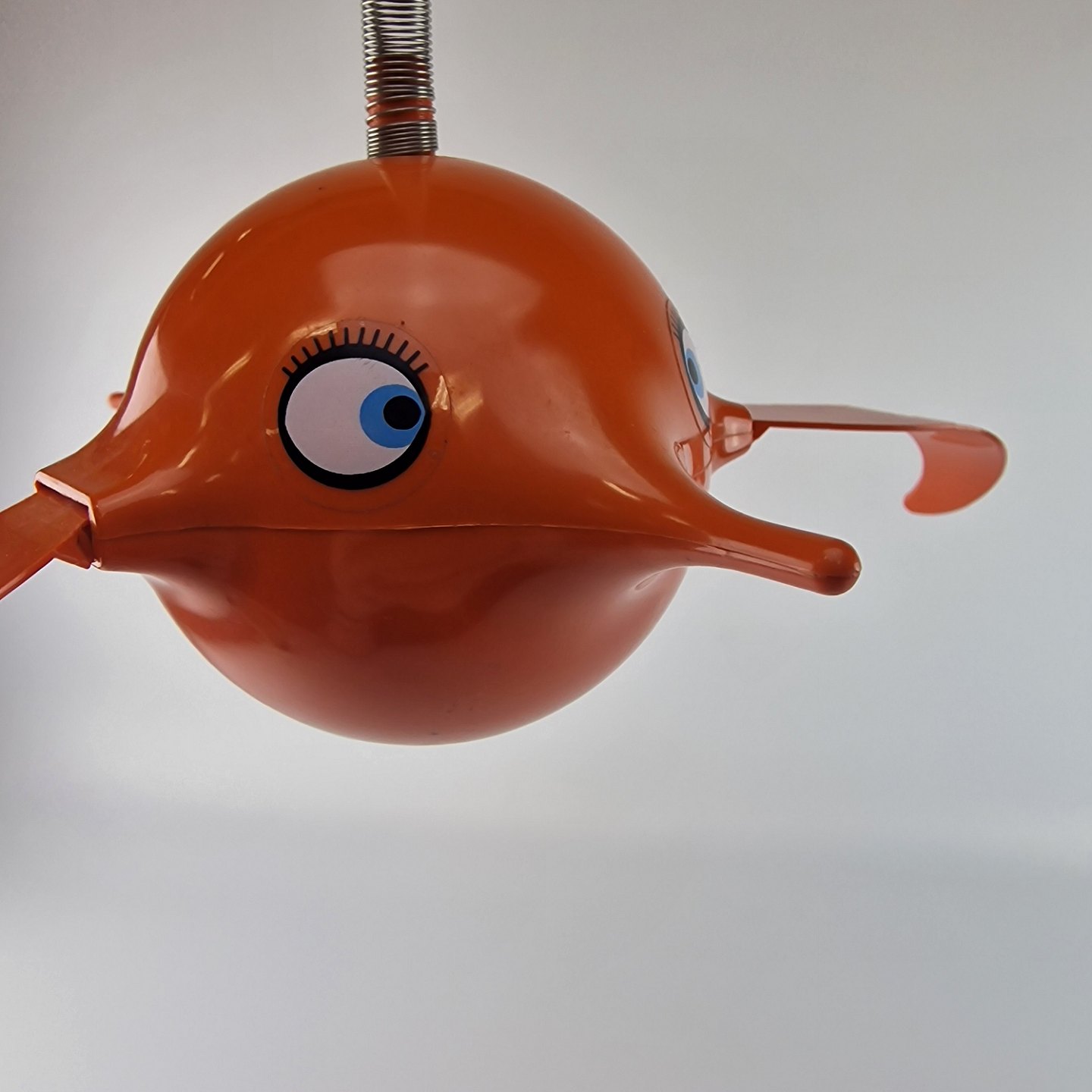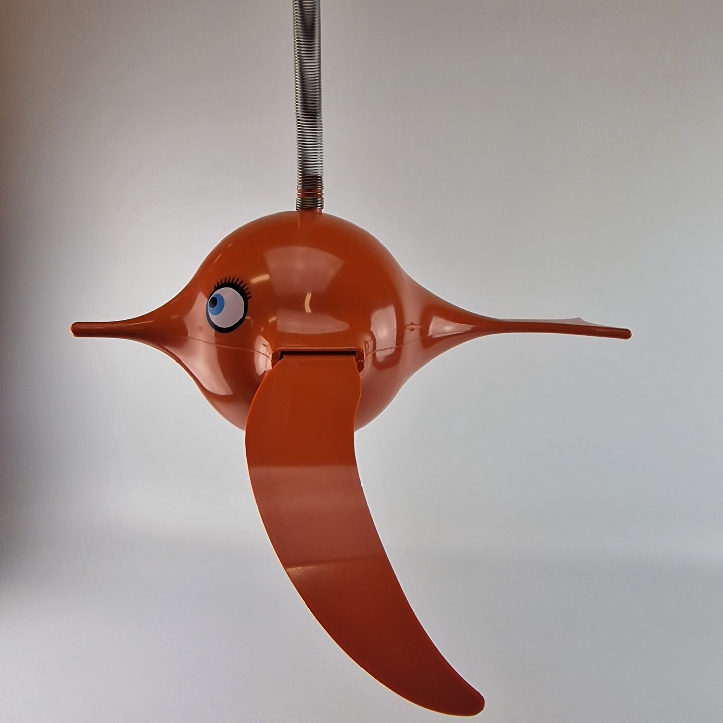 Vintage Hoptimist uro model Busy Birdie i rød plast med metal ophæng