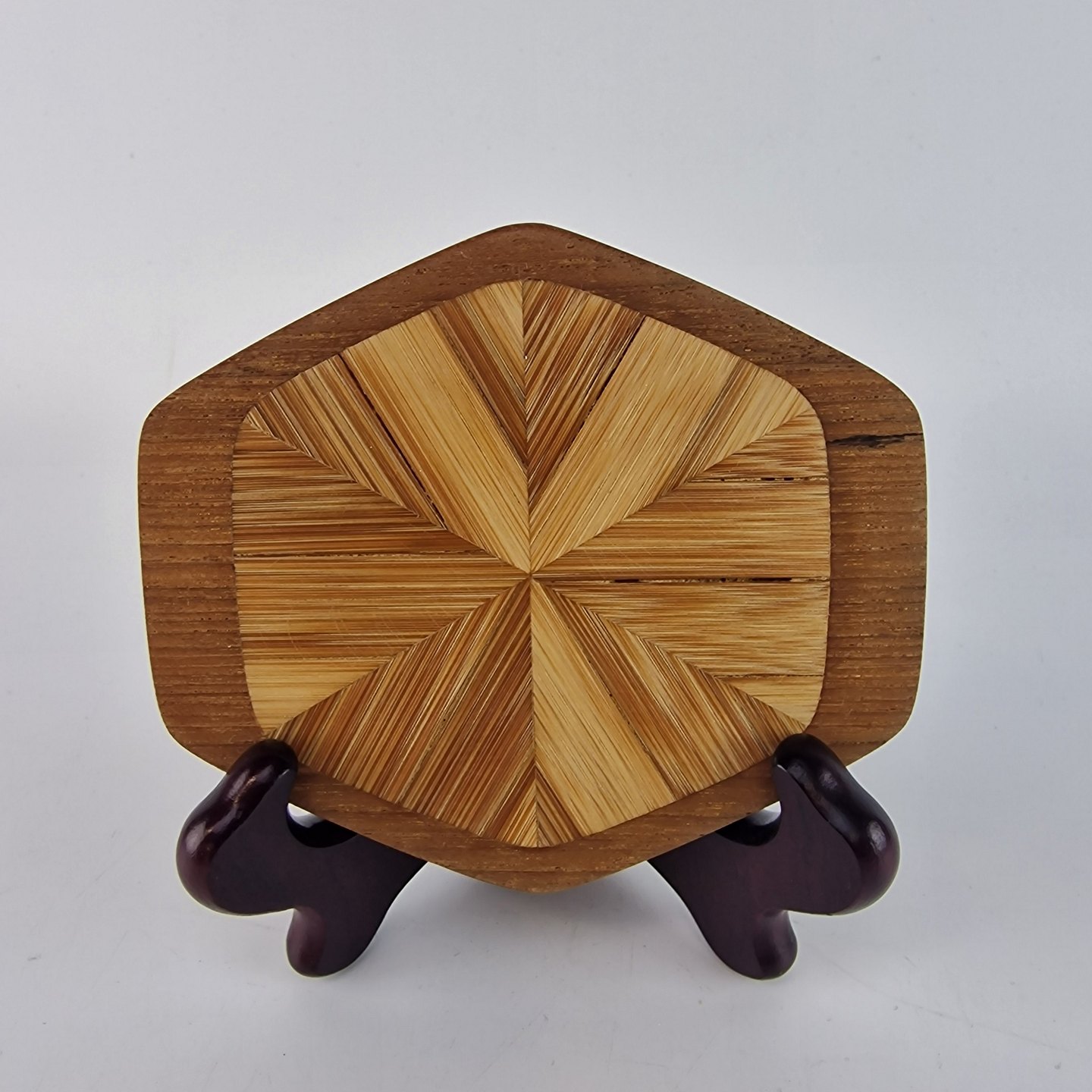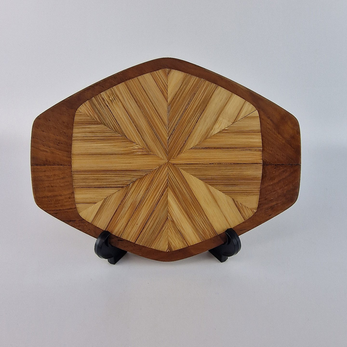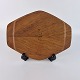 Sekskantet fade og bordskånere af teaktræ og bambus