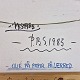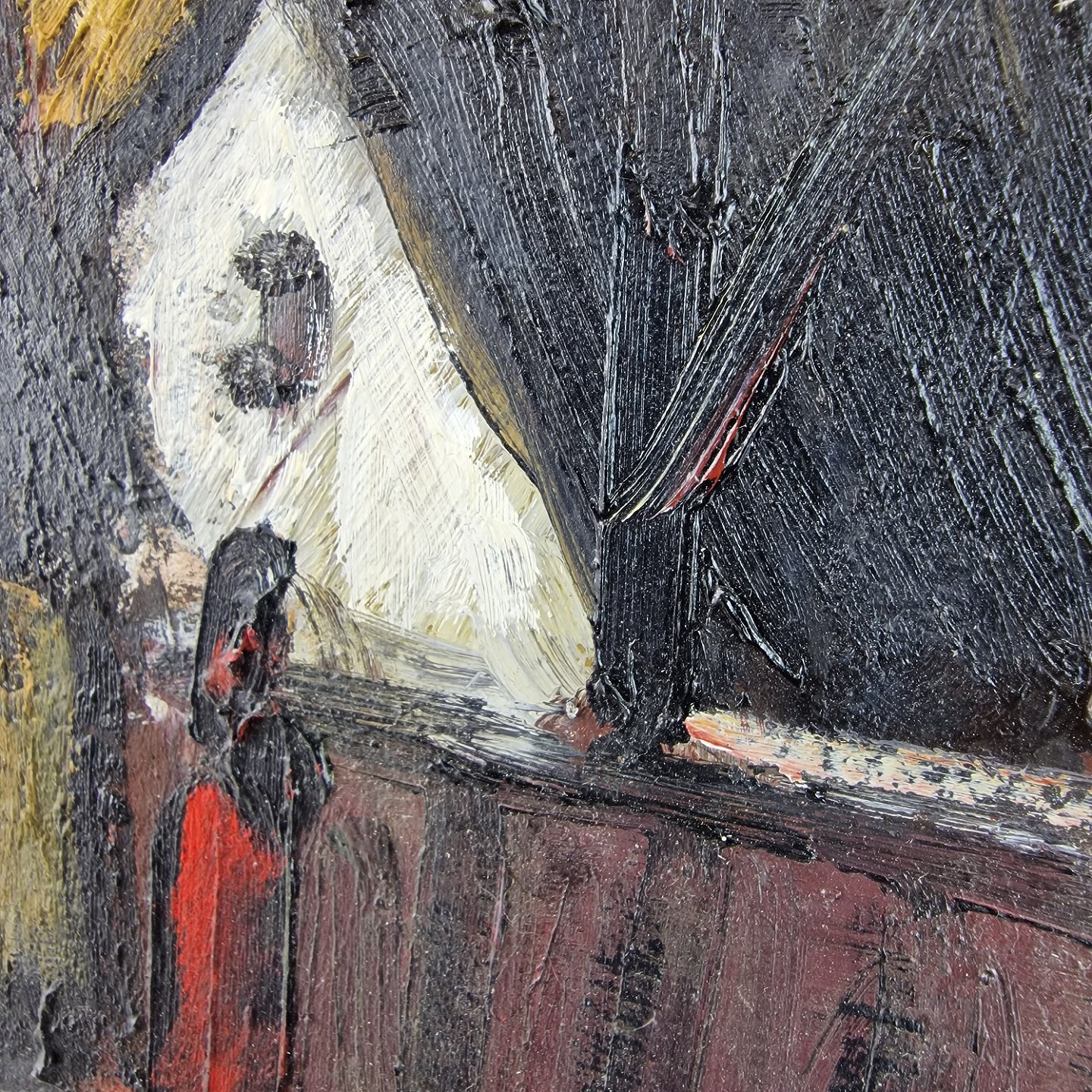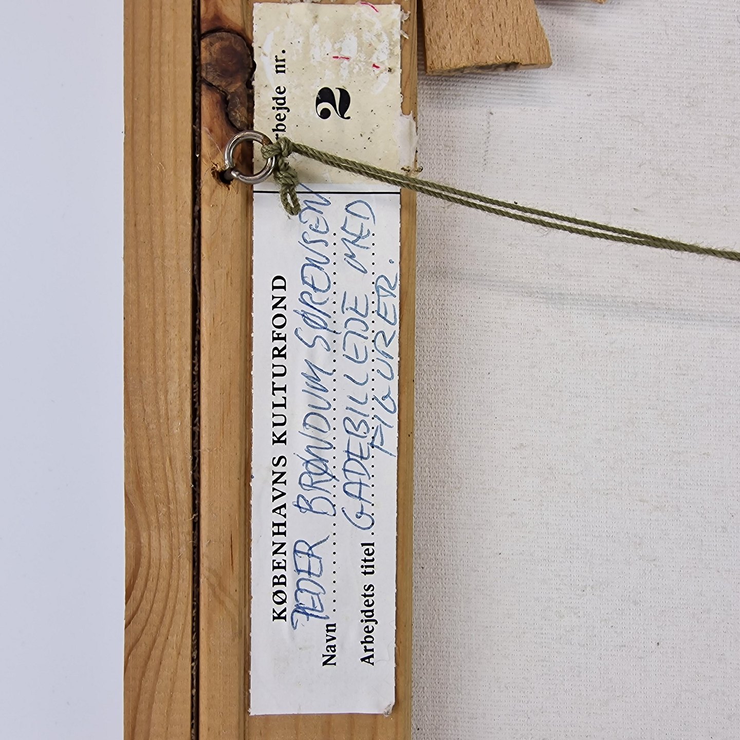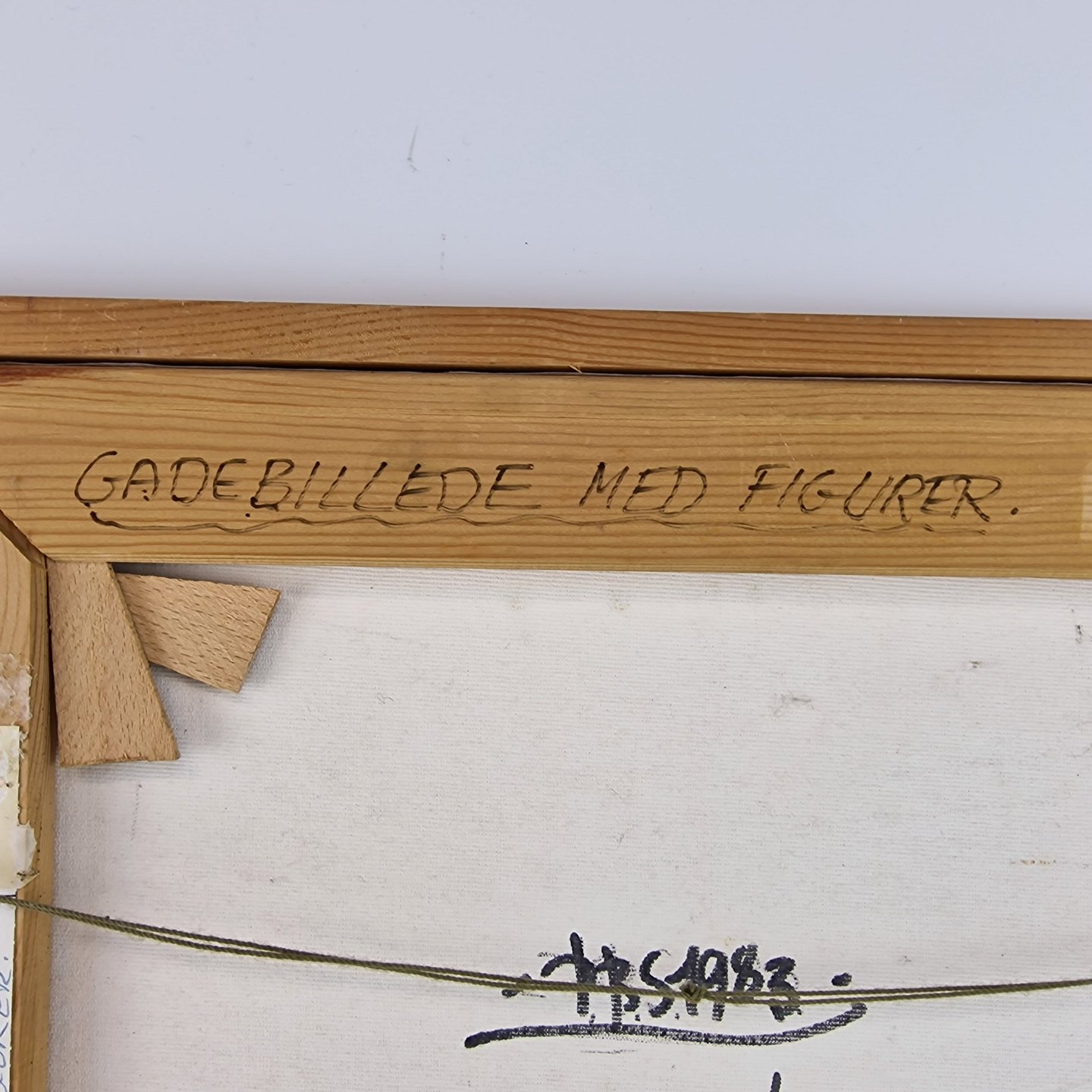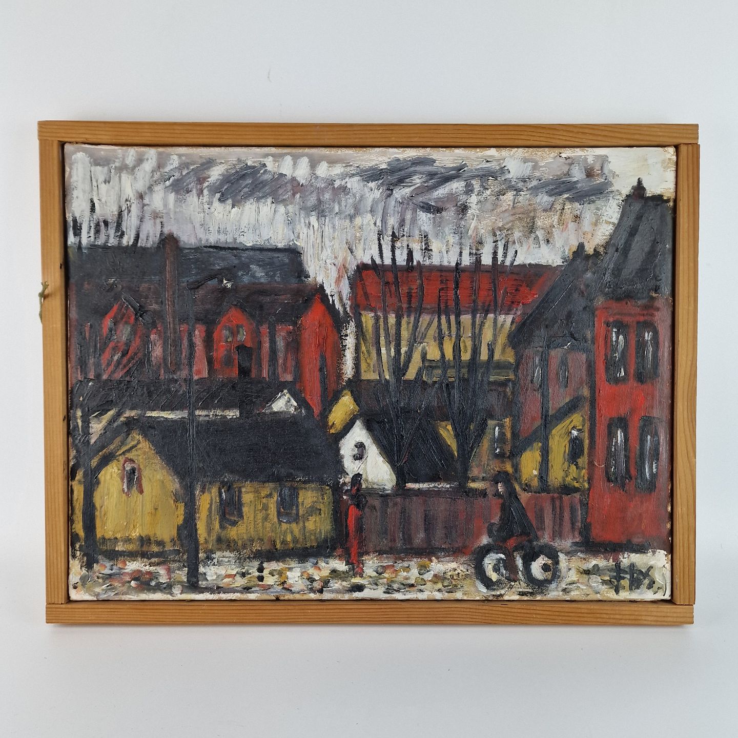 Maleri på lærred med motiv af en gade med en cyklist. I baggrunden ses forskellige huse. Dateret 1983