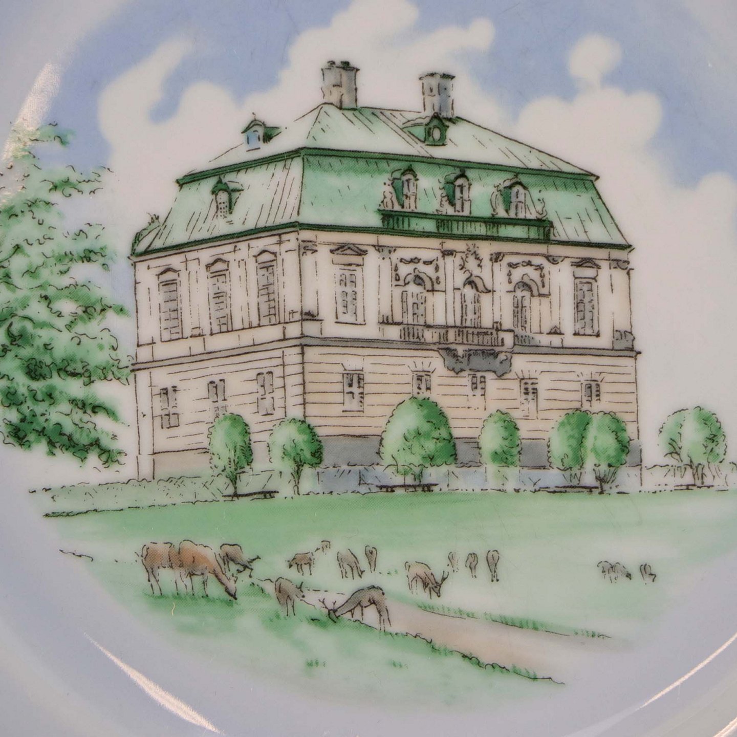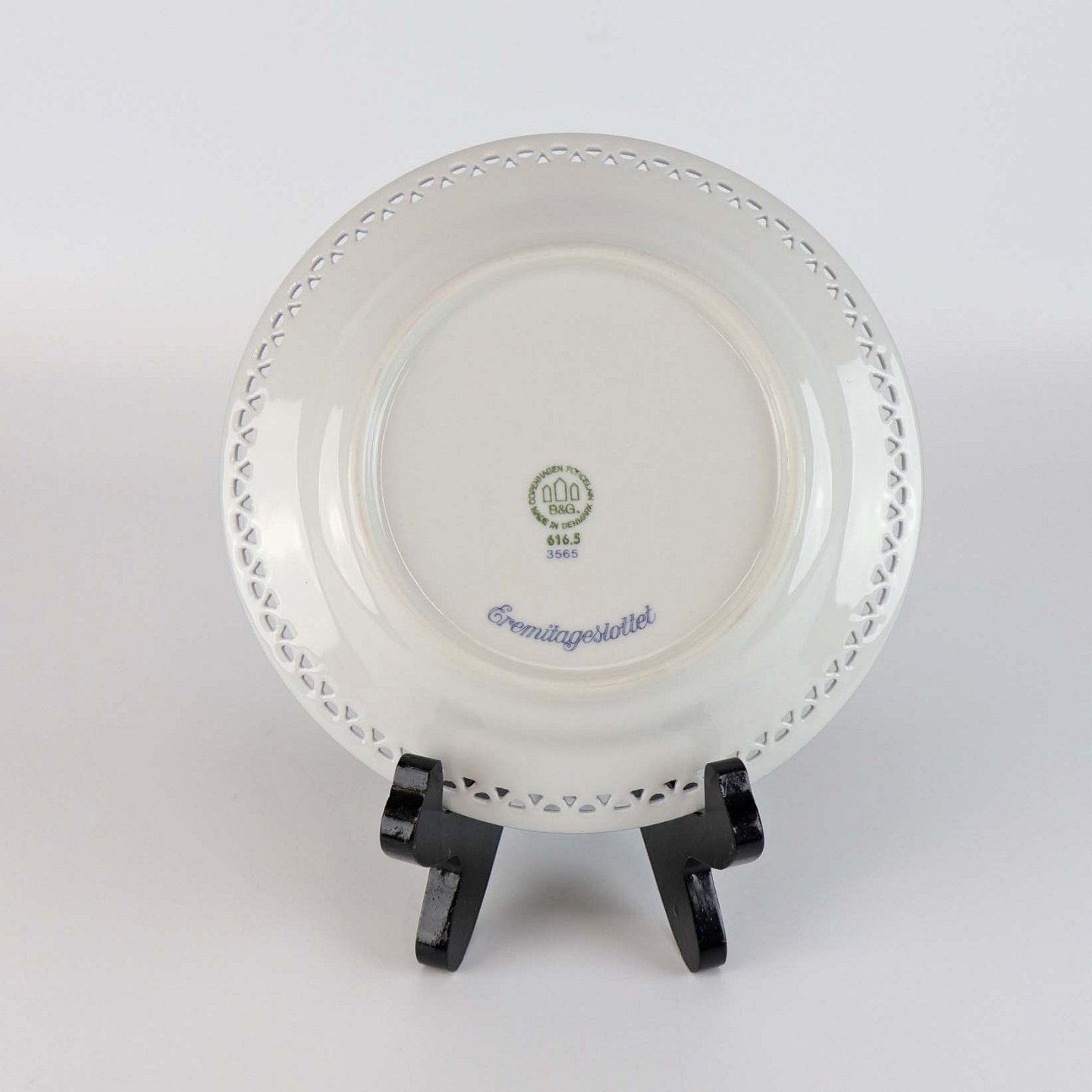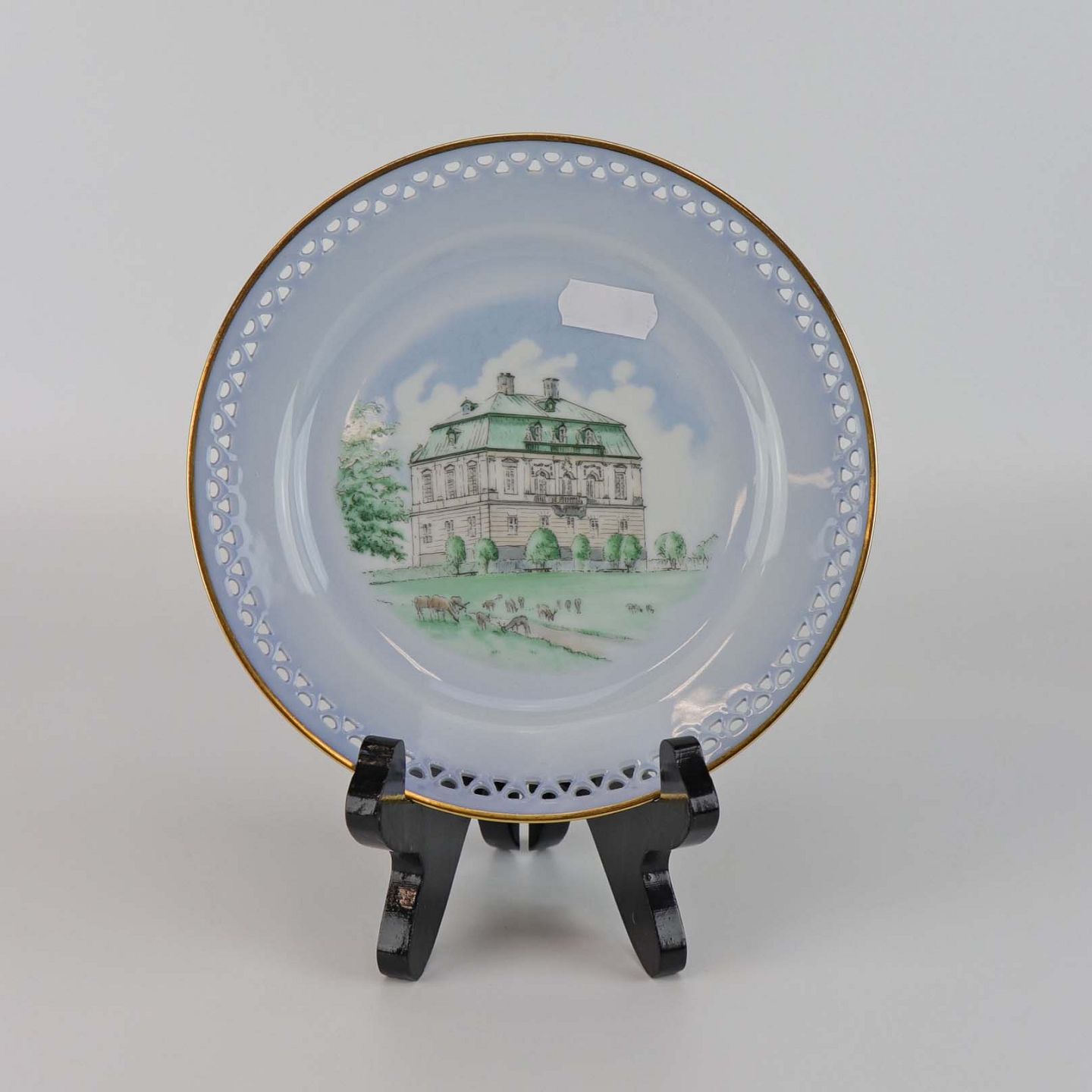 Dessert tallerkne i porcelæn med gylden perforeret kant med motiv af Eremitageslottet.