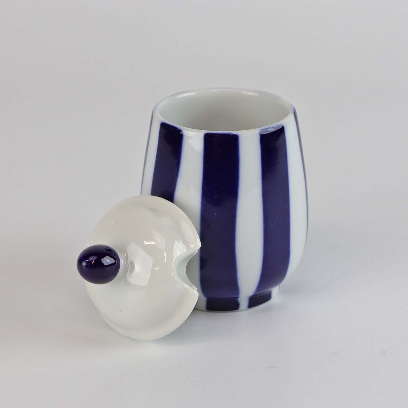 Lille sennepskrukke med låg i porcelæn fra stellet blå striber