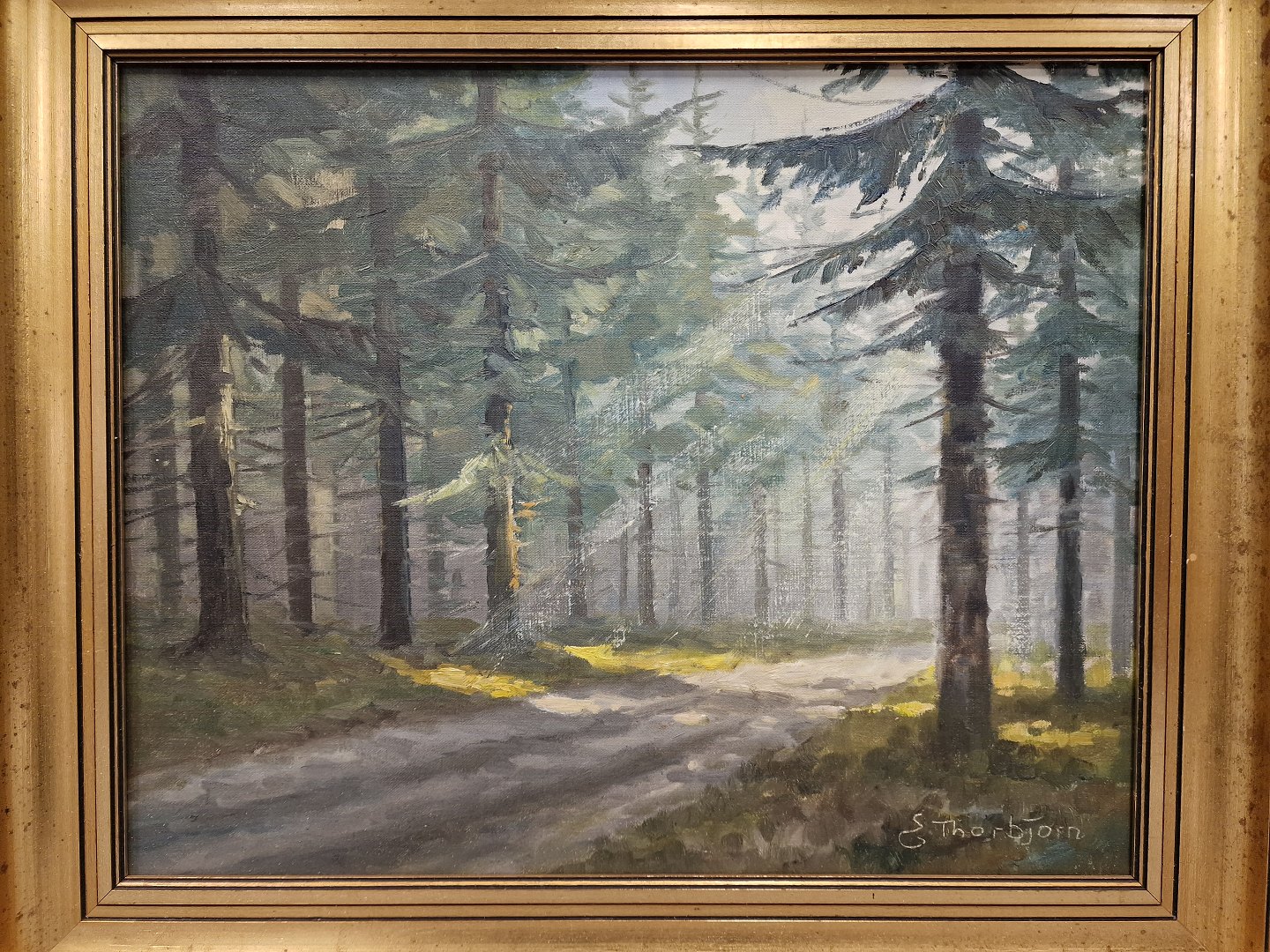 Natur maleri på lærred, med motiv af en skovvej med træer på begge sider. Sandsynligvis Rold skov