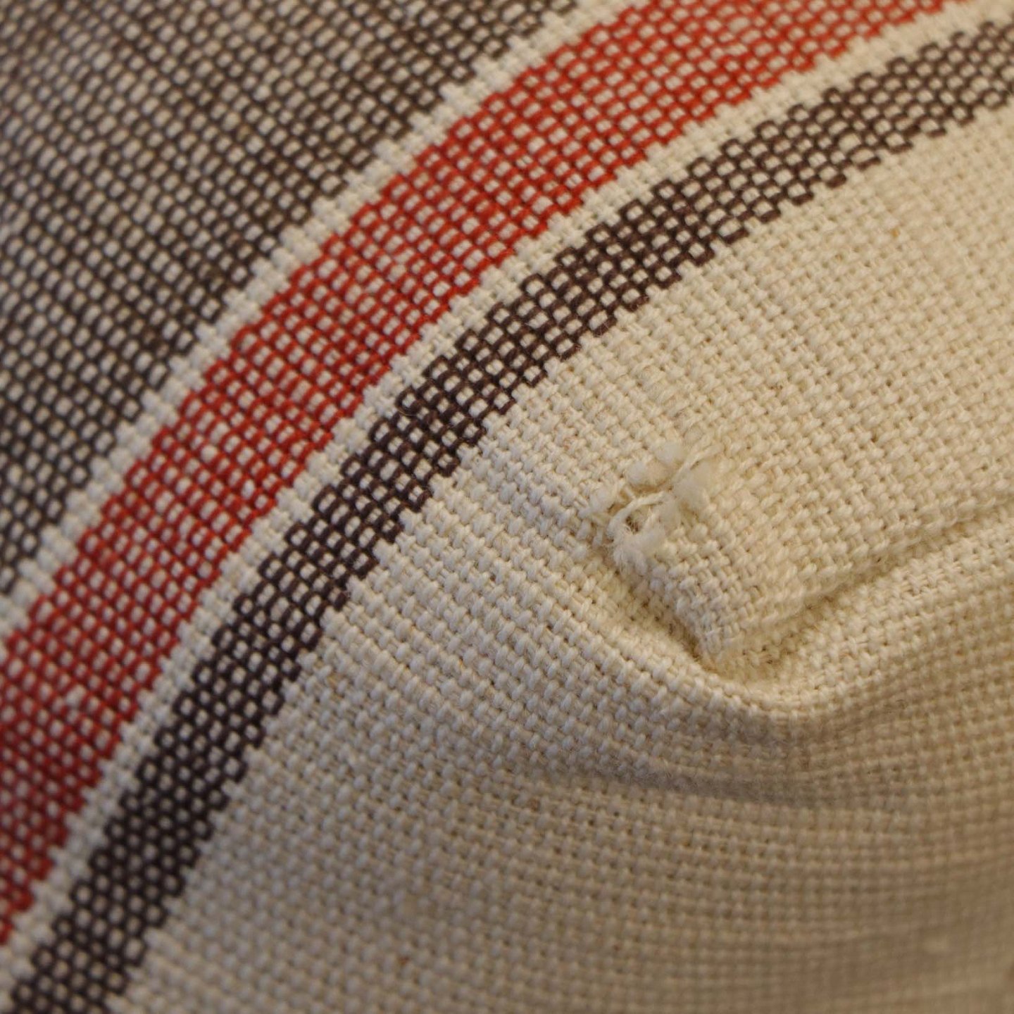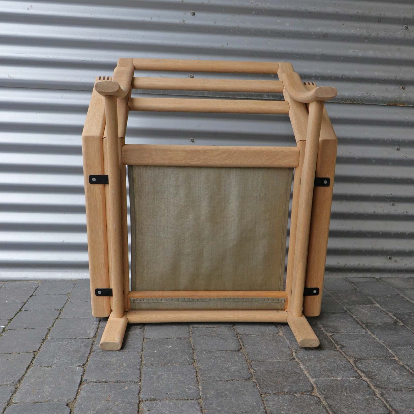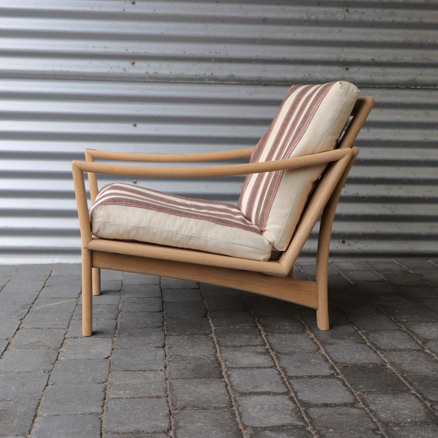 Lænestol i lyst egetræ. De løse hynder er betrukket med brun- og rødstibet linnedstof på råhvid baggrund