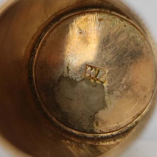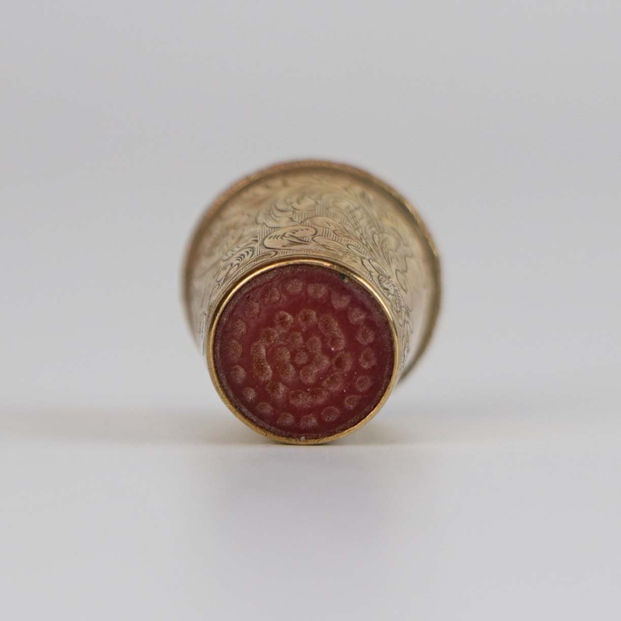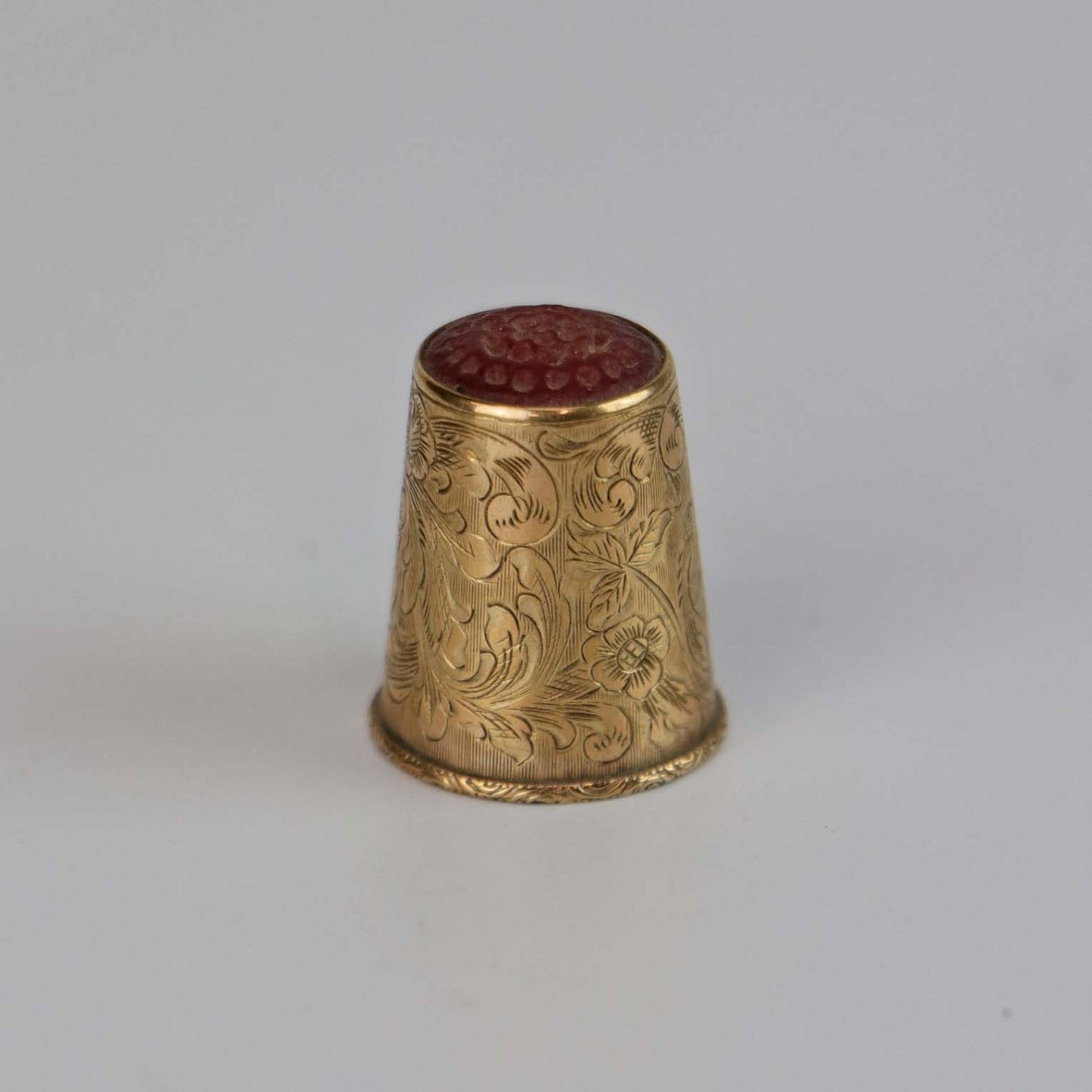 Fingerbøl i guldbelagt sølv med motiv af blomster, ranker og rød spids