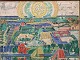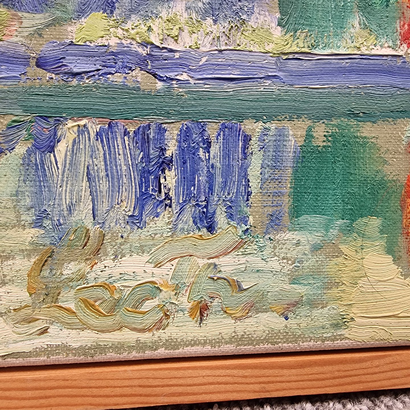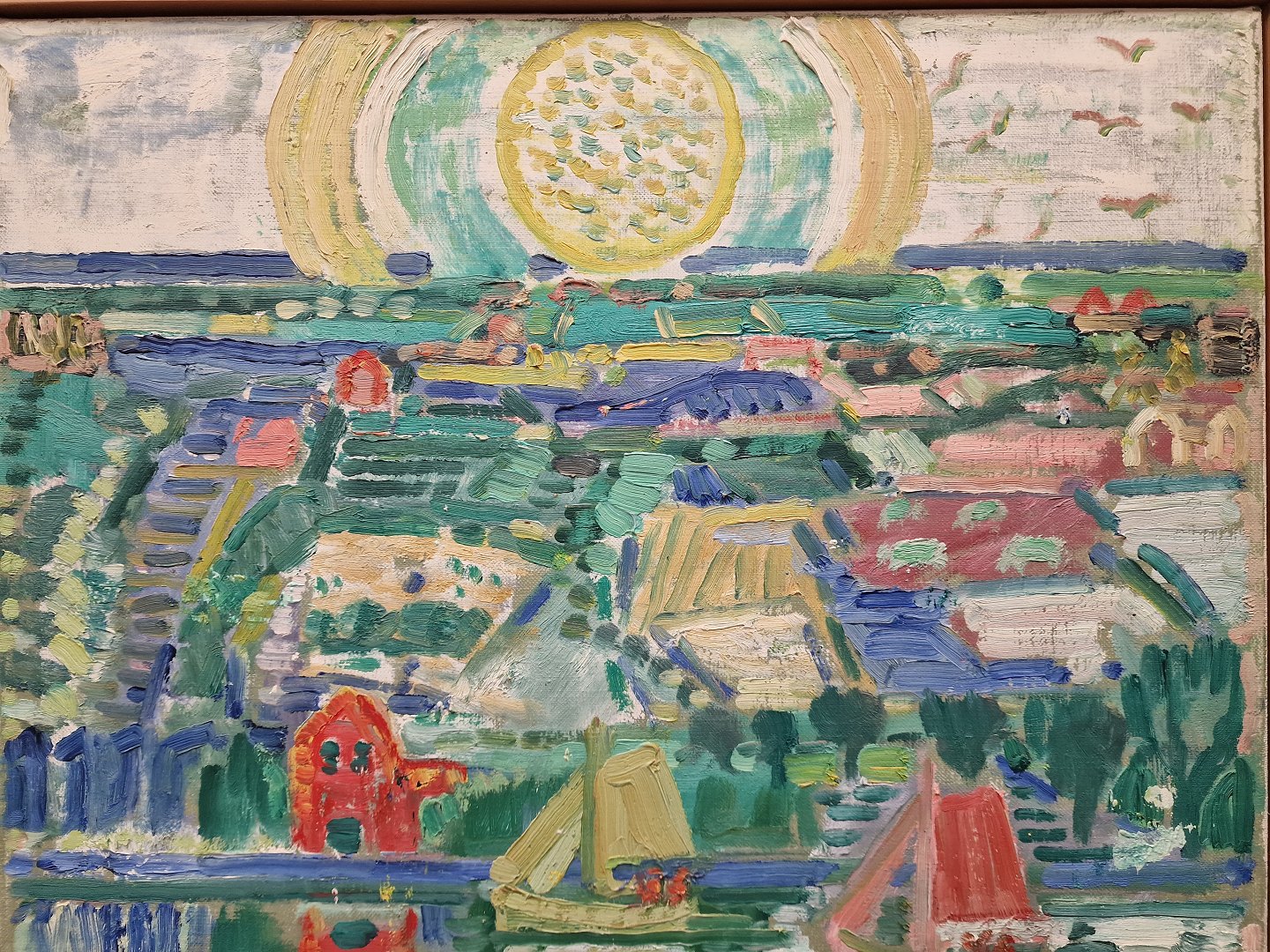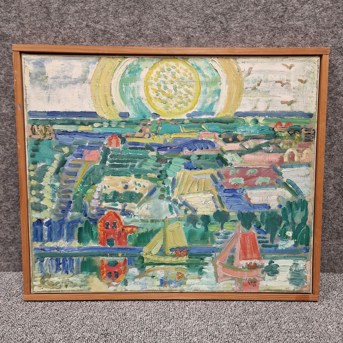 Landskabs maleri på lærred, med motiv af by, vand, skibe og sol. Skitse - udkast til større billede