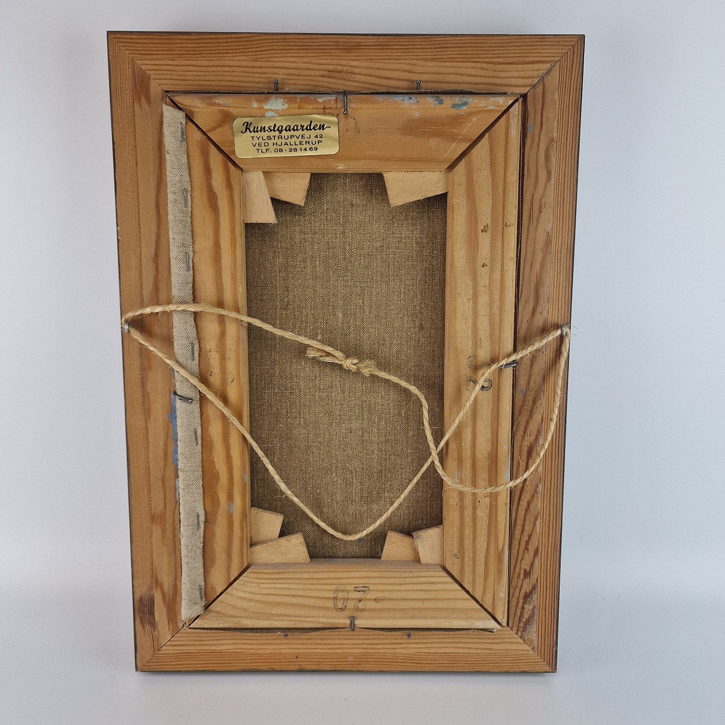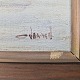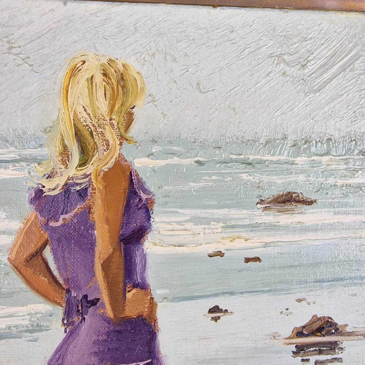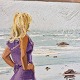 Maleri med oliemaling på lærred. Billedet forestiller kvinde i lilla kjole i vandkanten på en strand