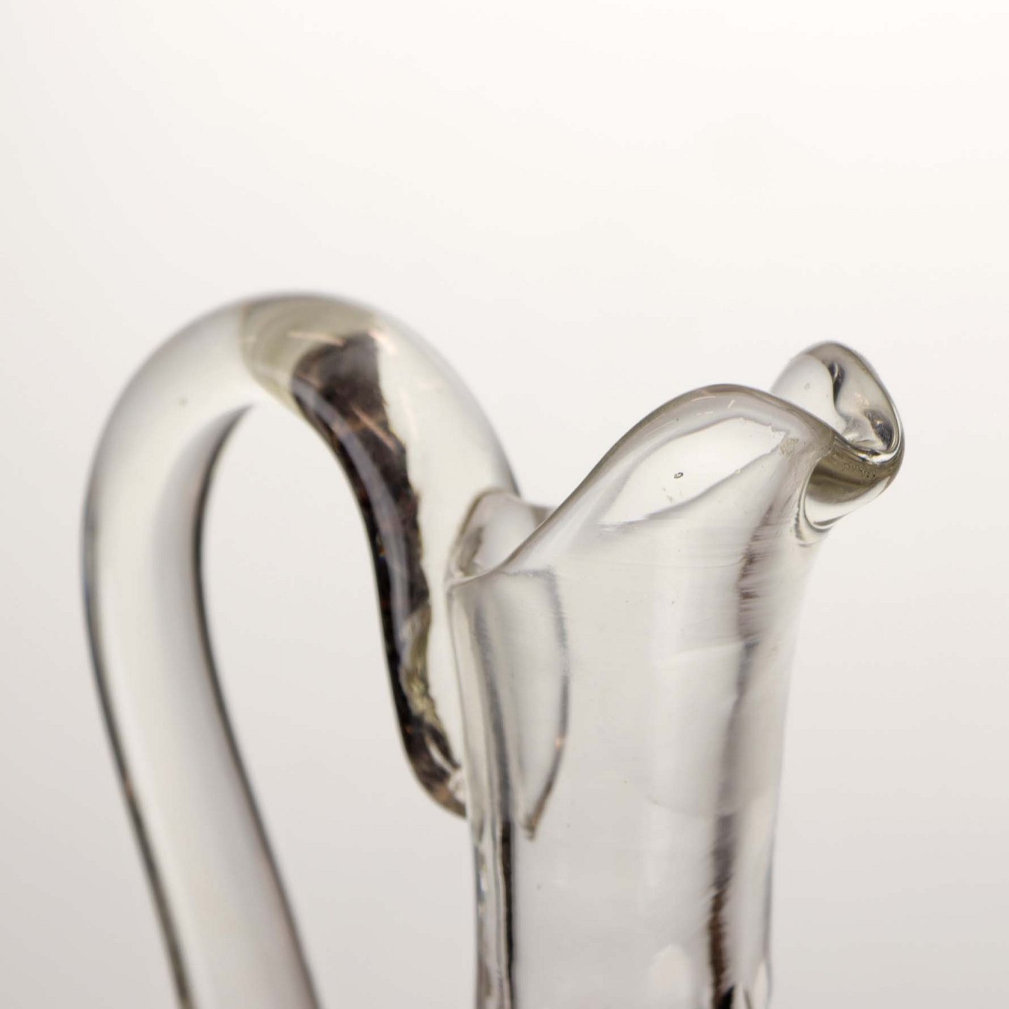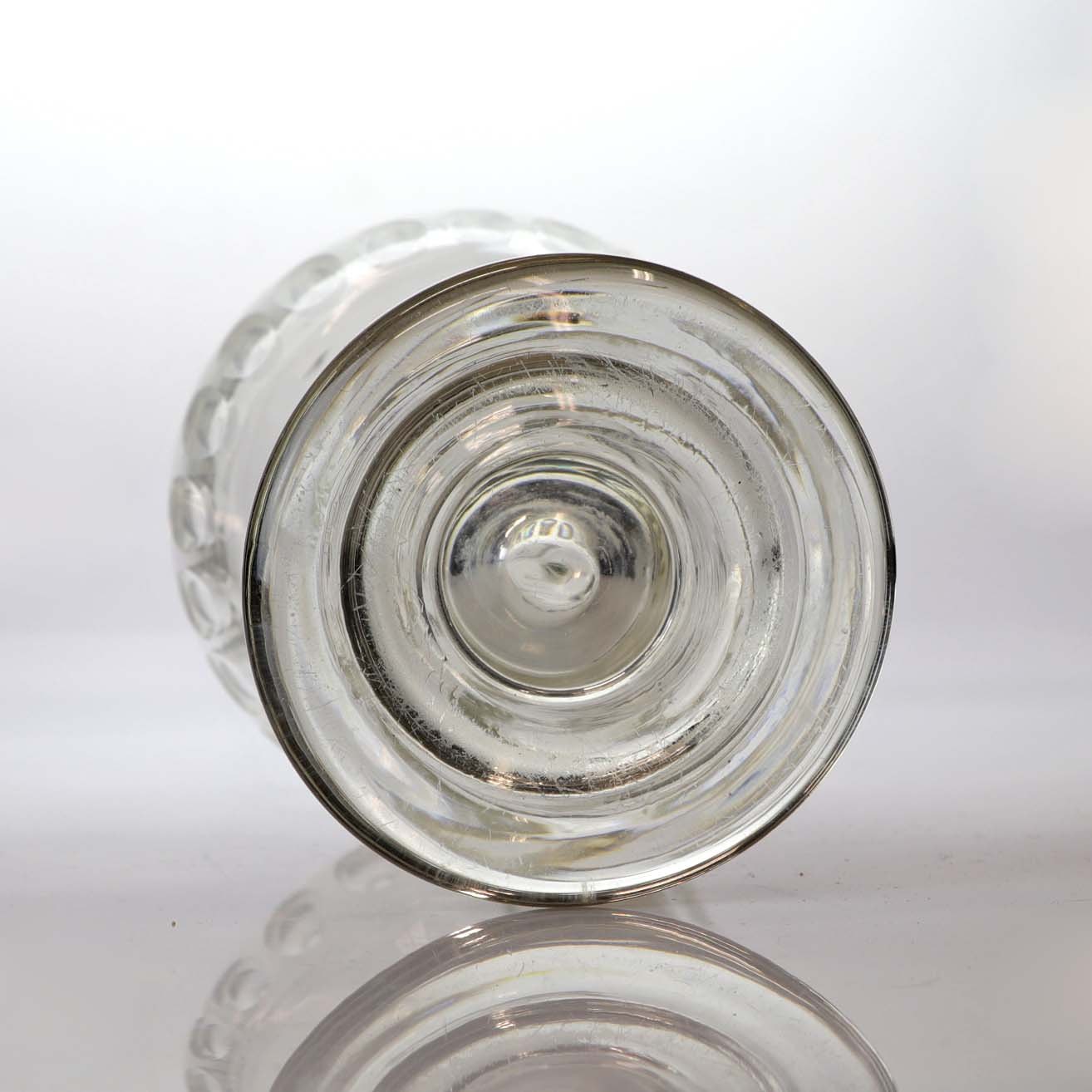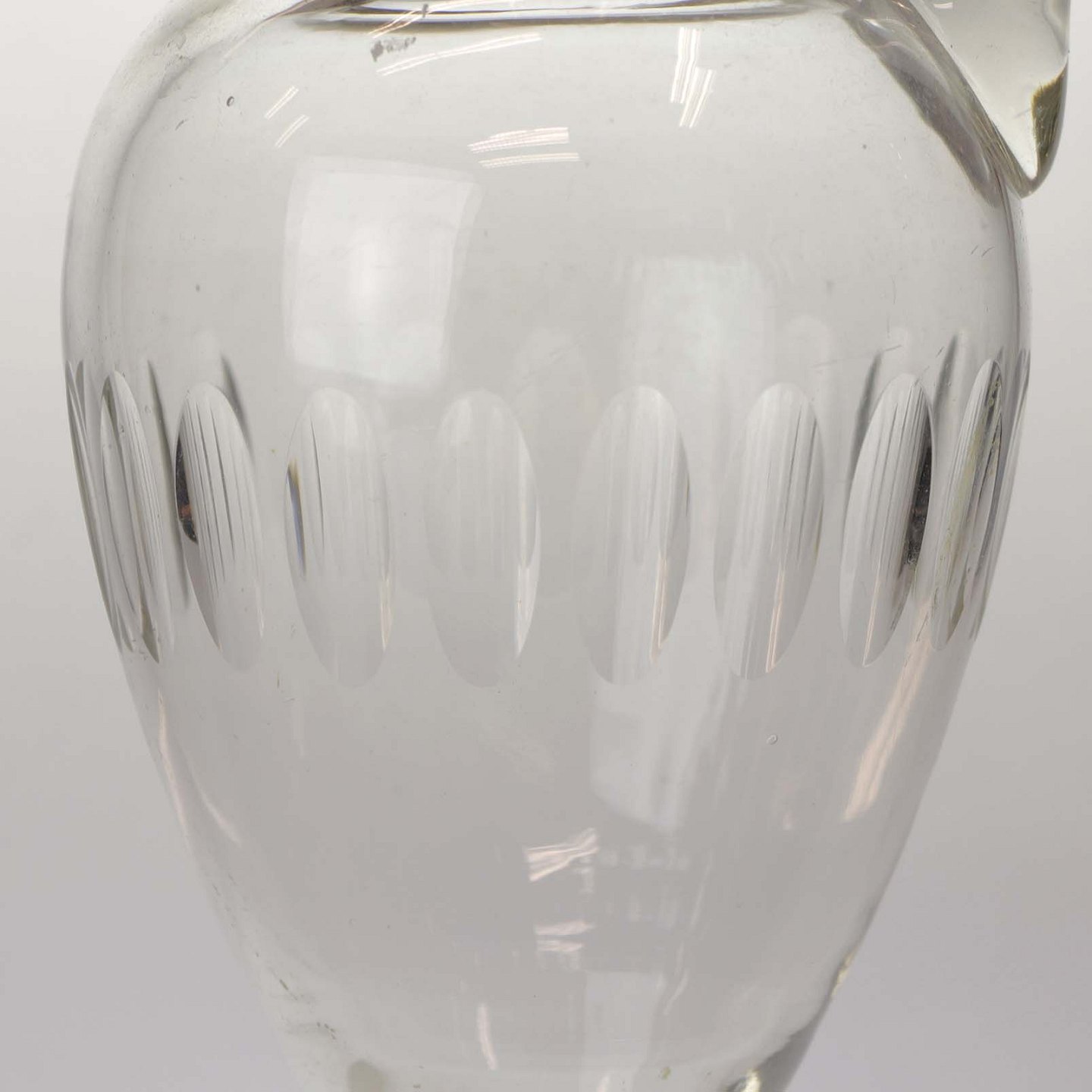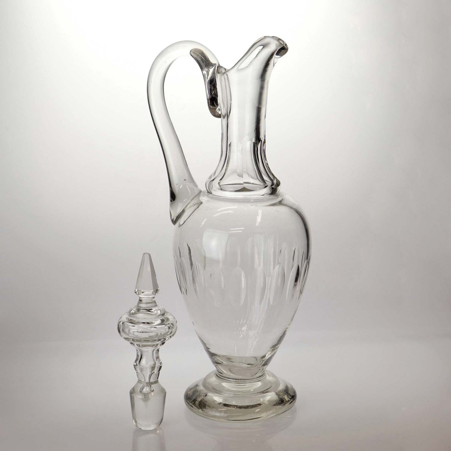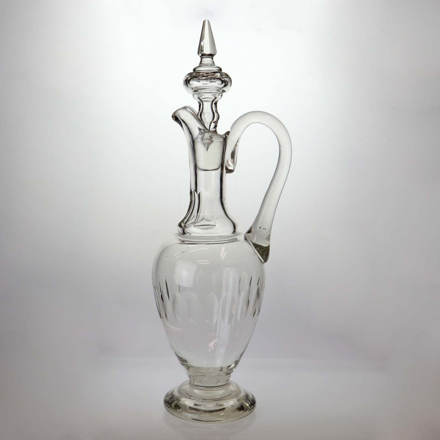 Karaffel i klart glas med slebet mønster samt top og hank. Muligvis fra omkring år 1890