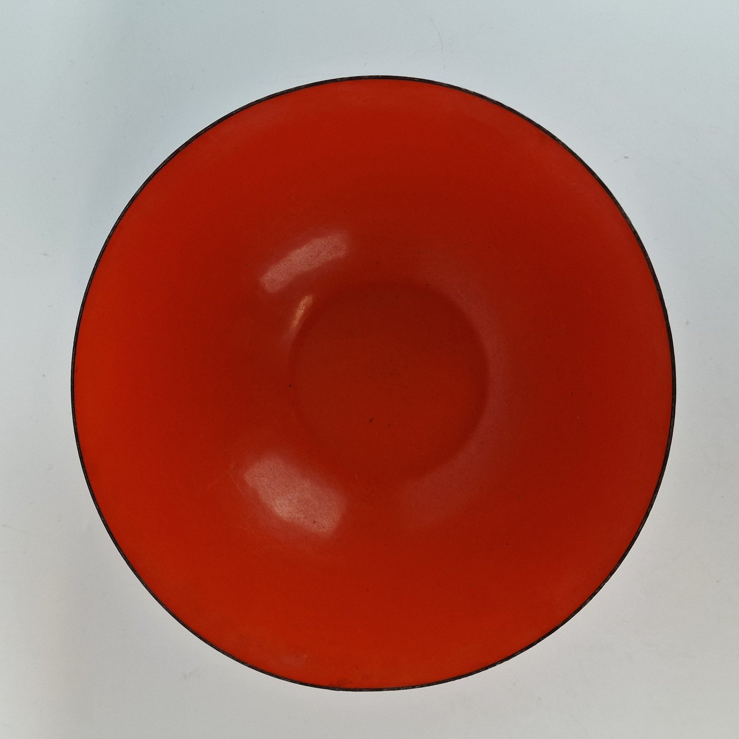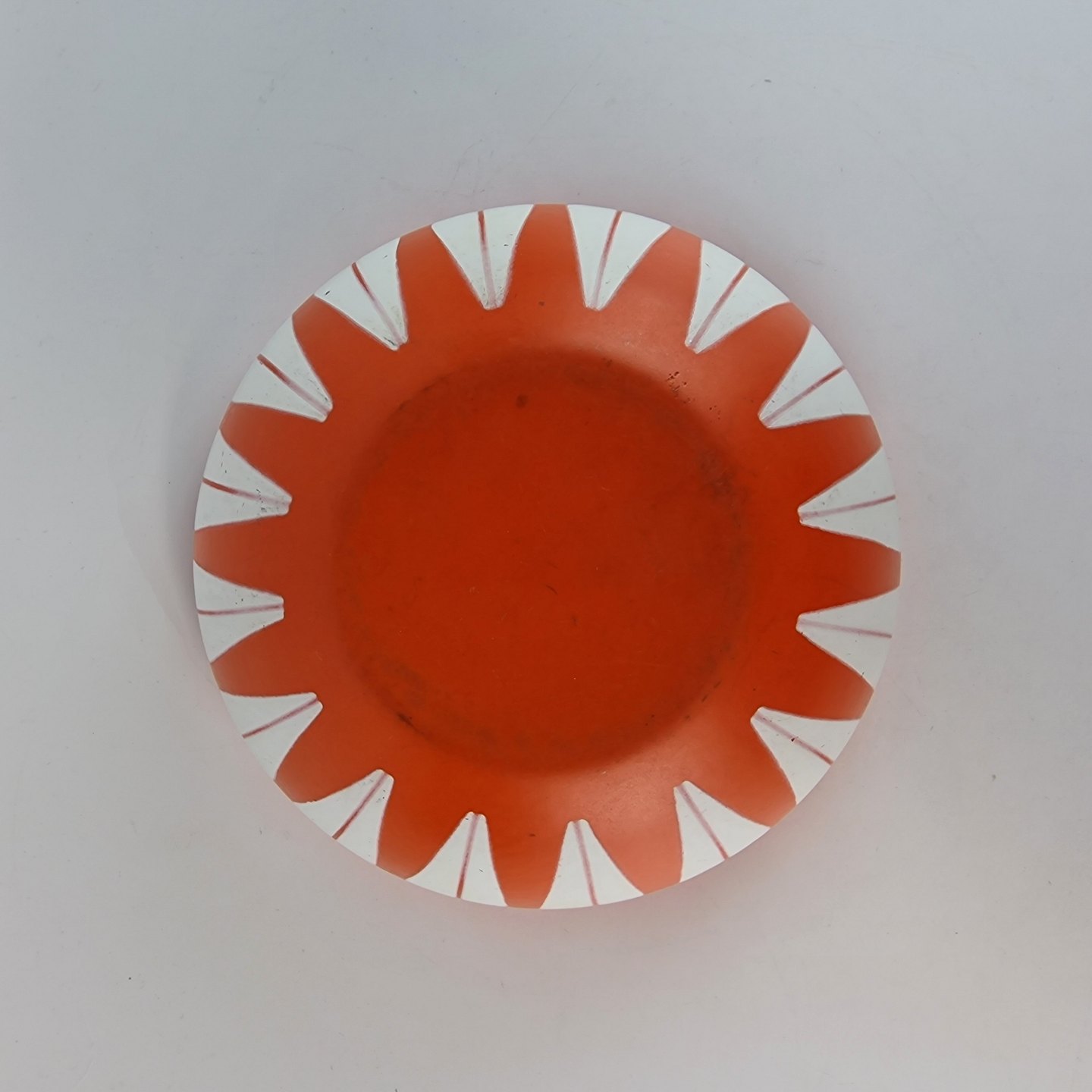Skål af emalje malet orange og dekoreret med hvide blade, fra serien Lotus. Blev til i 1960'erne