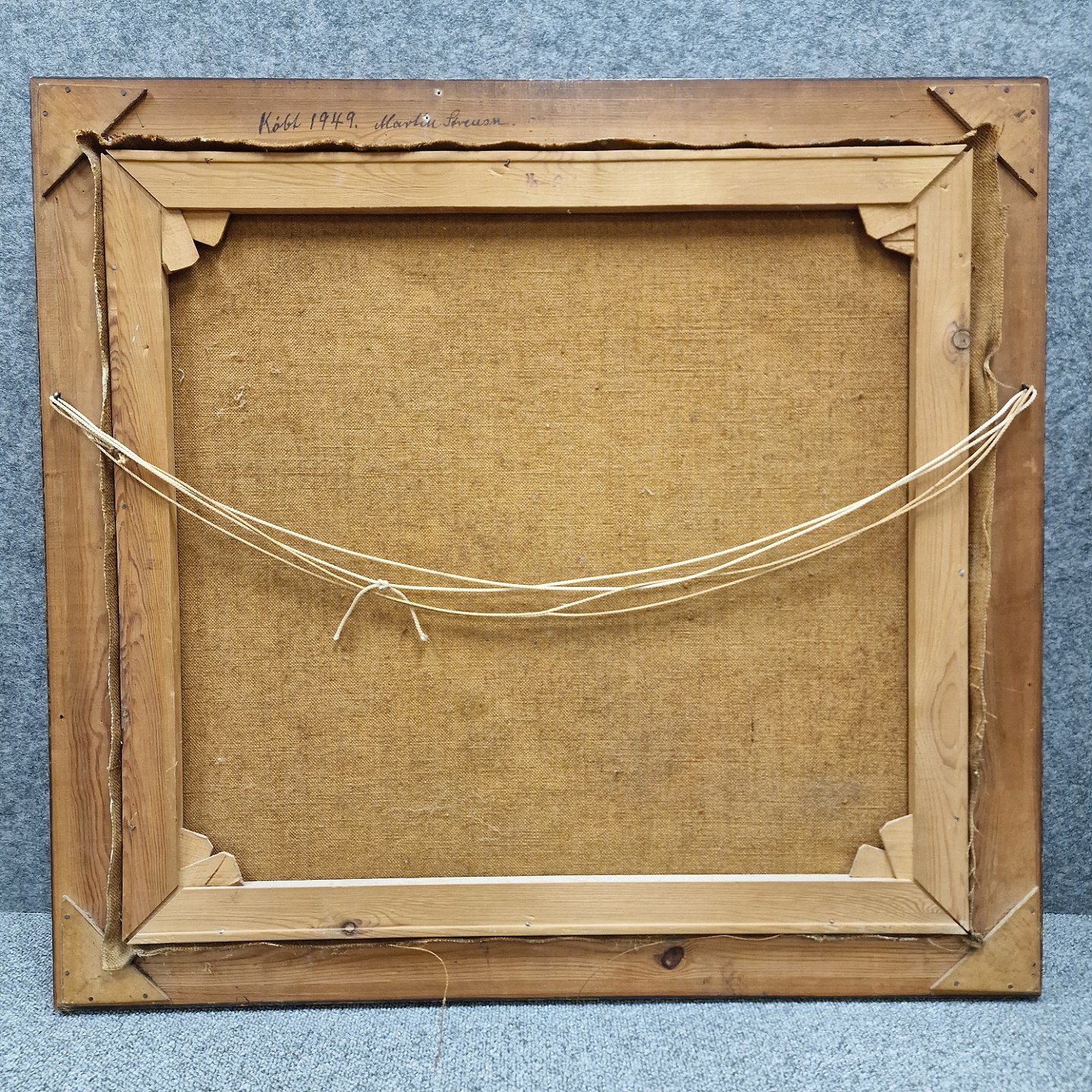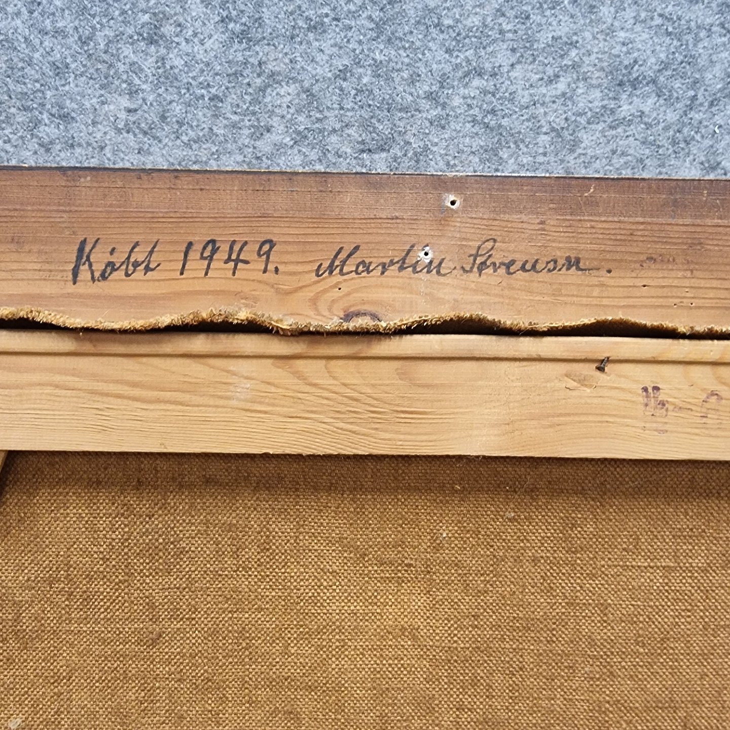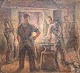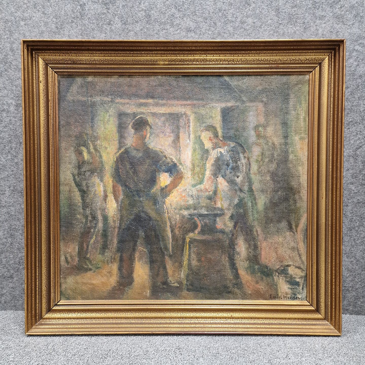 Oliemaleri på lærred med motiv af en smedje. På rammens bagside står teksten: Købt i 1949. Martin Sørensen