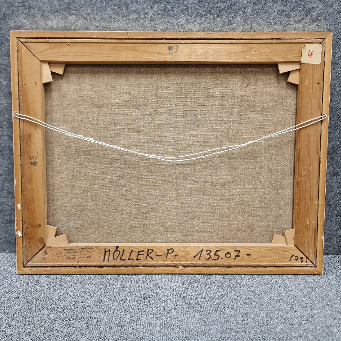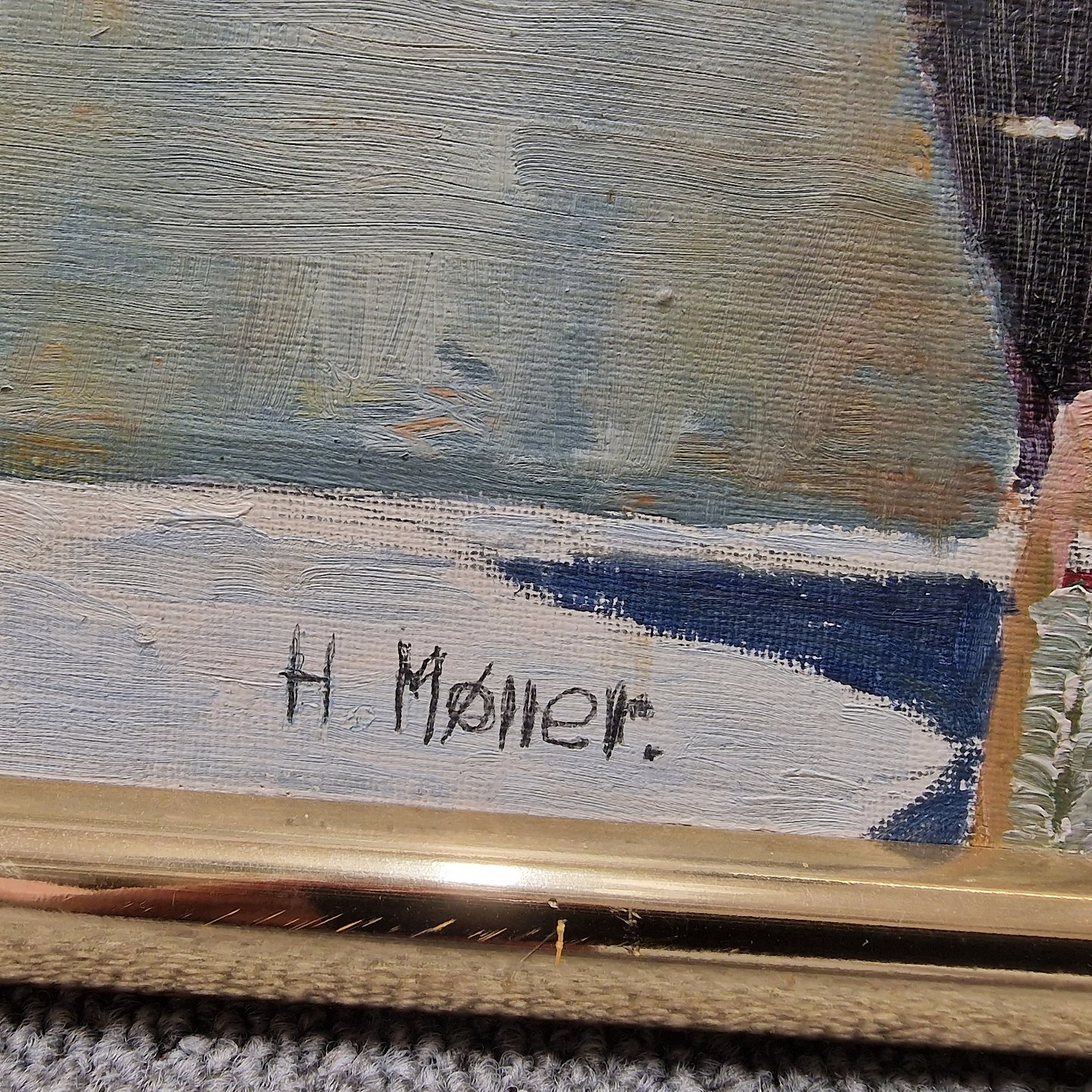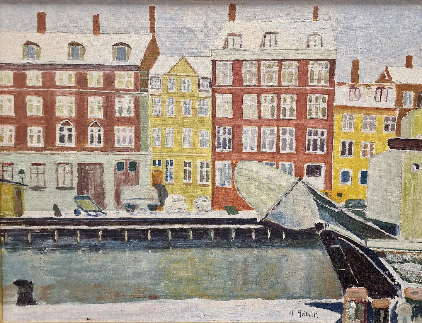 Maleri på lærred med motiv af huse og et skib. Nyhavn