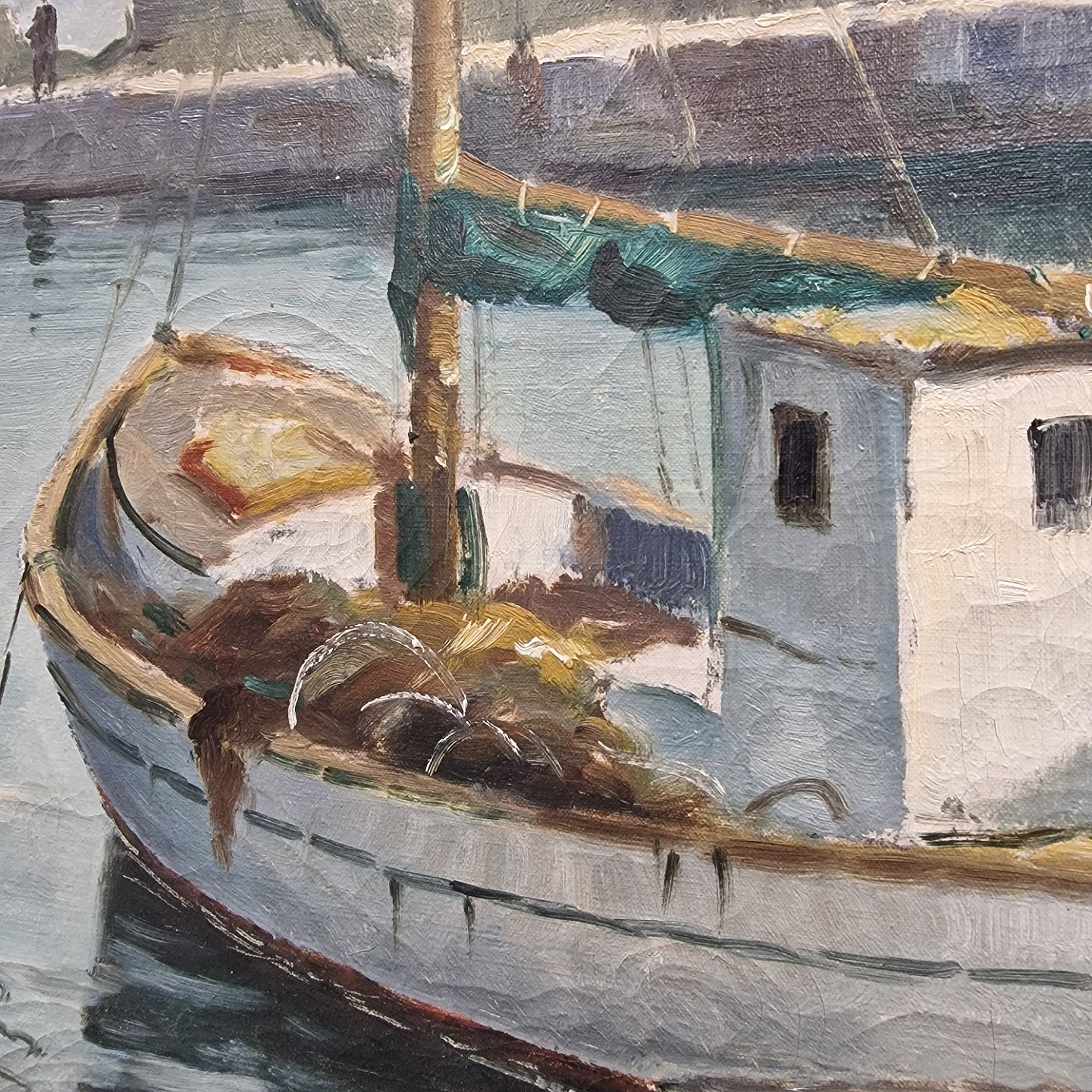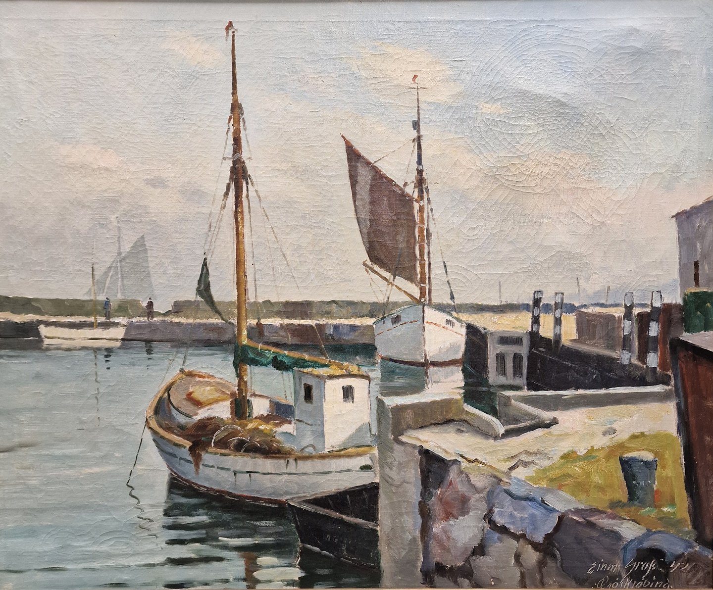 Maleri på lærred med motiv af havnen i Ærøskøbing. Dateret 1942