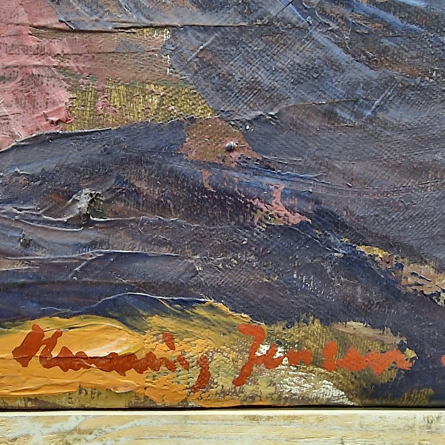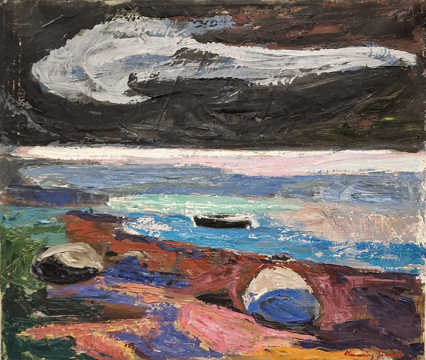 Oliemaling på lærred med abstrakt landskabsmotiv ved strand