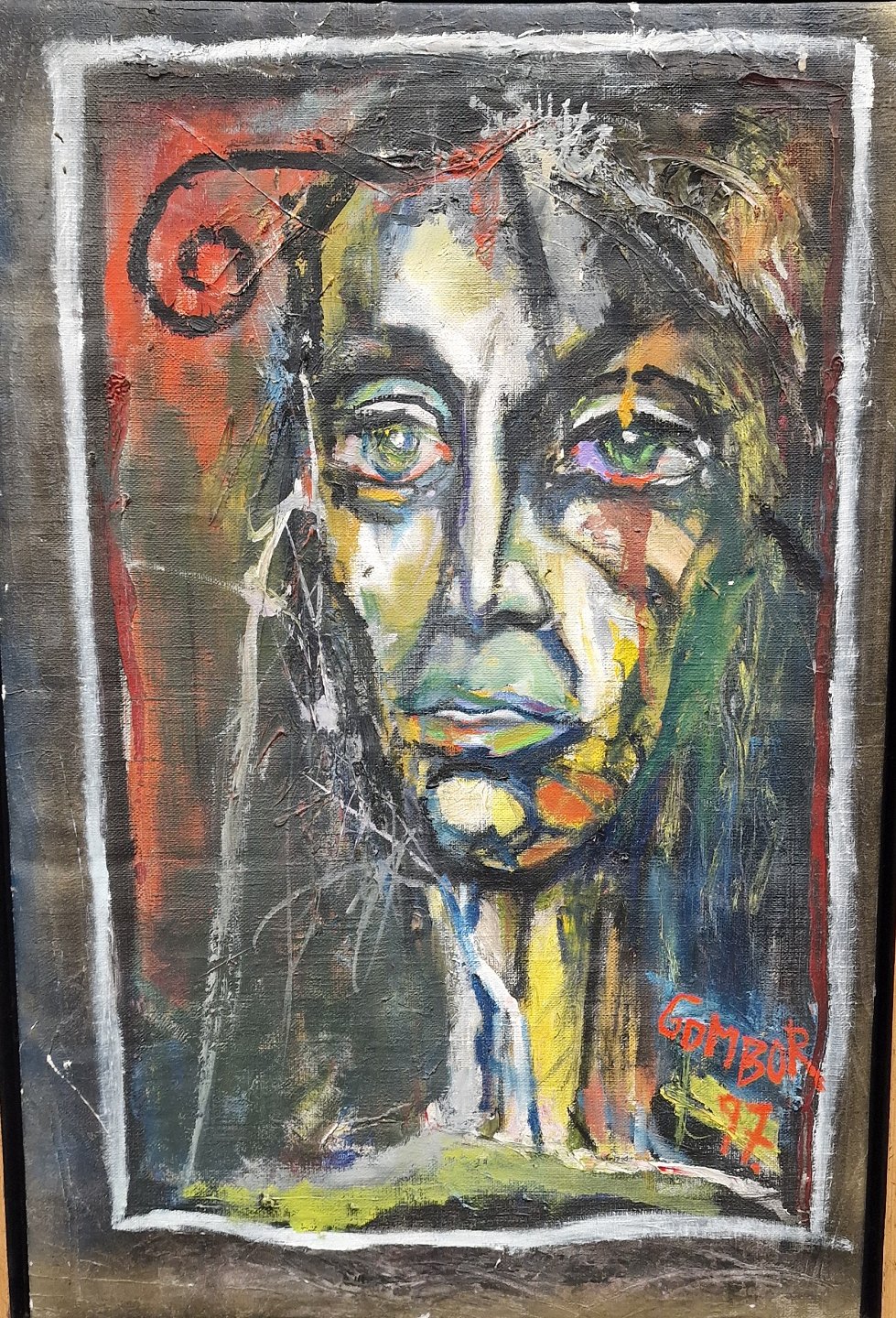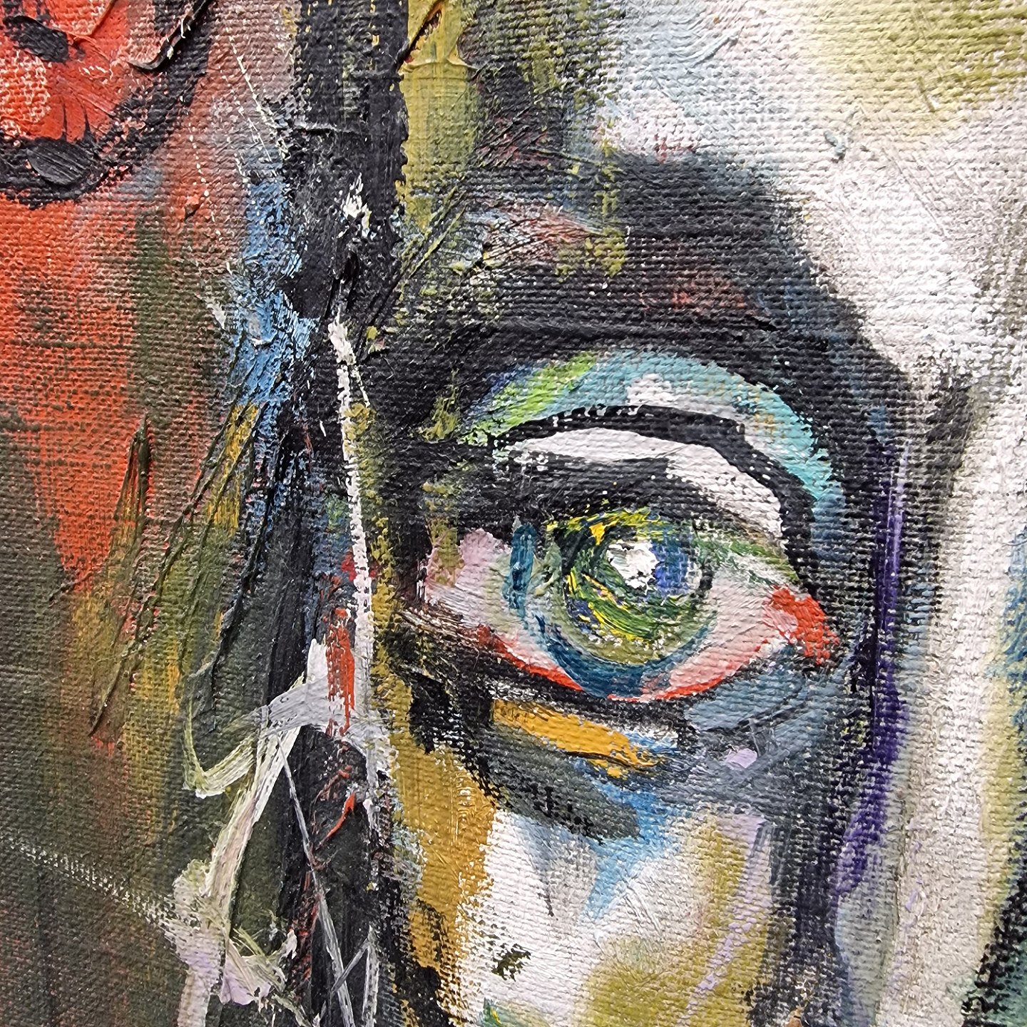 Oliemaleri på lærred. Multifarvet impressionistisk portrætmaleri af kvinde