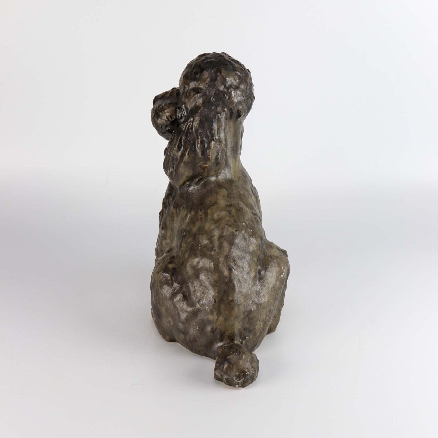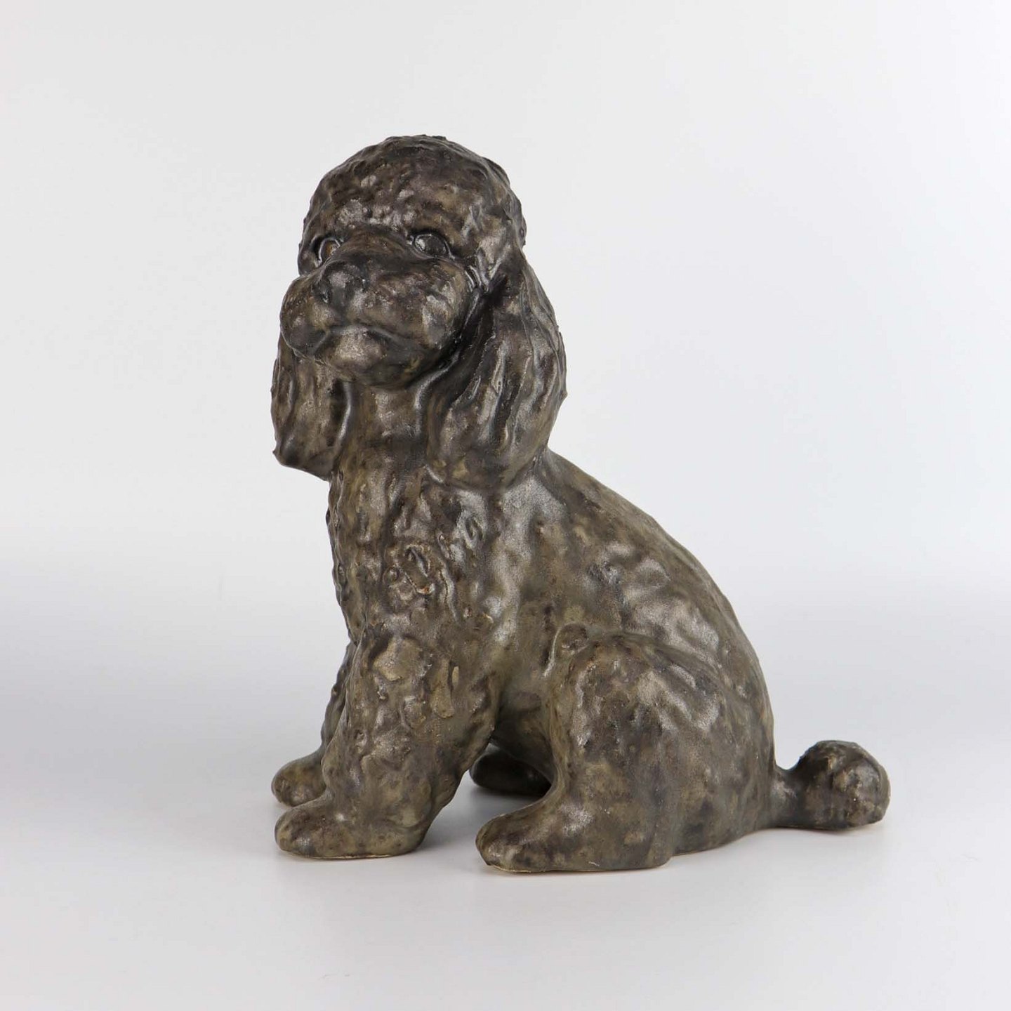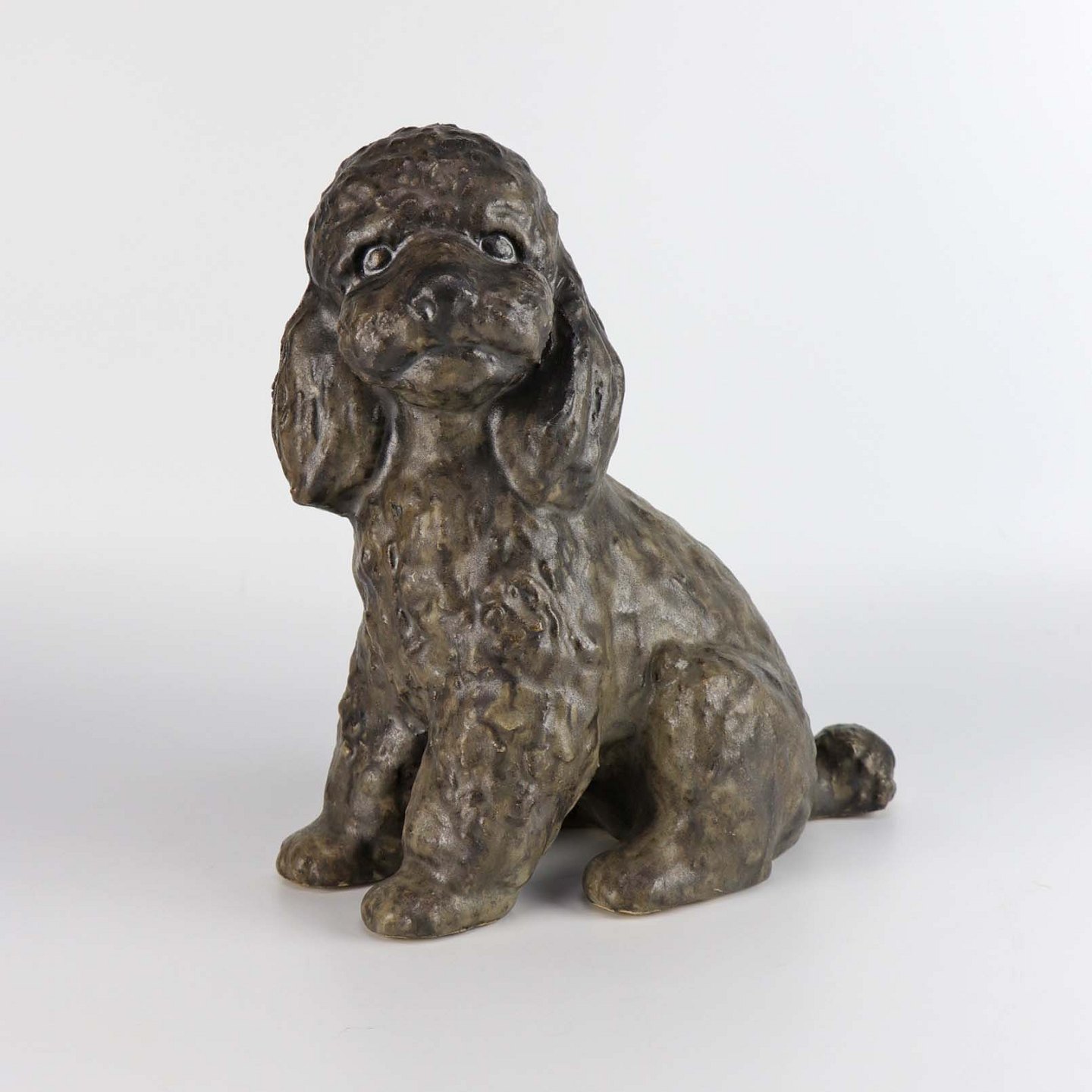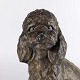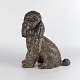 Figur i glaseret keramik med motiv af siddende puddel i brune og grønne nuancer