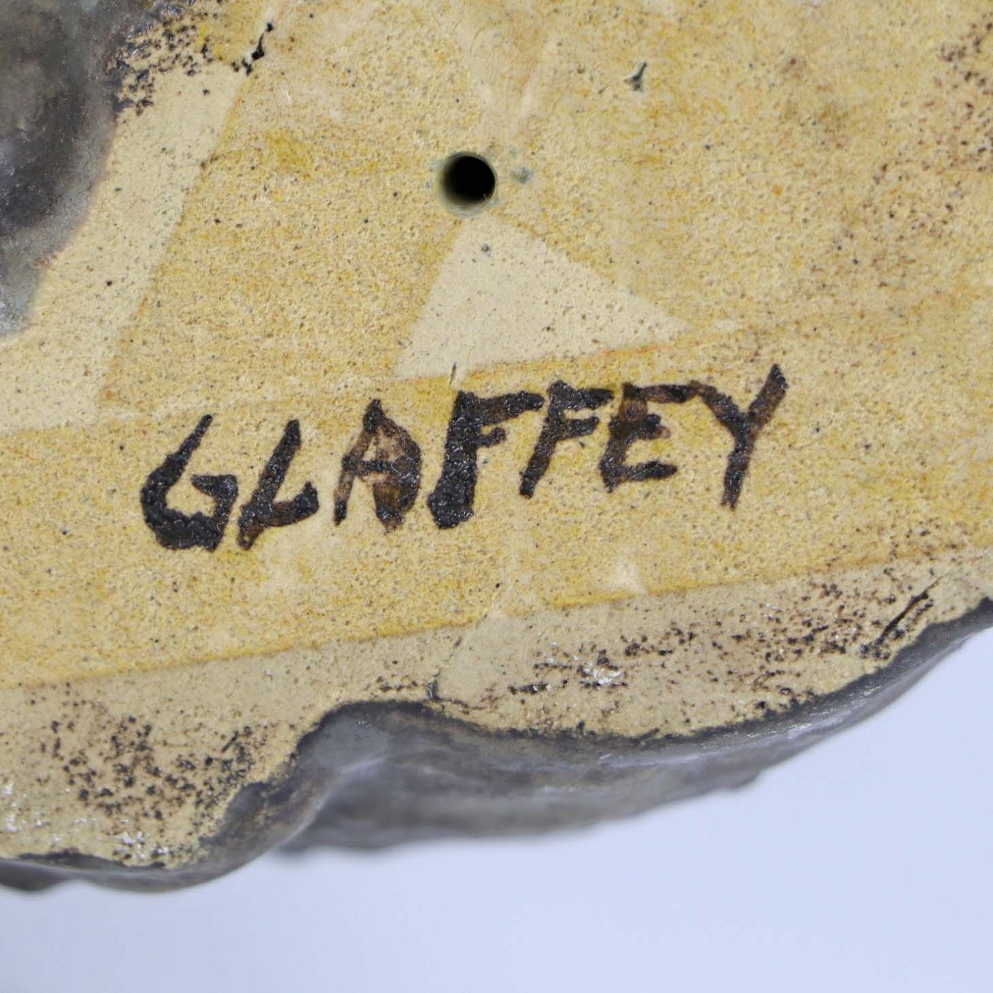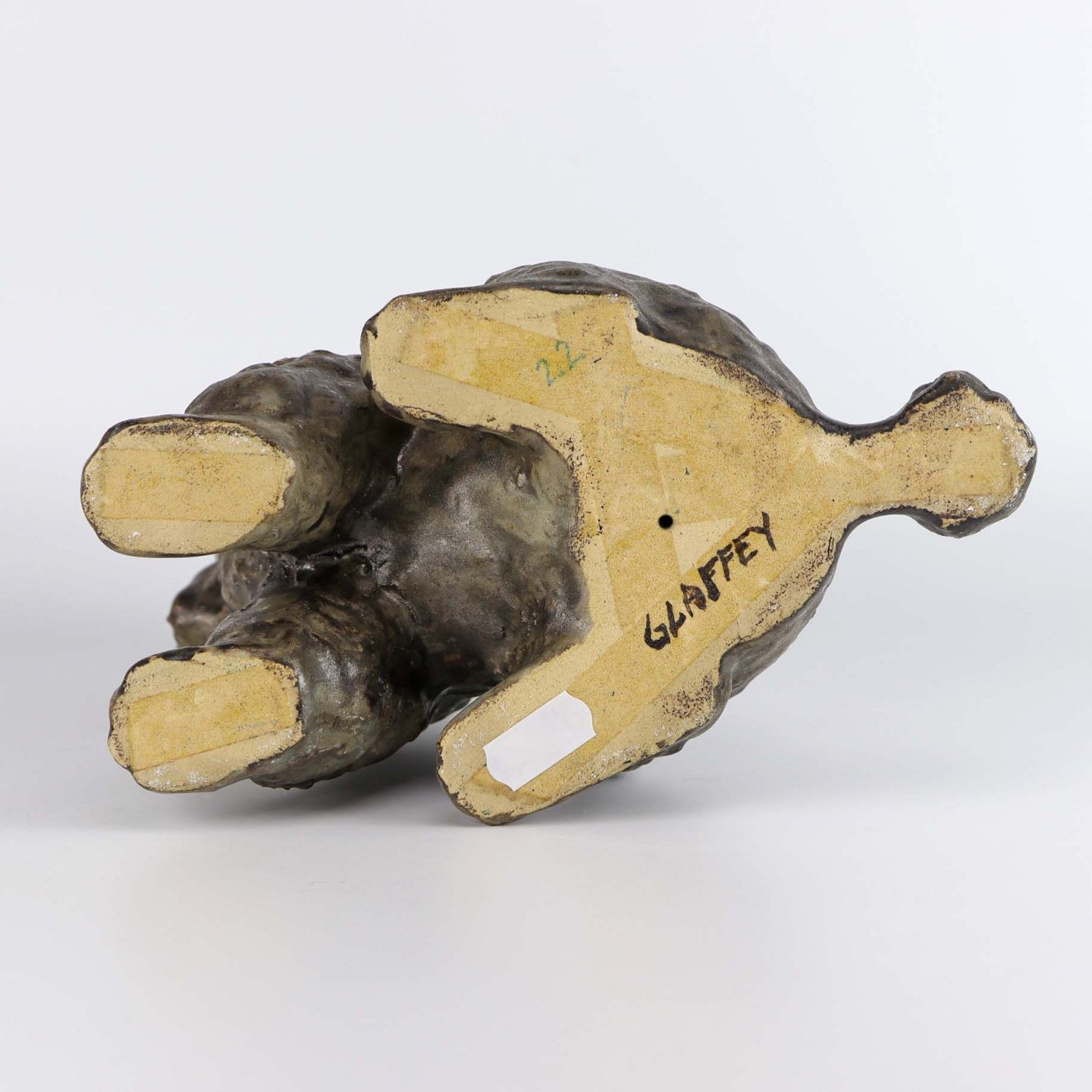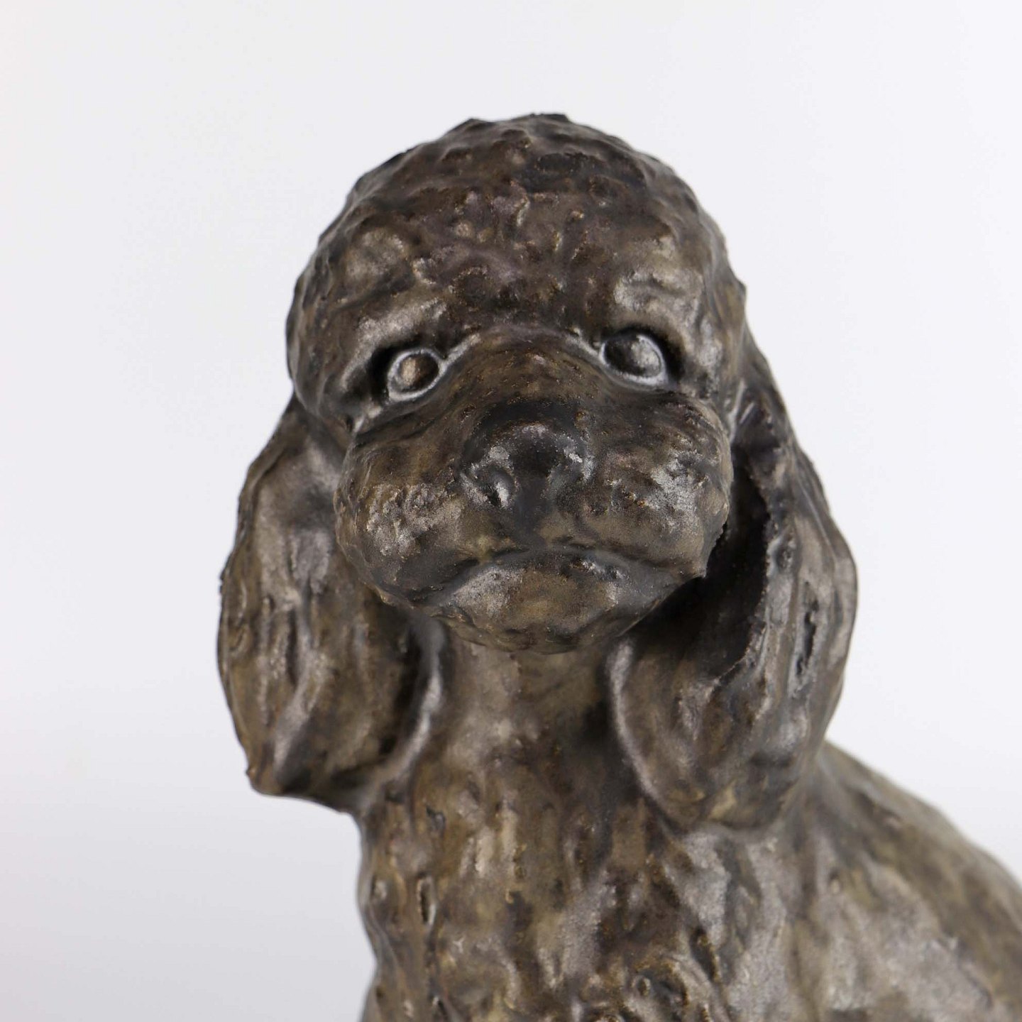 Figur i glaseret keramik med motiv af siddende puddel i brune og grønne nuancer
