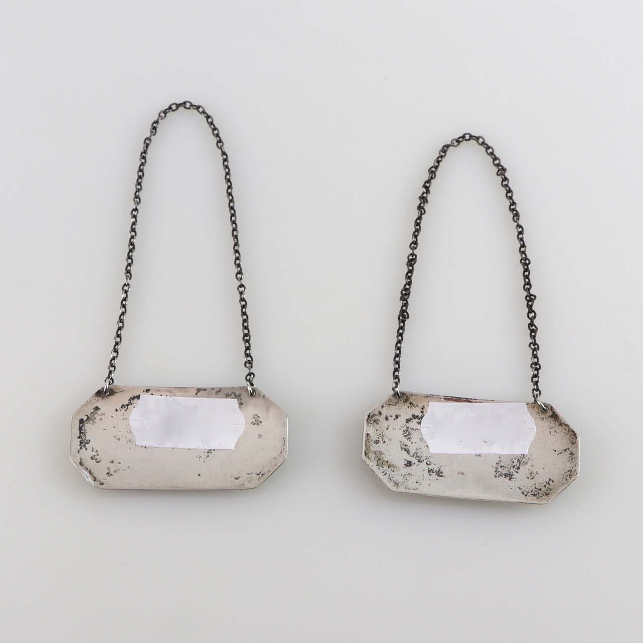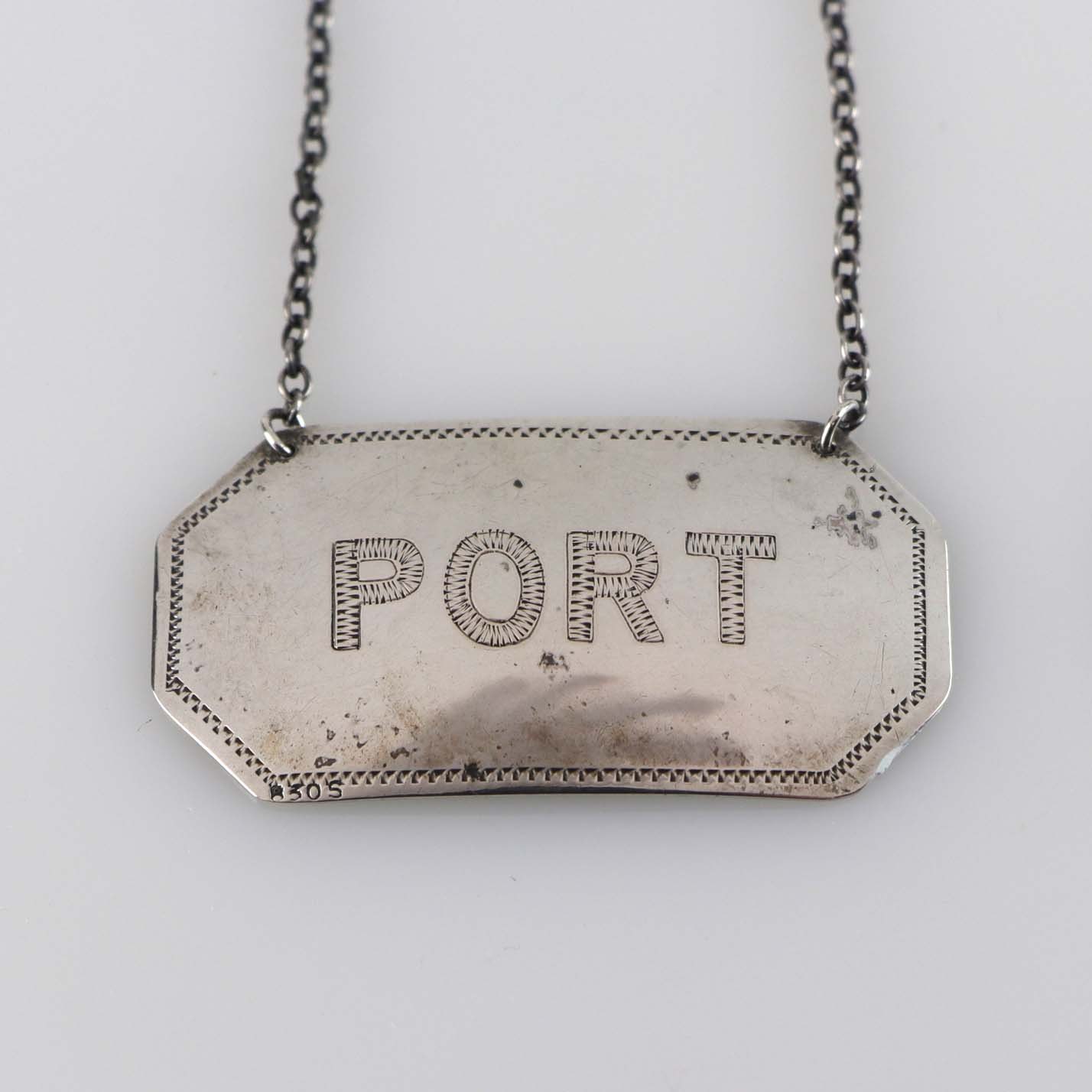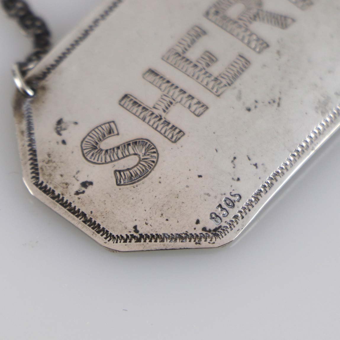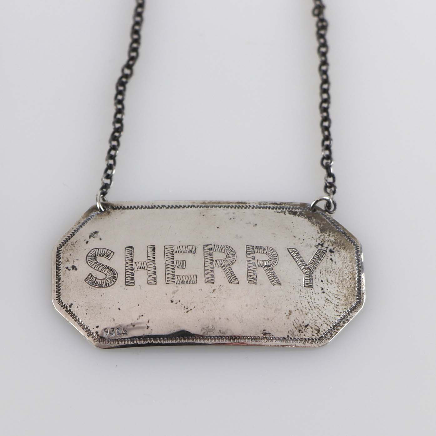 Et sæt flaskeplaketter i sølv til Portvin og Sherry. Begger er stemplet 830s