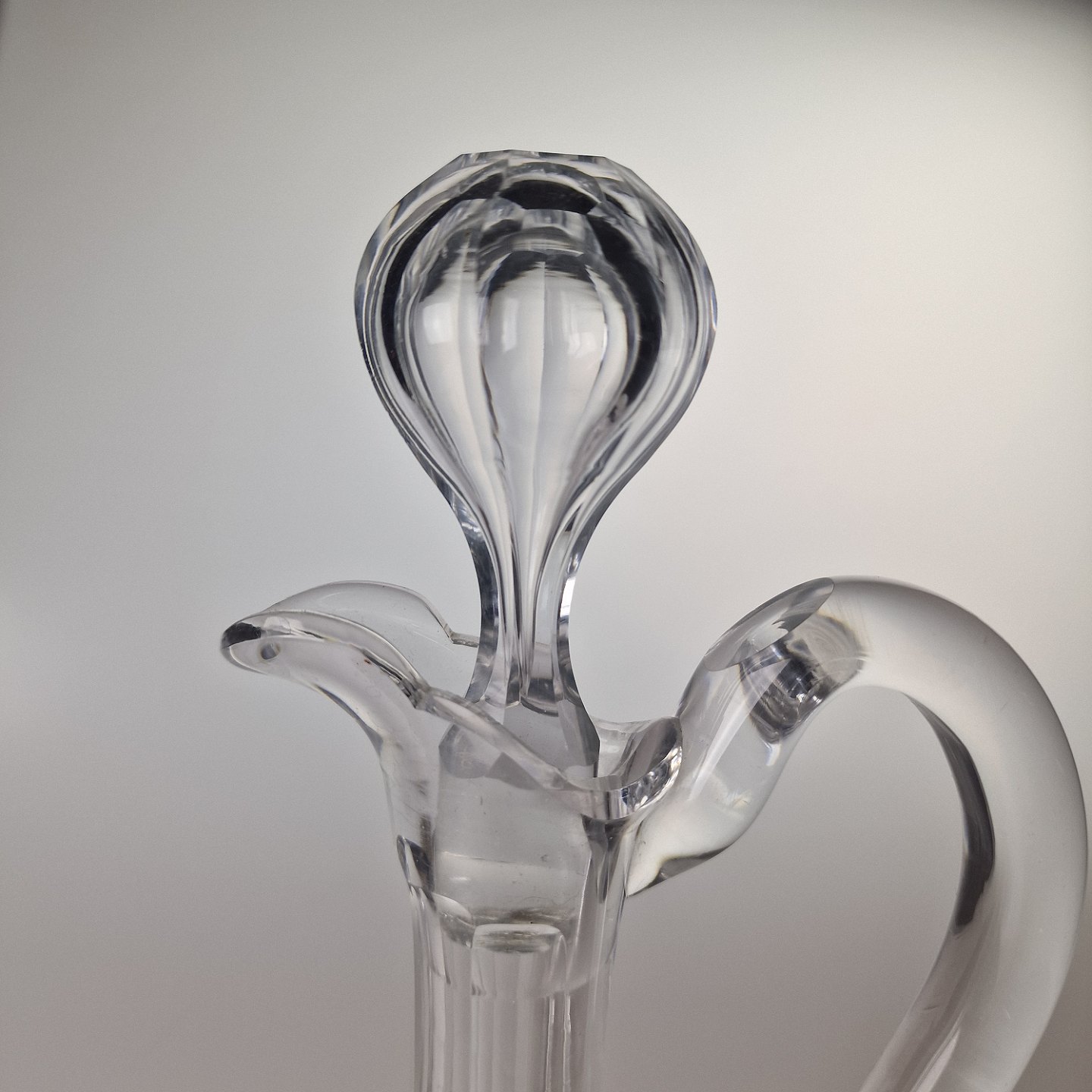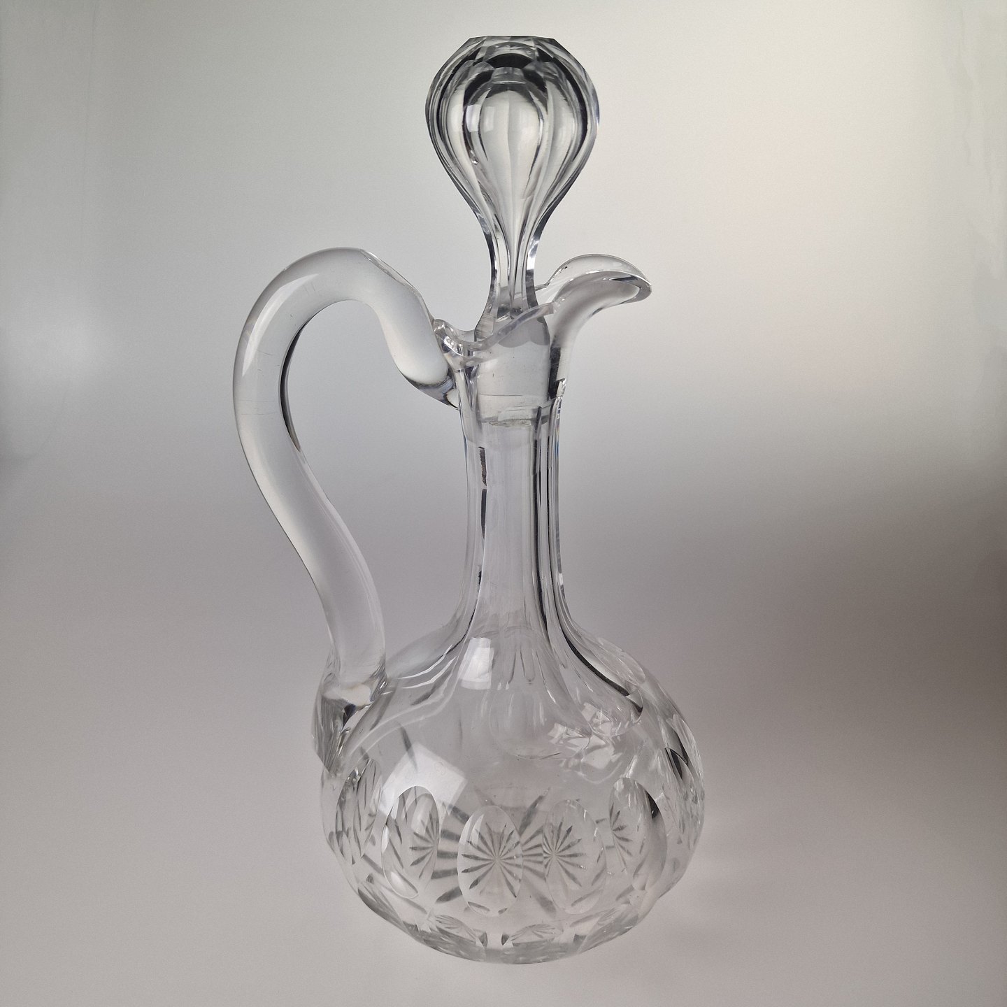 Klar karaffel til glasservicet Derby, dekoreret med stjerneslibning nederst. Med hank og prop. Olivenslibning rundt på kolben.