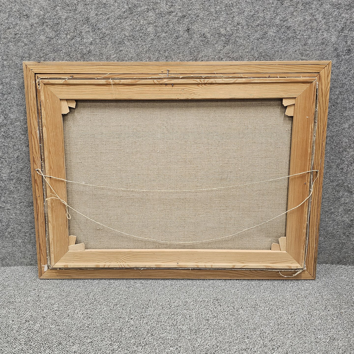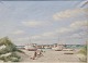 Maleri af oliemaling på lærred, med motiv af en strand med fiskerbåde på land