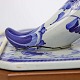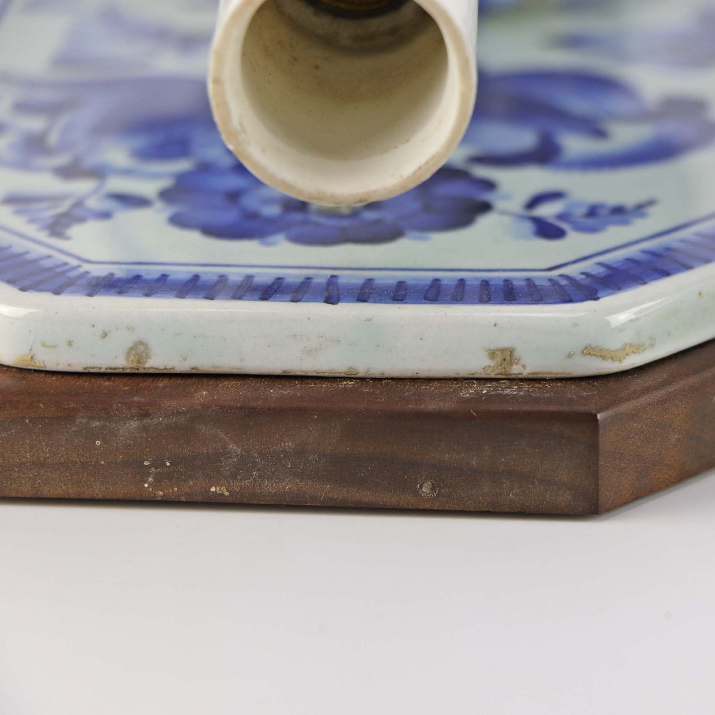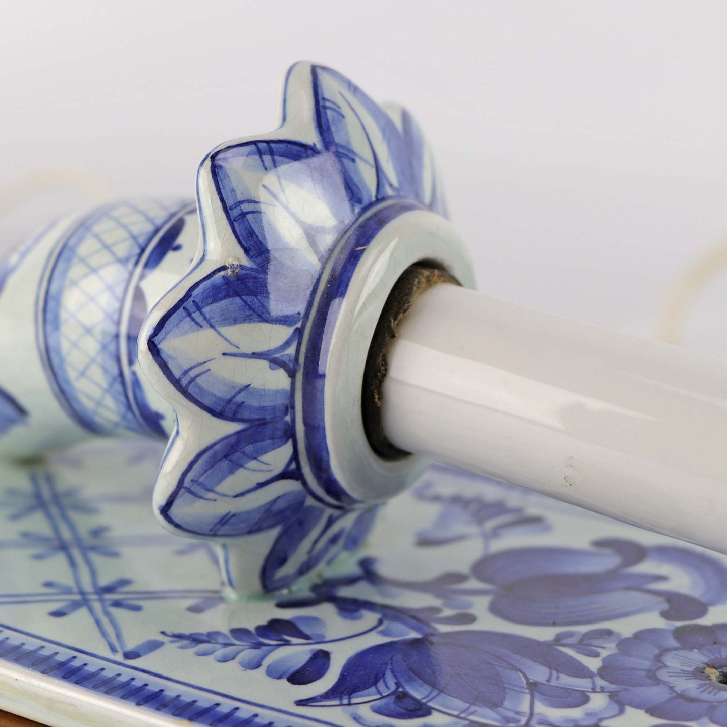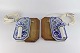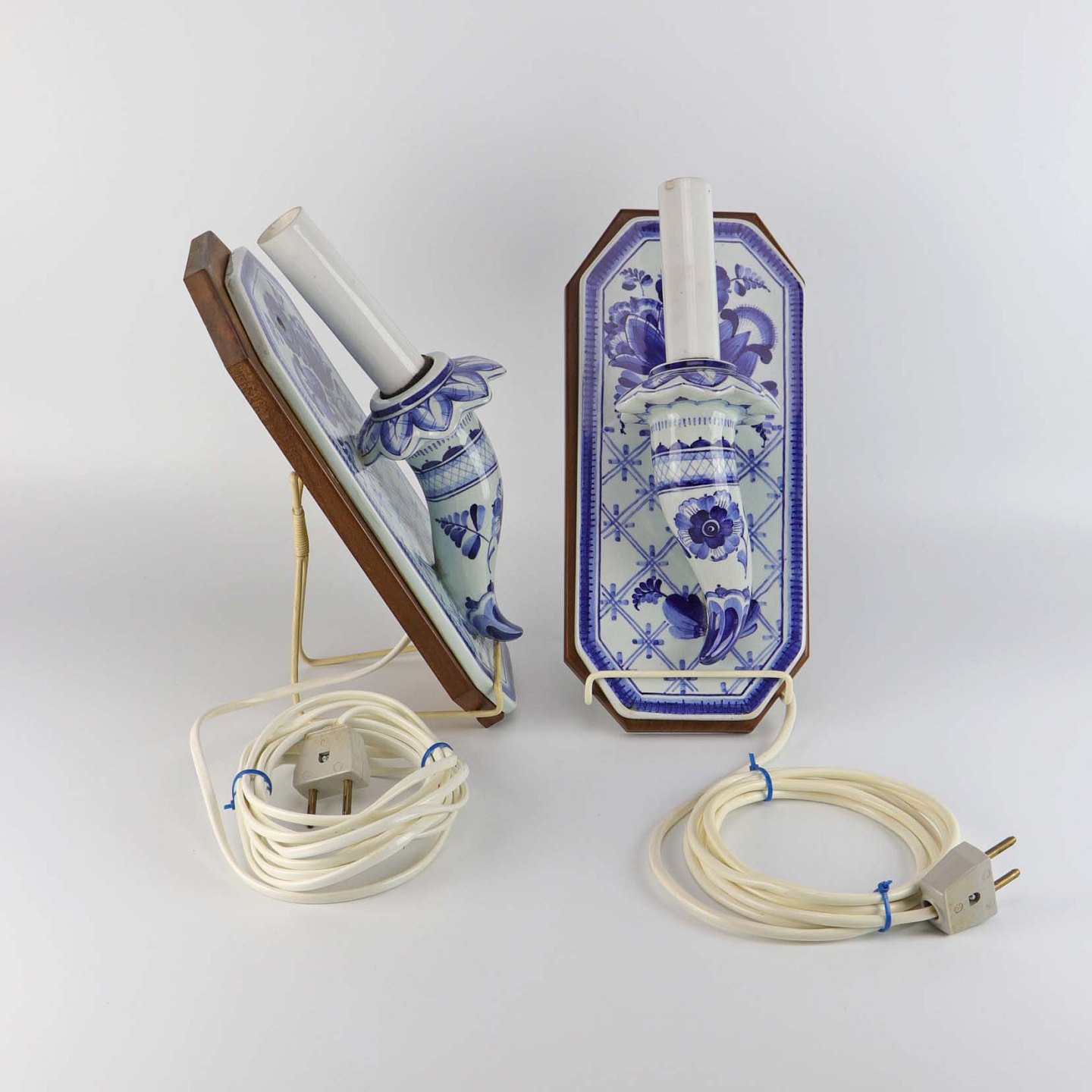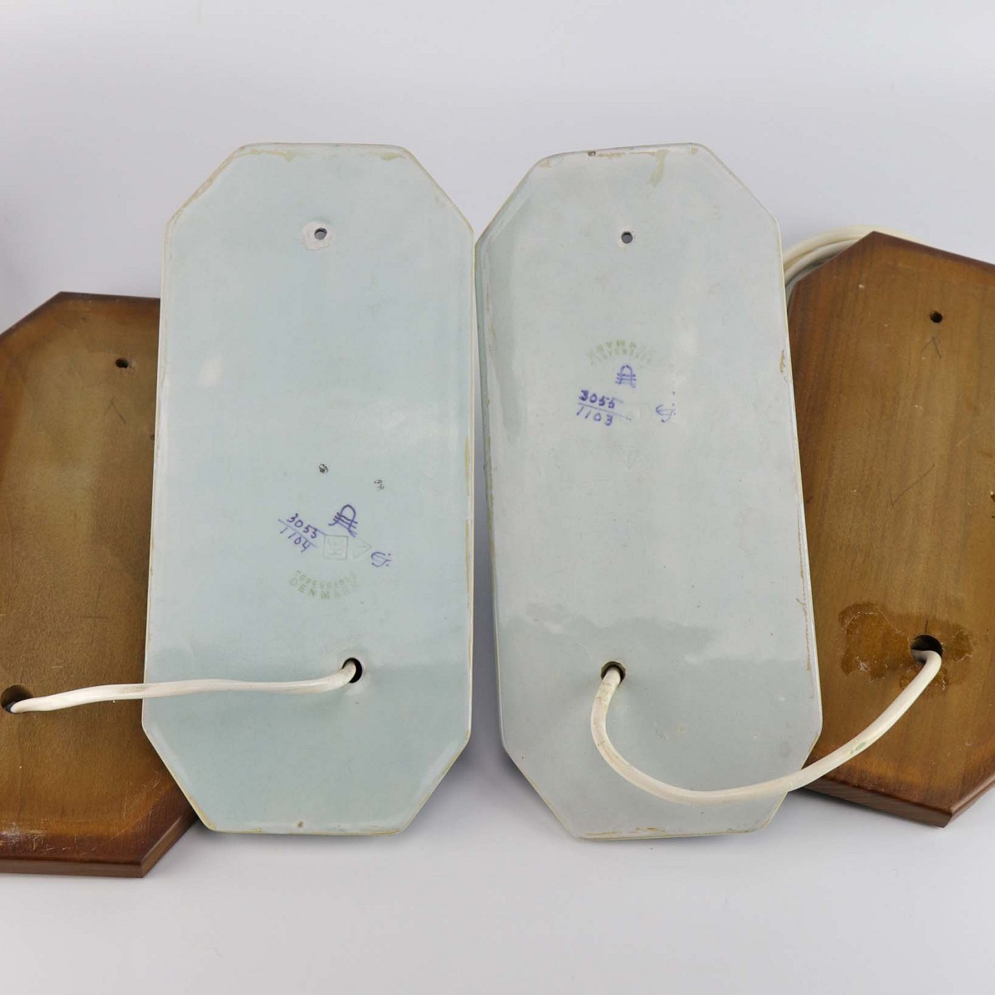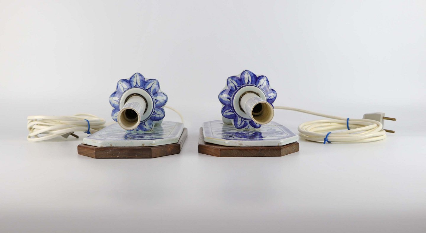 Sæt med to væglamper i fajance med bagplade i træ fra serien Blå Tanquebar nr 3053/1104