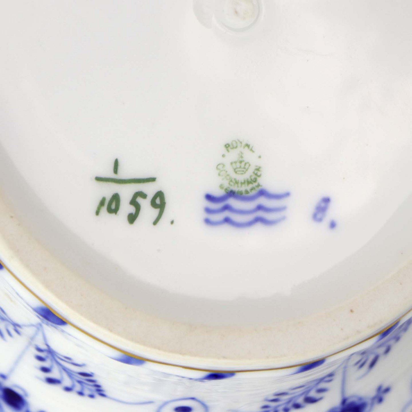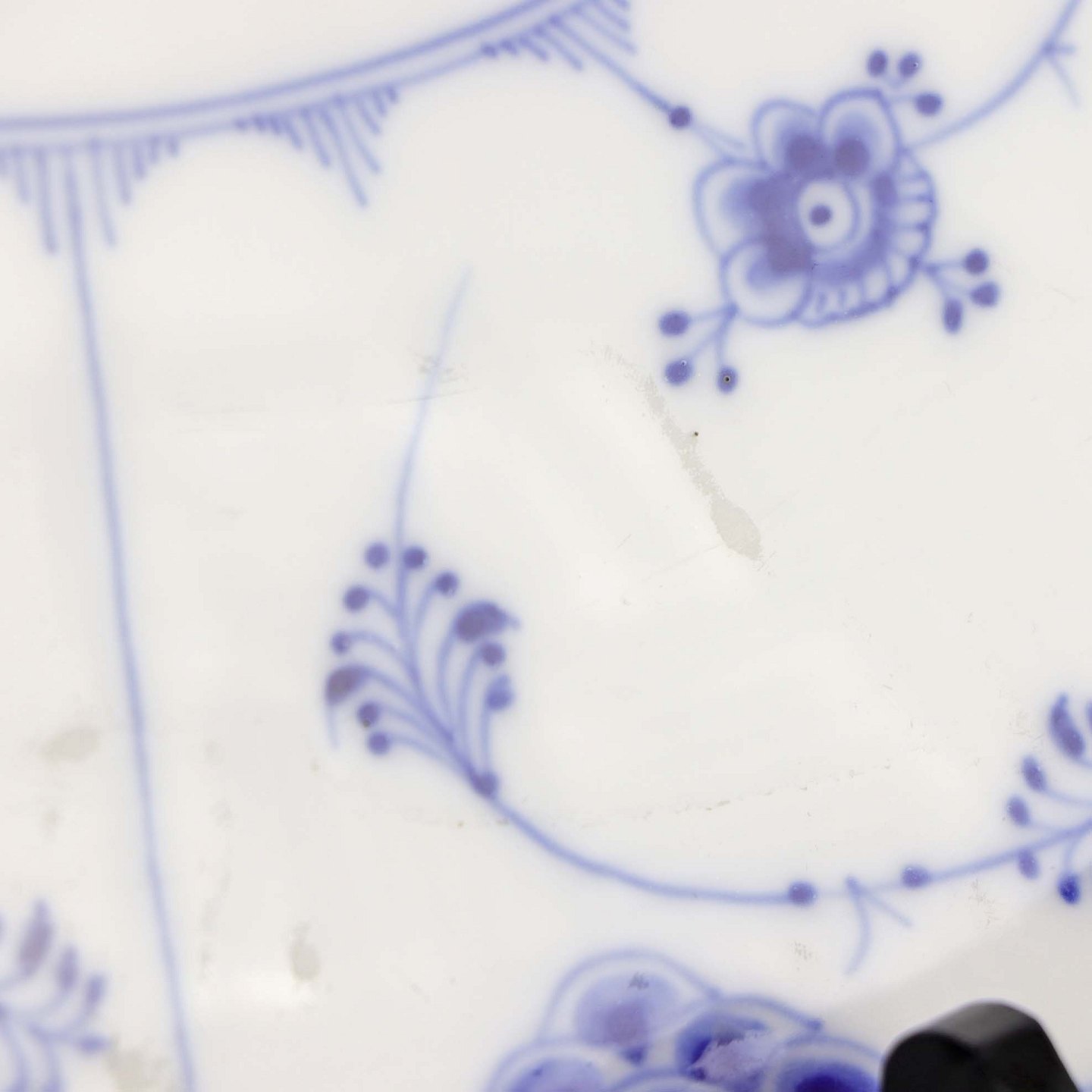 Stellet Musselmalet Helblonde er hvidt porcelæn dekoreret med blå blomster og mønstre. Øverst er porcelænet dekoreret med hulmønster.