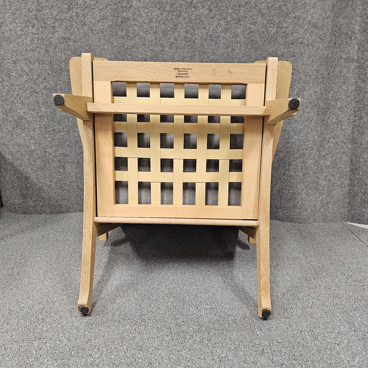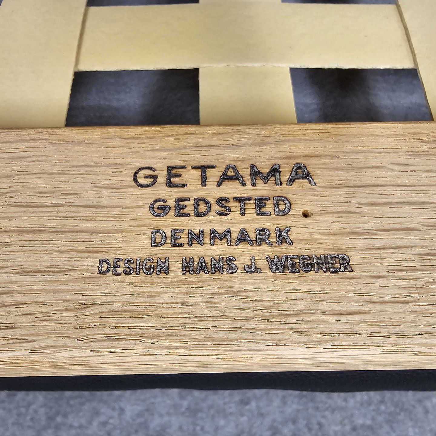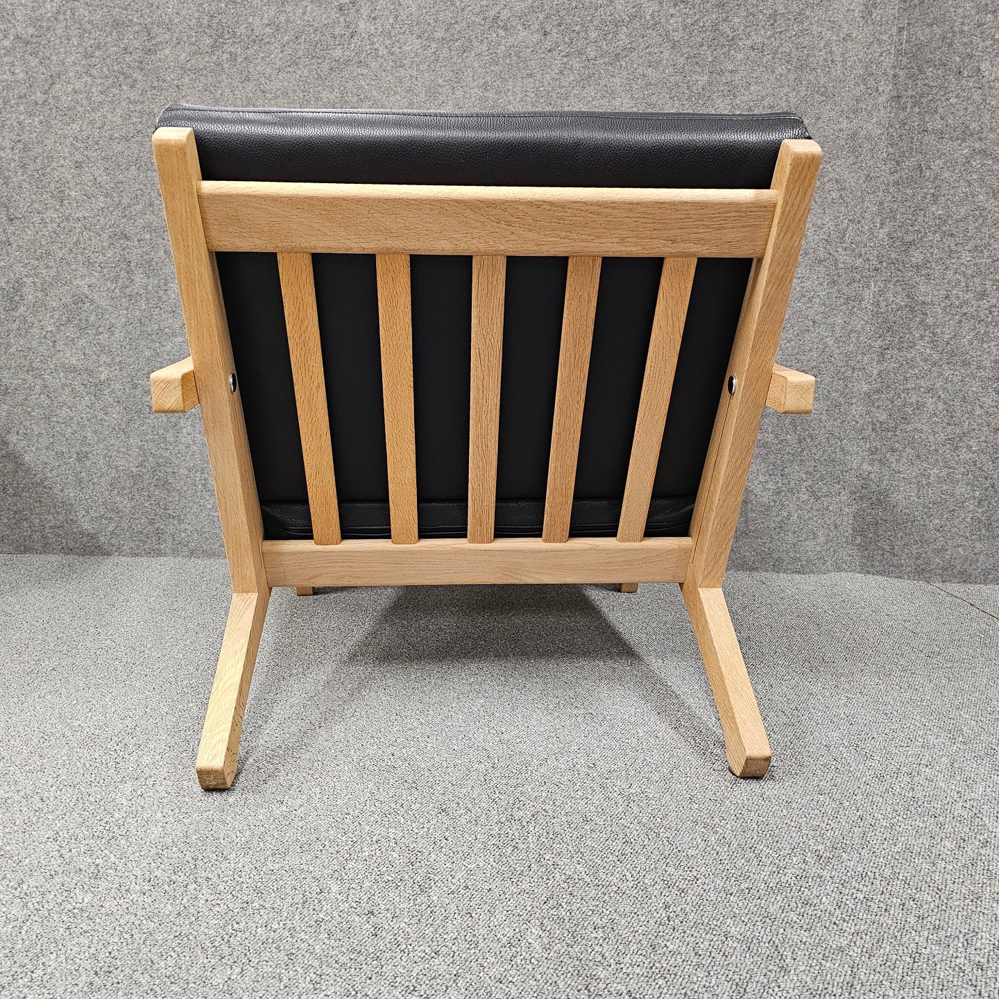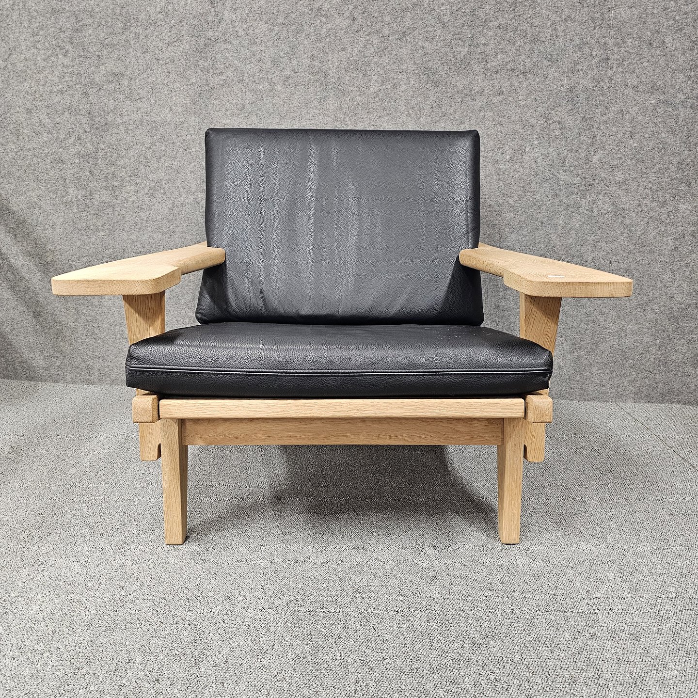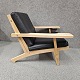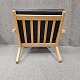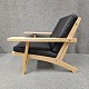 Lænestol af eg med sorte hynder af læder. Dansk designer. Model GE 370. Fremstår meget flot stand