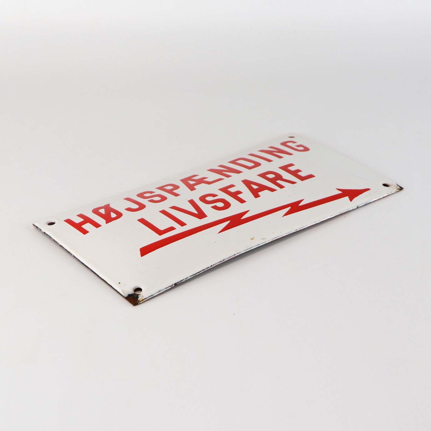 Advarseslskilt i hvid emalje med rød skrift med teksten Højspænding. Livsfare