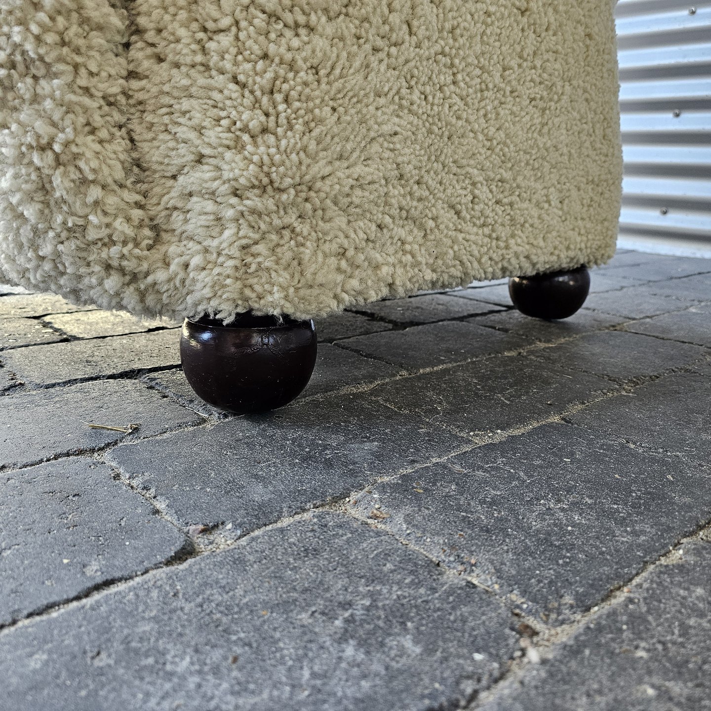 Lænestol med høj ryg og armlæn. Sædet er med spiralfjedre og hele stolen er ny-ompolstret. Derudover er bamsestolen ny-ombetrukket med lammeskind. Produceret i 20'erne.