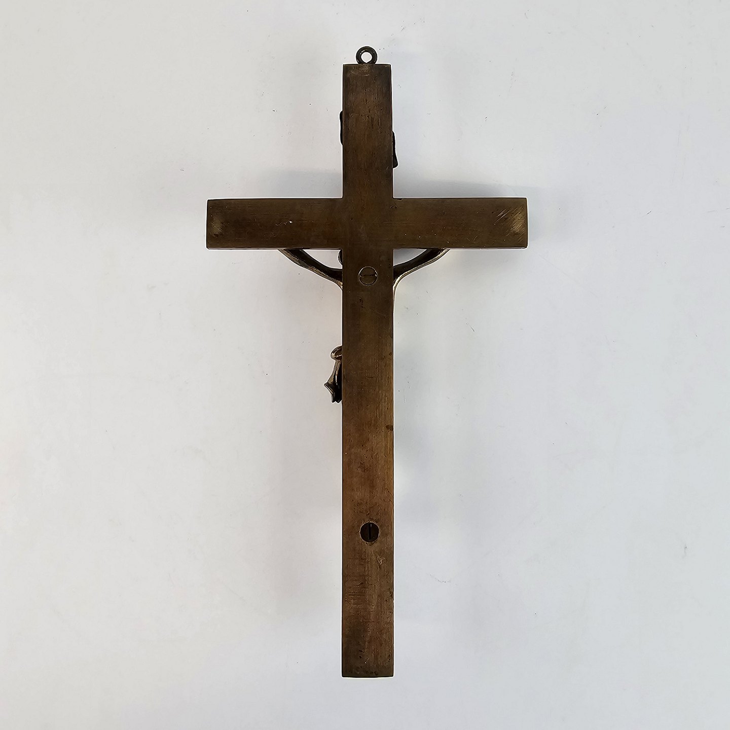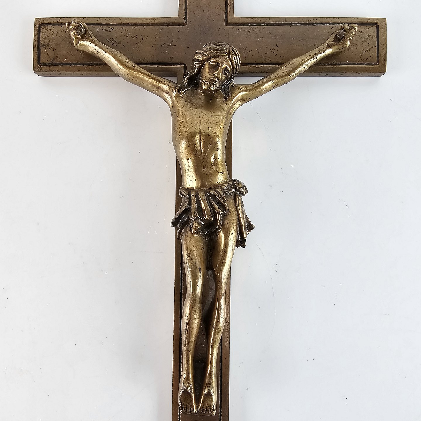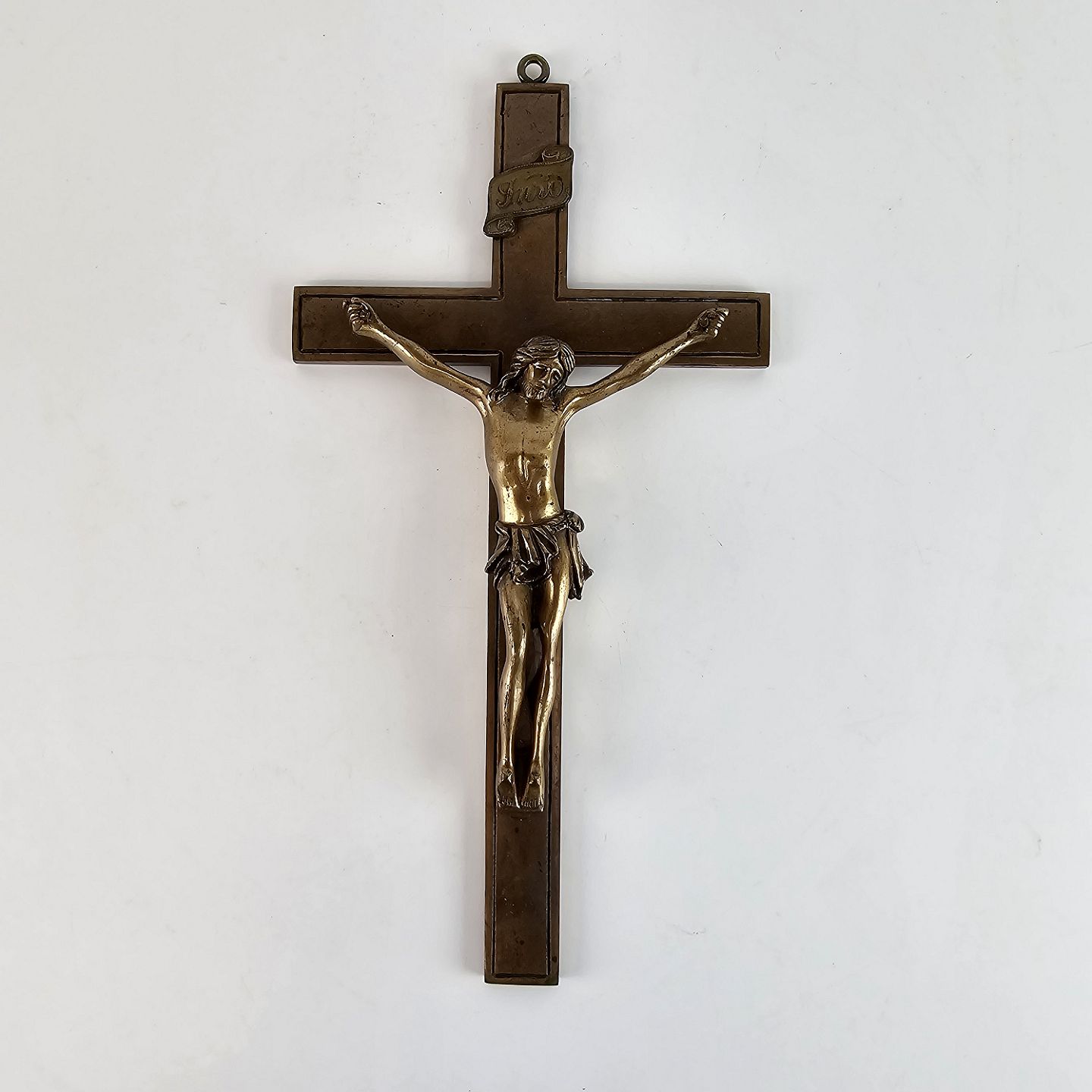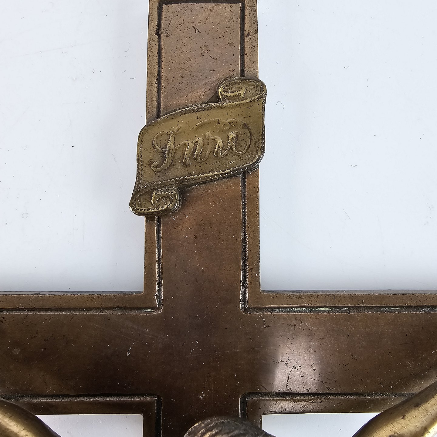 Kors med korsfæstet Jesus af bronze, der står INRI for oven. Inri er latin og betyder gå ind