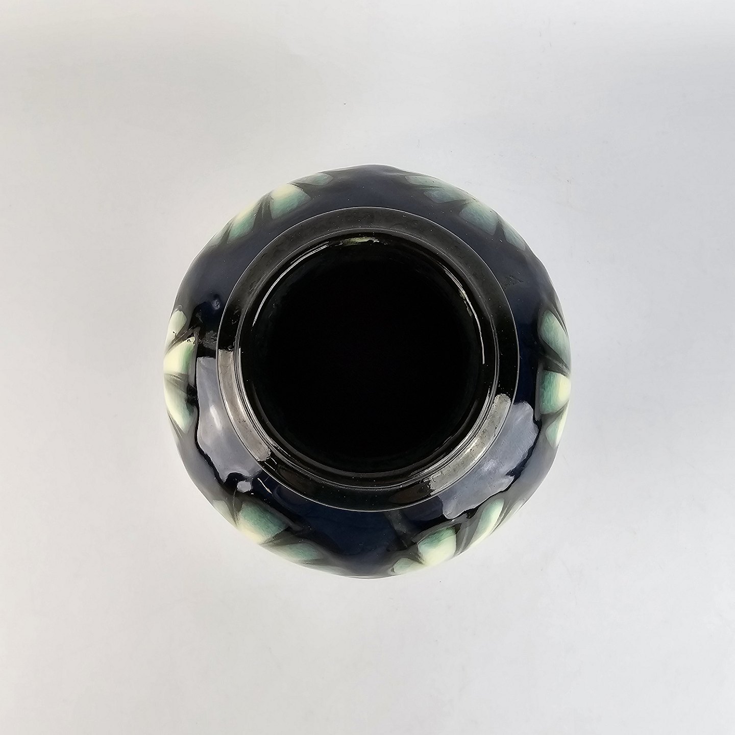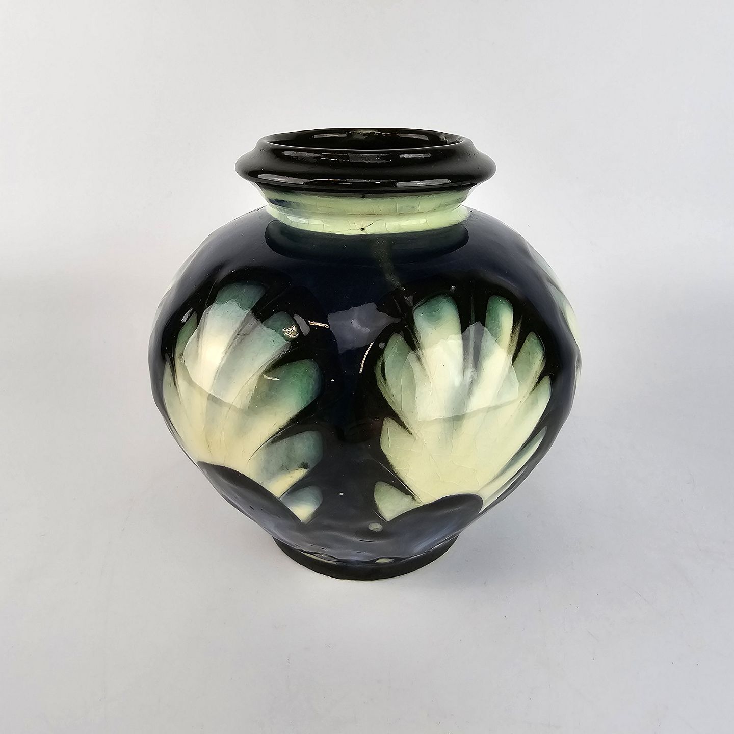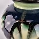 Blå keramik vase dekoreret med lys grønne vifter