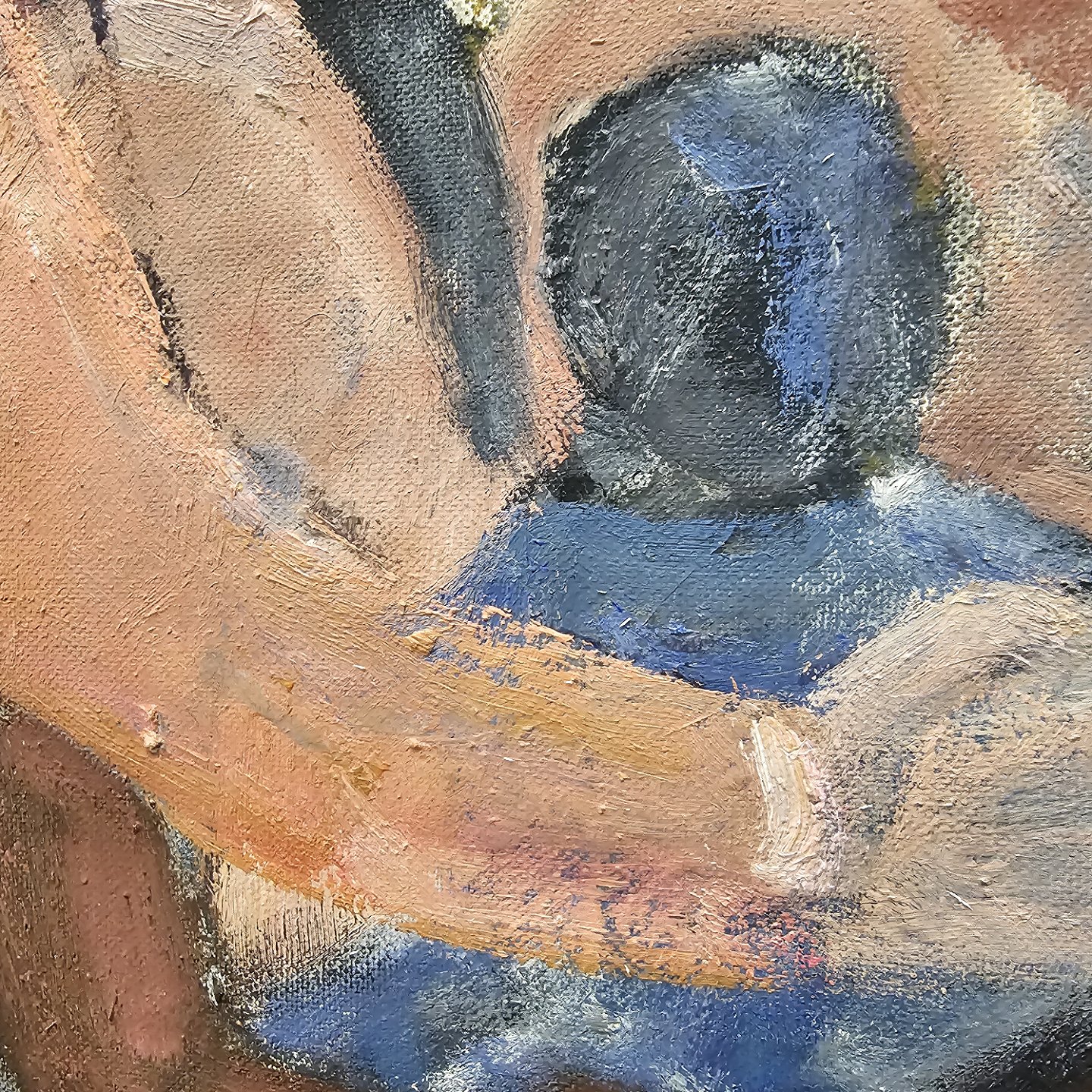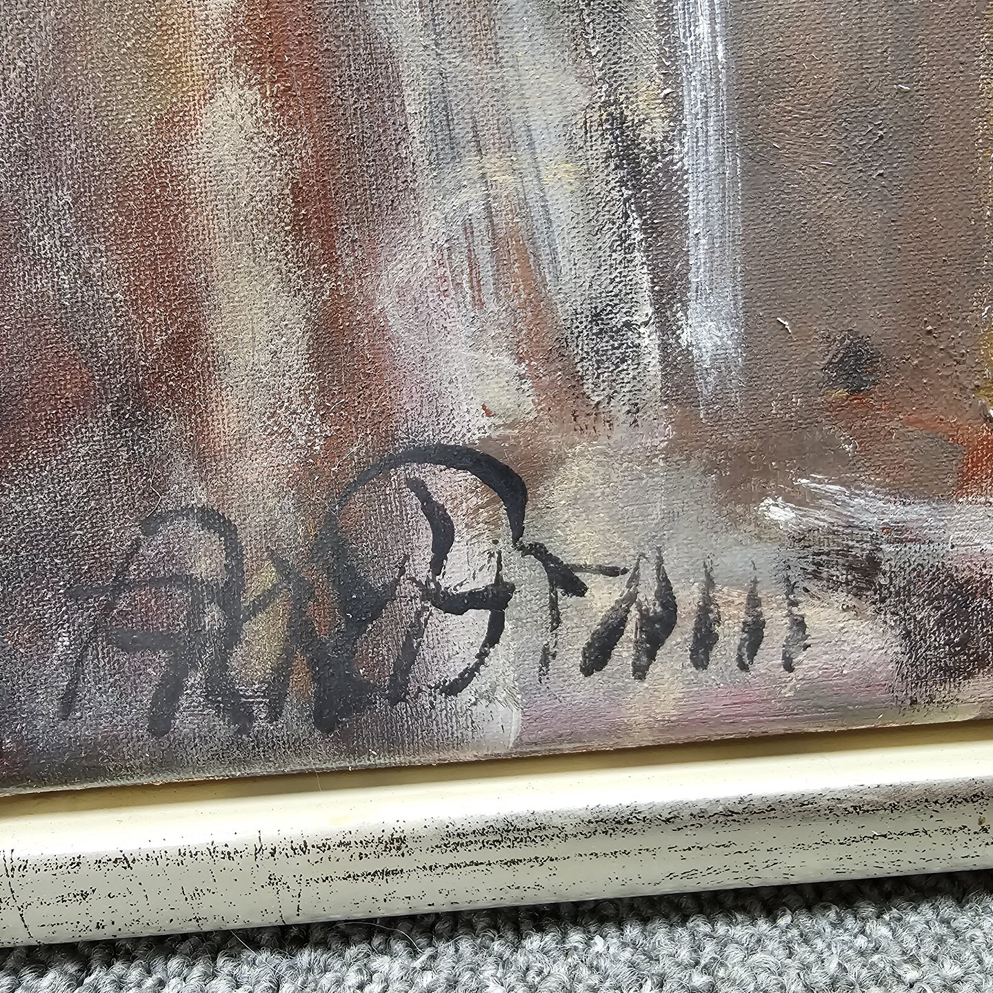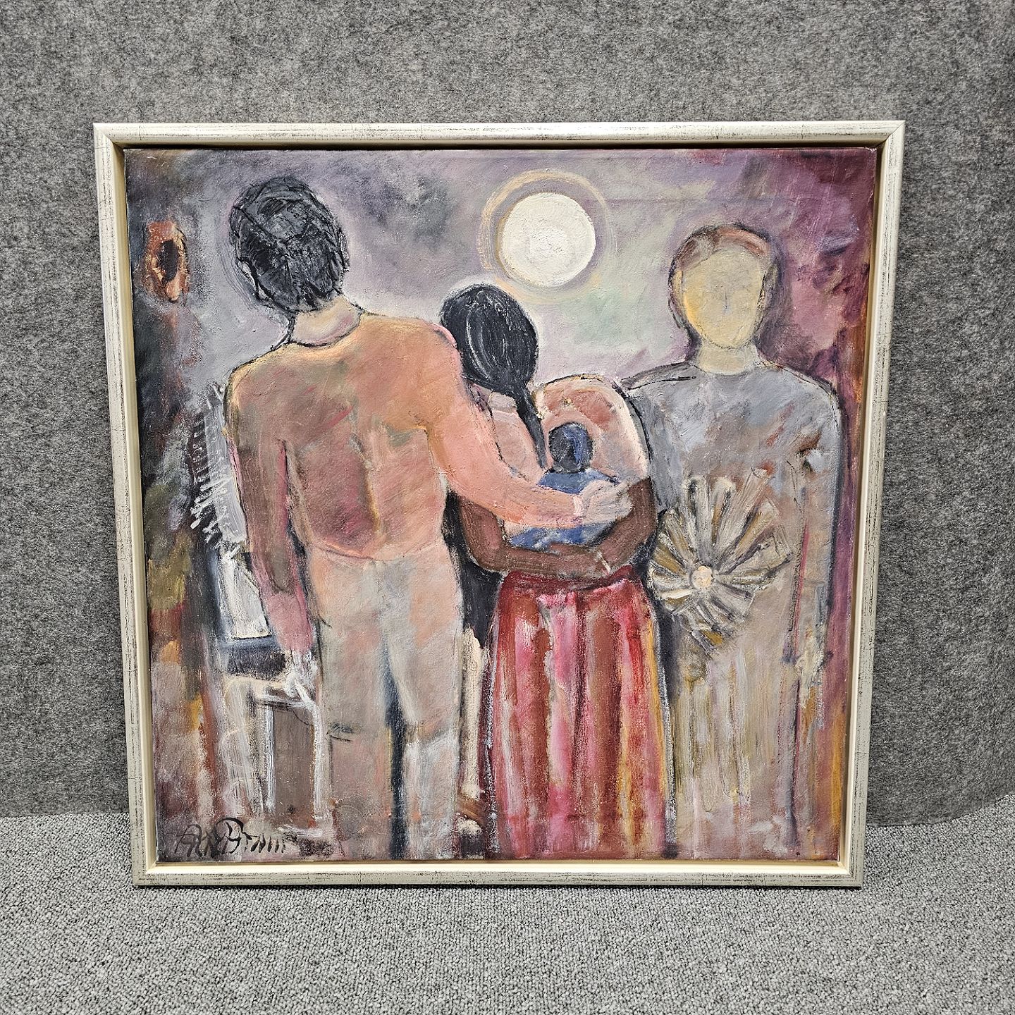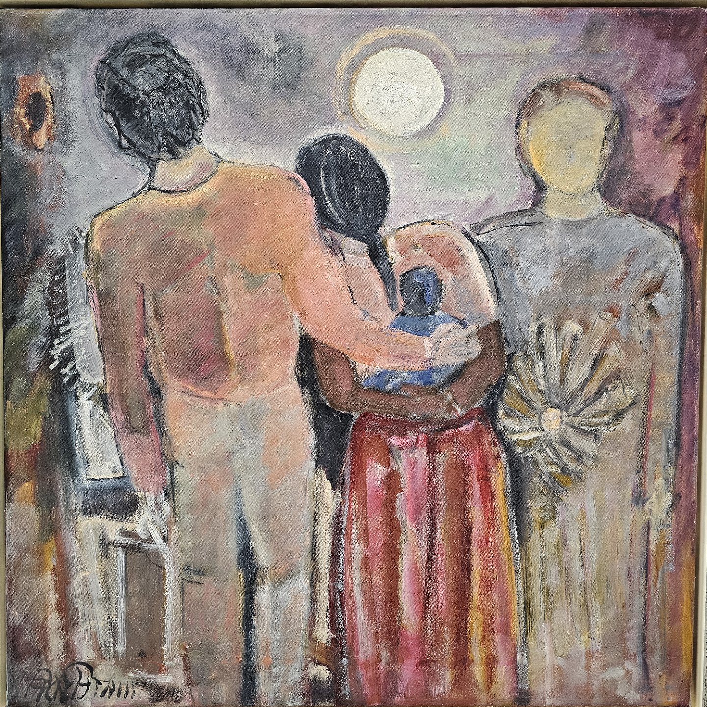 Maleri udført af Karl Gram (f.1945). Motivet er af mennesker med ryggen til. Grå og røde nuancer.