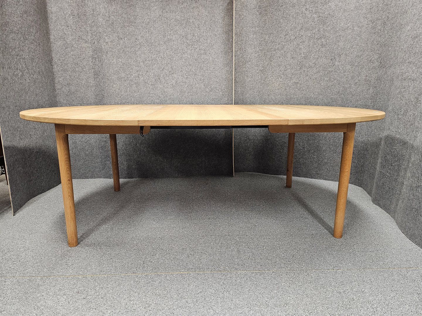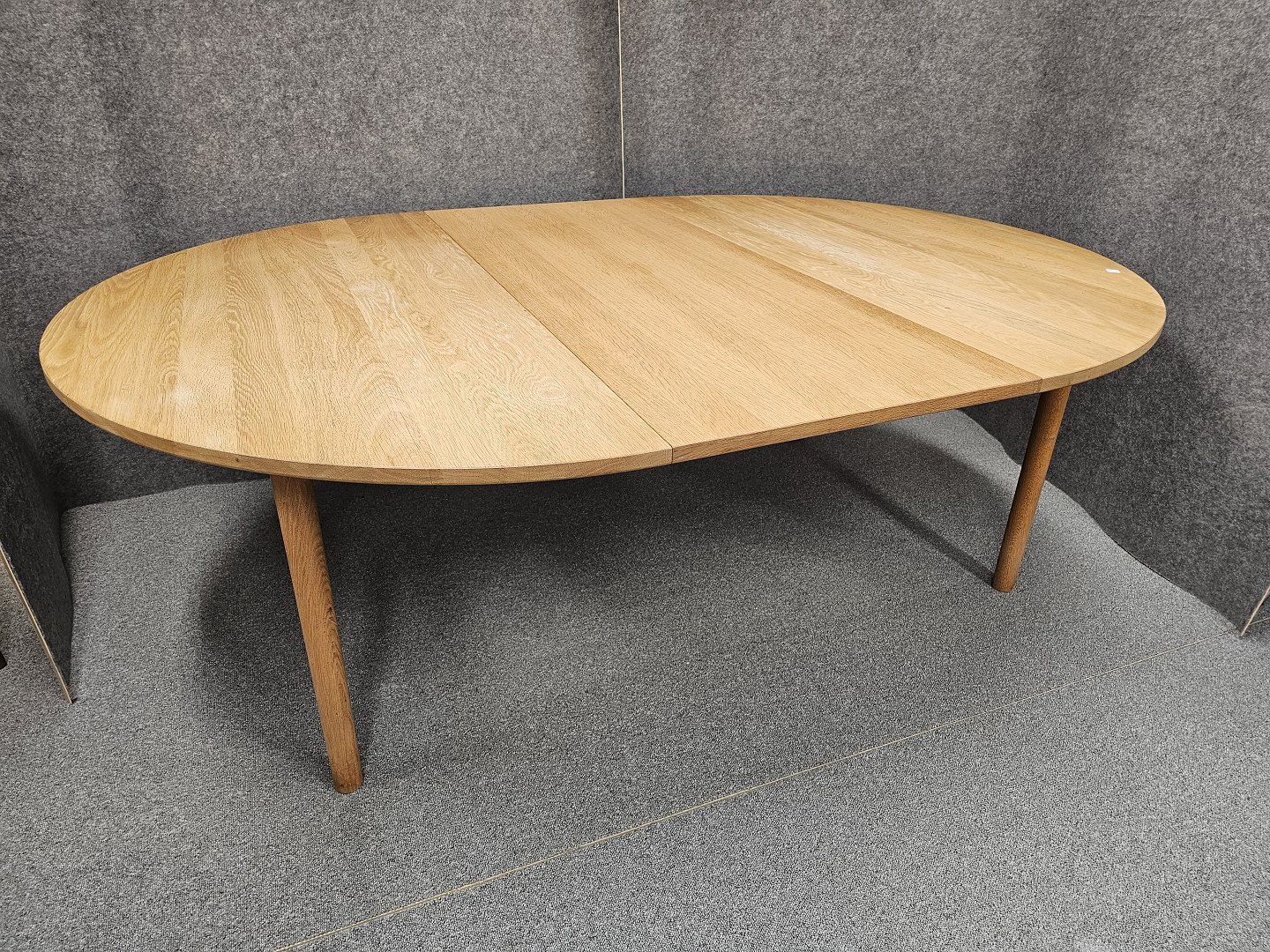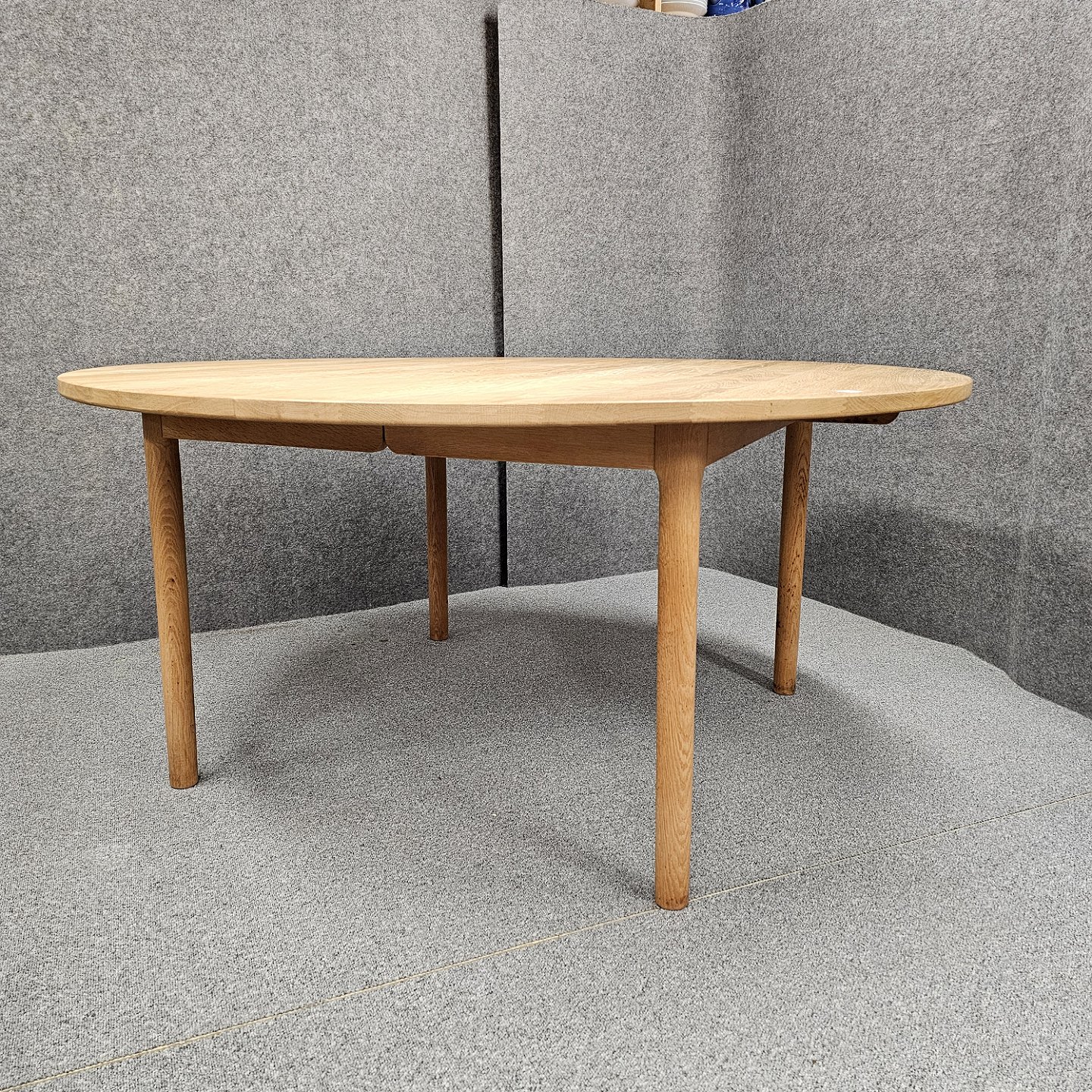 Rundt spisebord i massiv egetræ med en tillægsplade.
