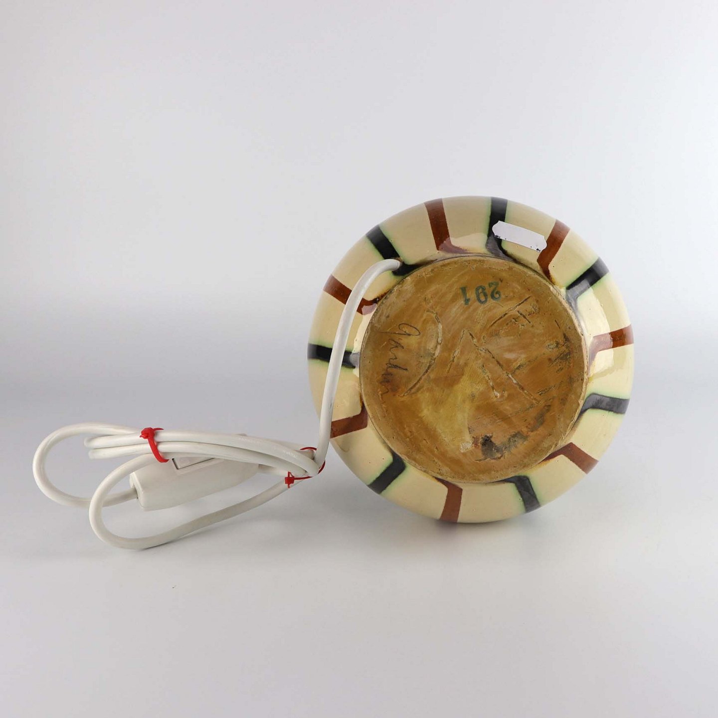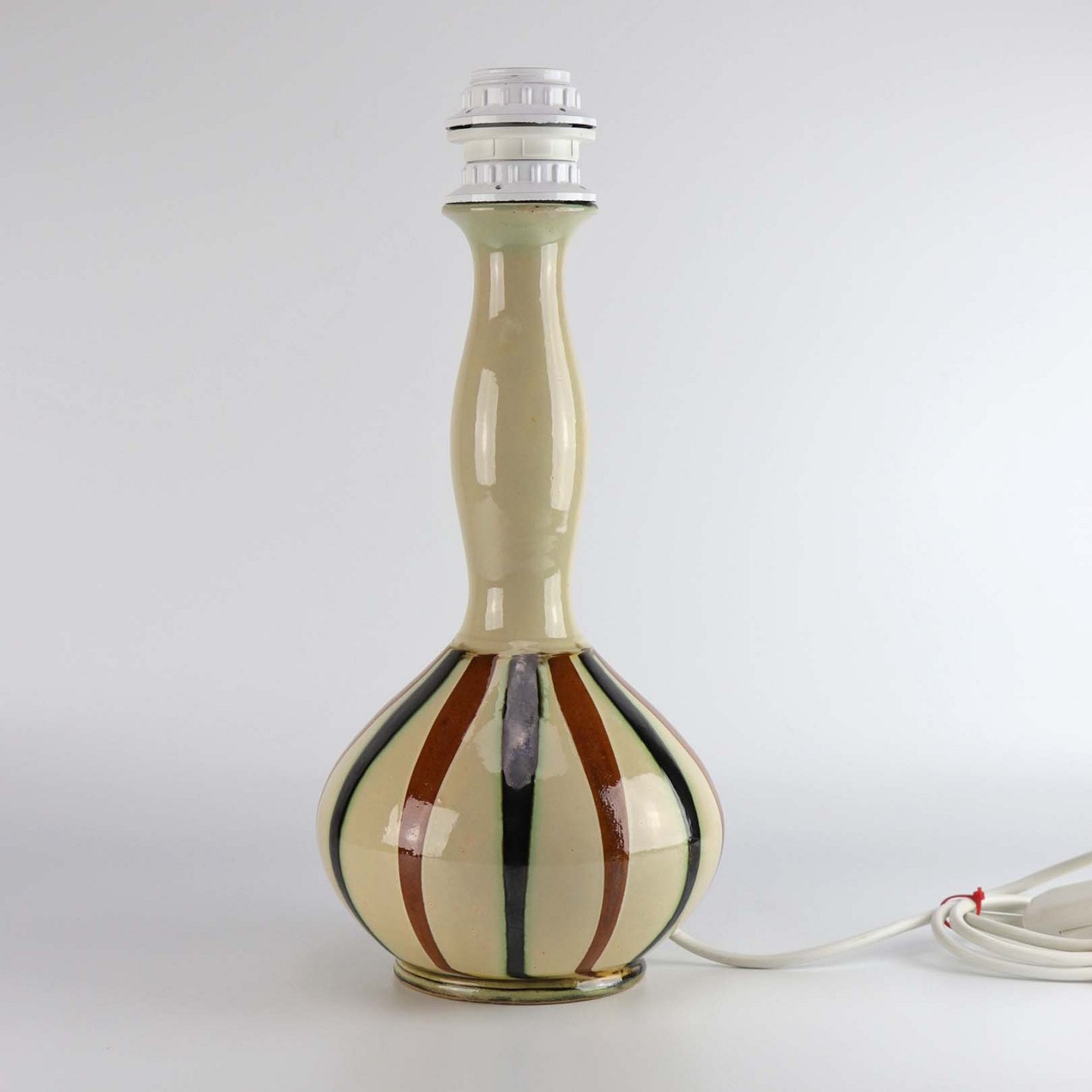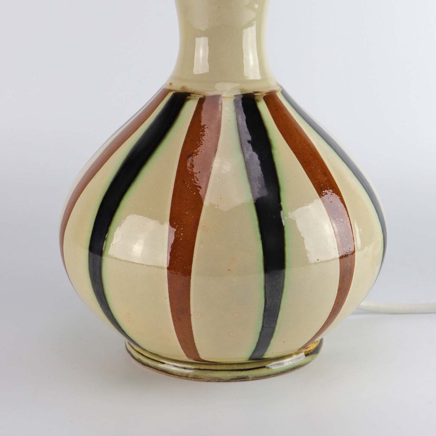 Bordlampe i keramik med brun og sort stribet glasur på beige baggrund nr 291