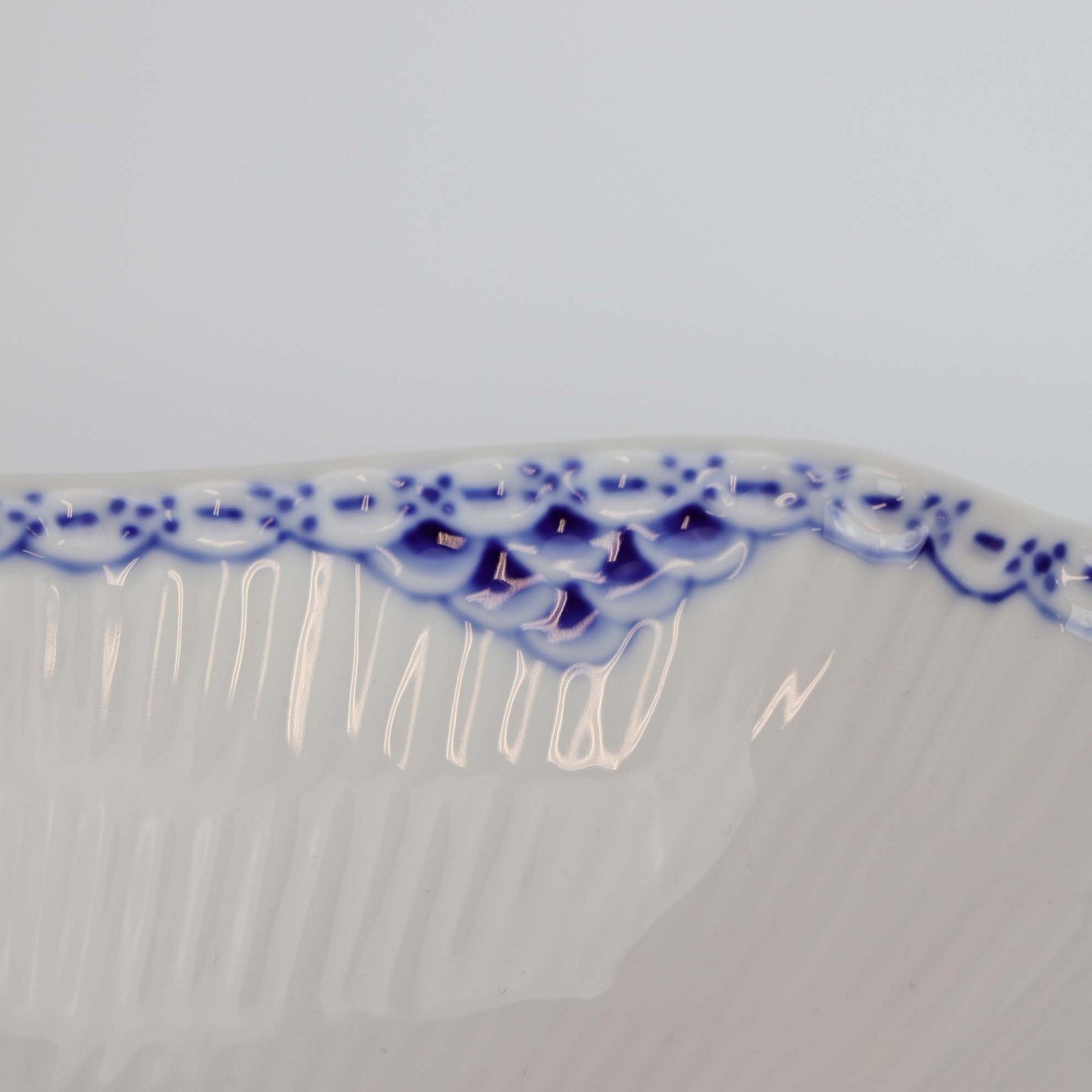 Stellet er fremstillet i riflet hvidt porcelæn med blåmalet blonder og fiskeskældsdekoration