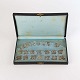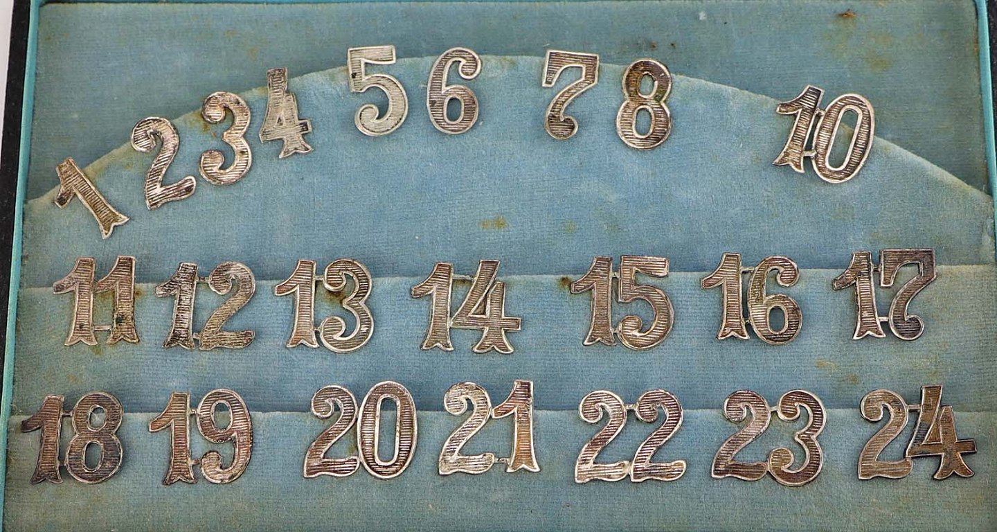 Æske med tal fra 1 til 24 i sølv. Tallet 9 mangler. Disse kan eksempelvis anvendes i forbindelse med julens pakkekalender.