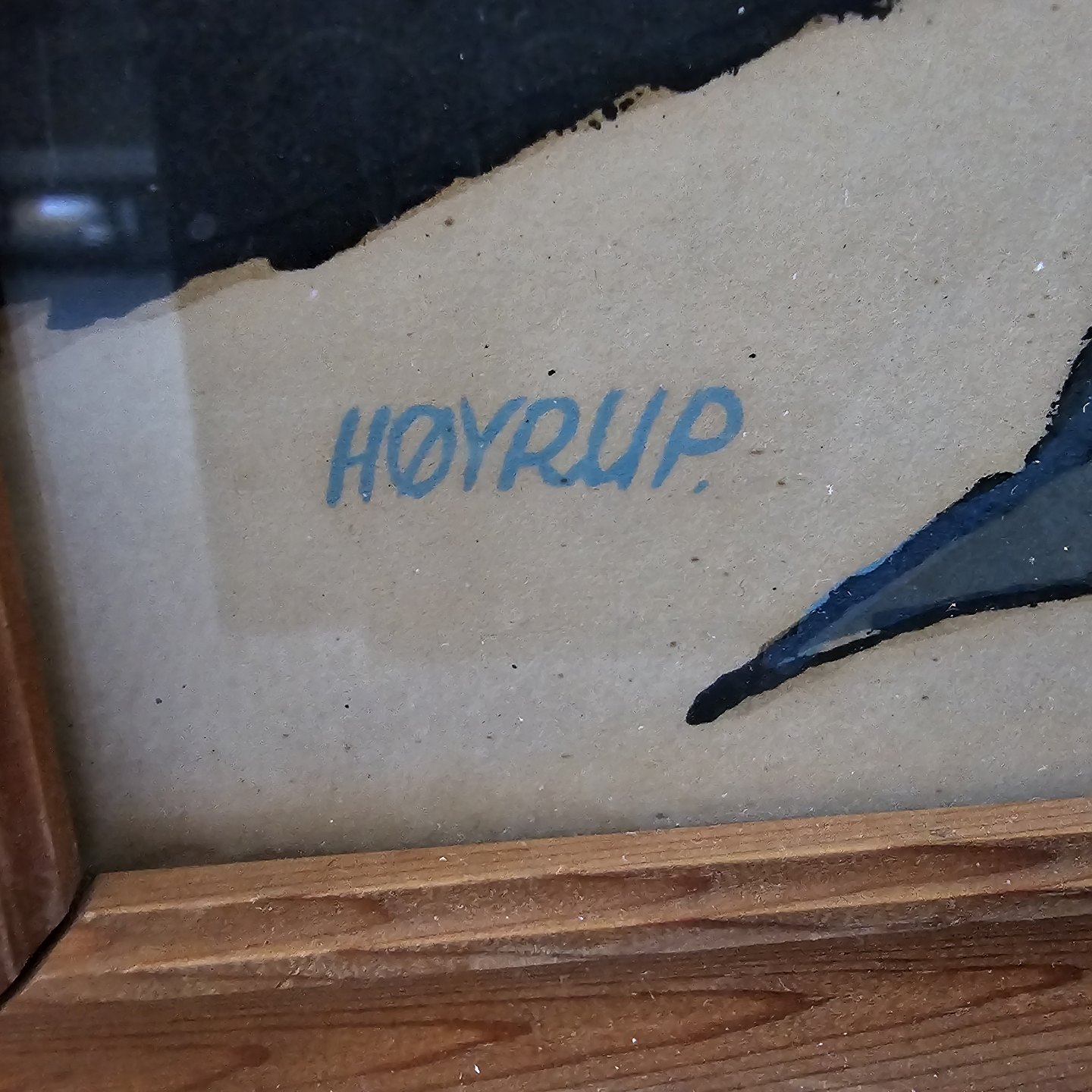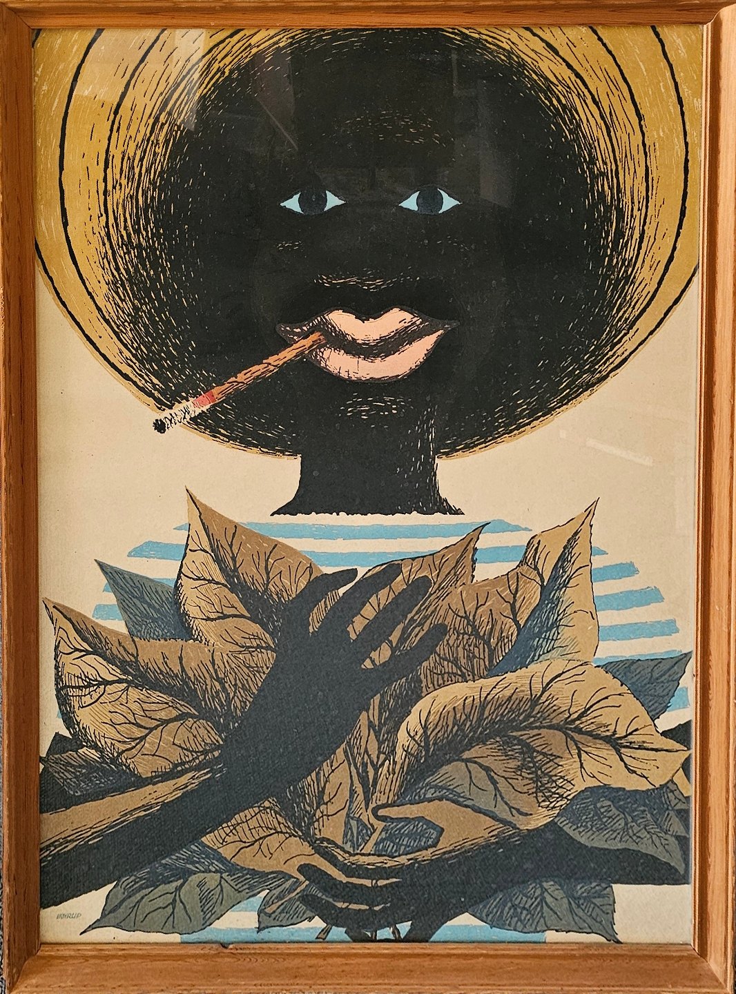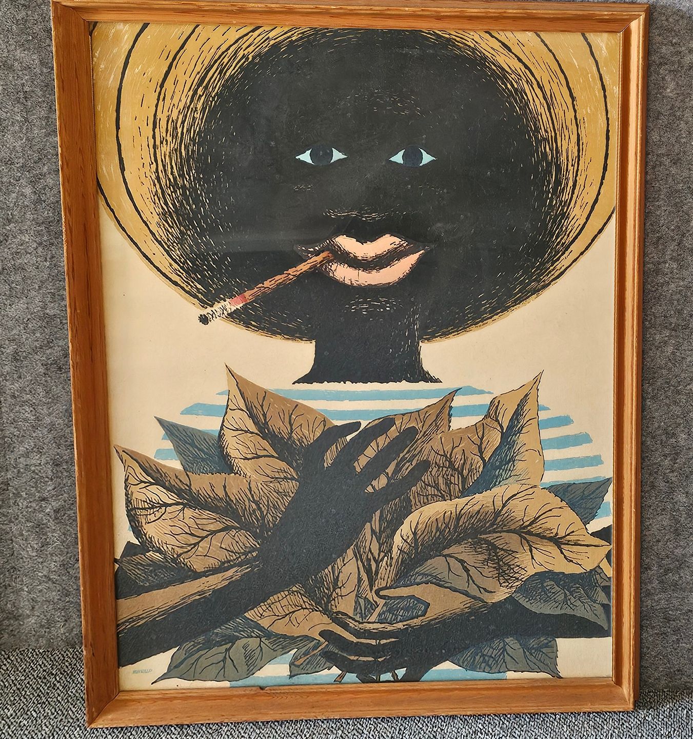 Indrammet tryk i træramme med motiv af mørk afrikaner med favnen fuld af tobaksblade. Brugt til reklame for F.D.B. Cigar og tobaksfabrikker Esbjerg