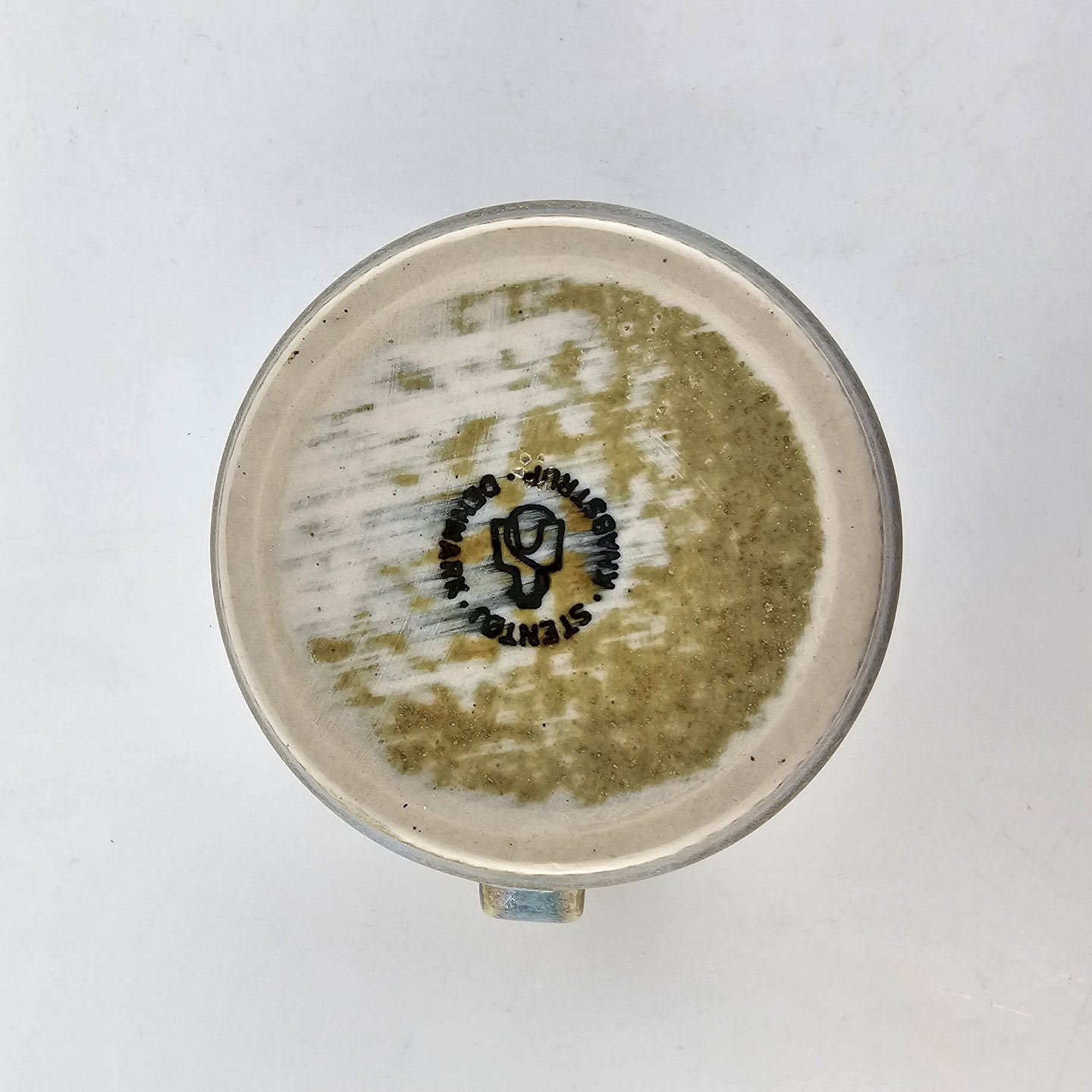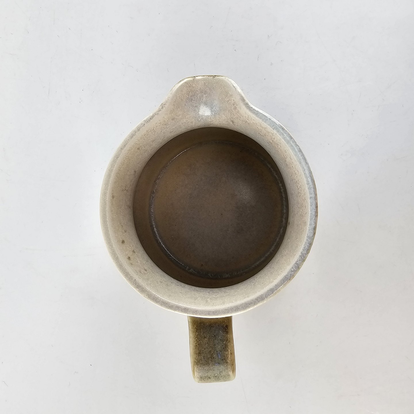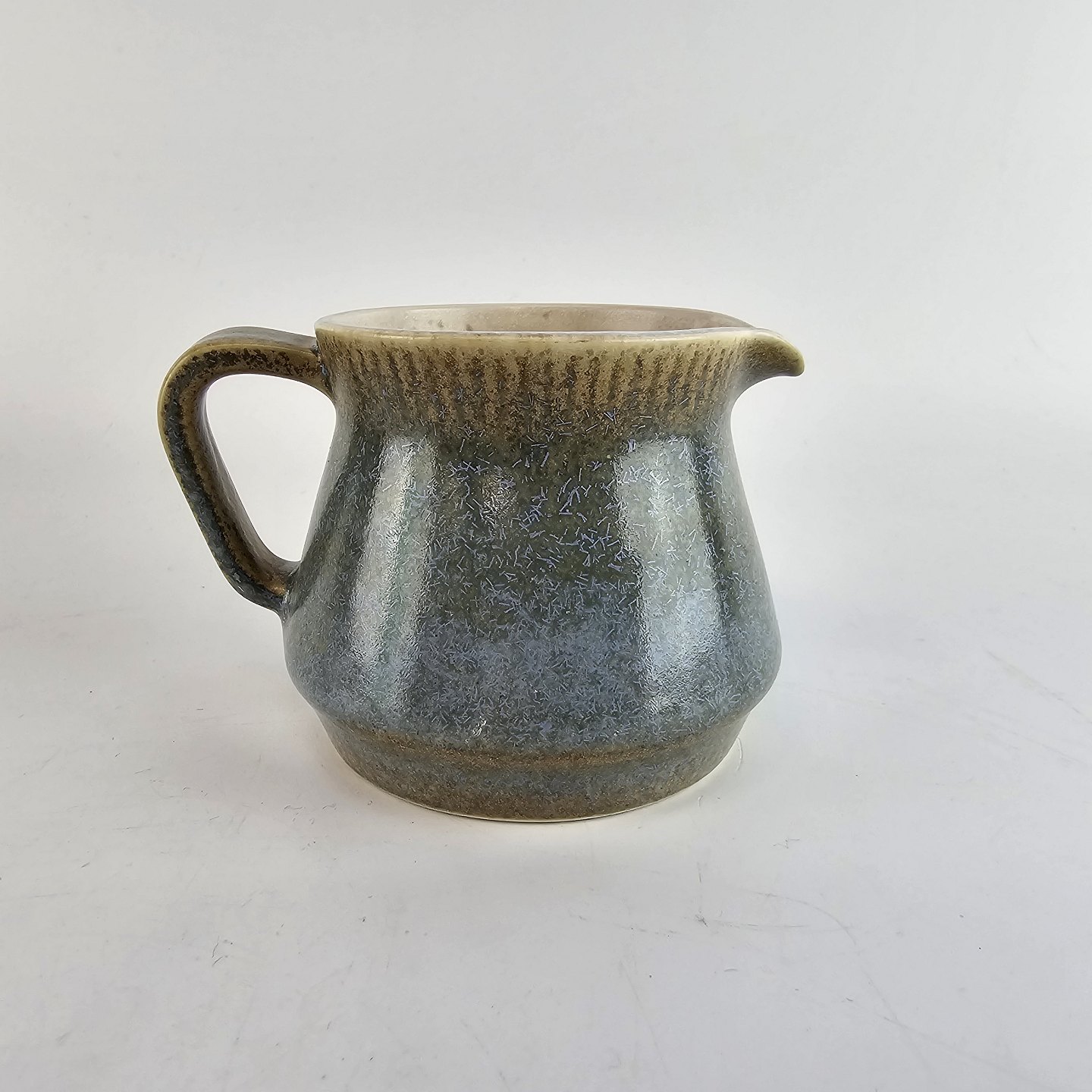 Flødekande af stentøj og dekoreret med en grønlig nuancefarvet glasering.