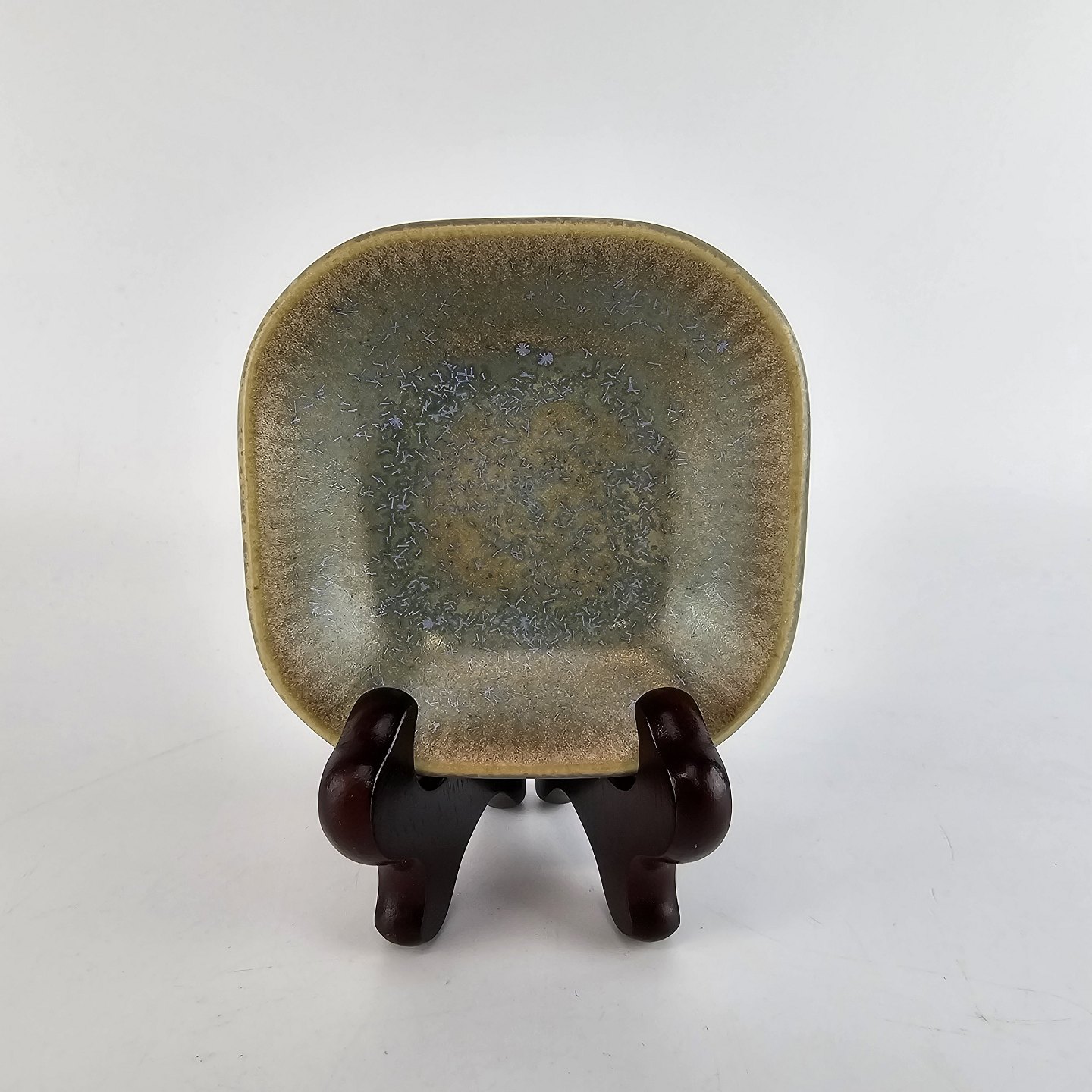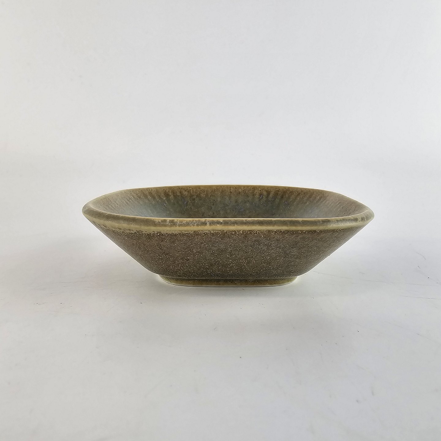 Kvadratisk asiet af stentøj og dekoreret med en grønlig nuancefarvet glasering. Fra serien Knabstrup - ofte kaldet Grøn Nøddebo