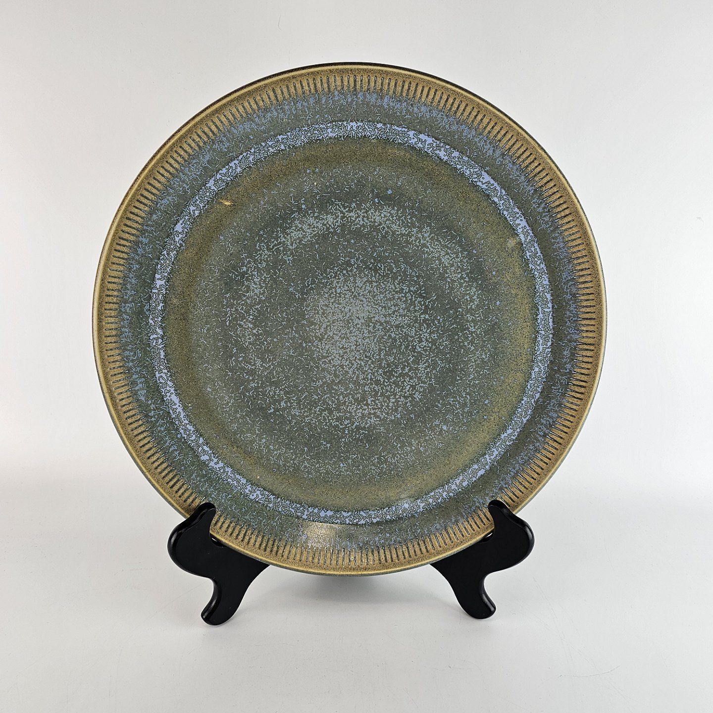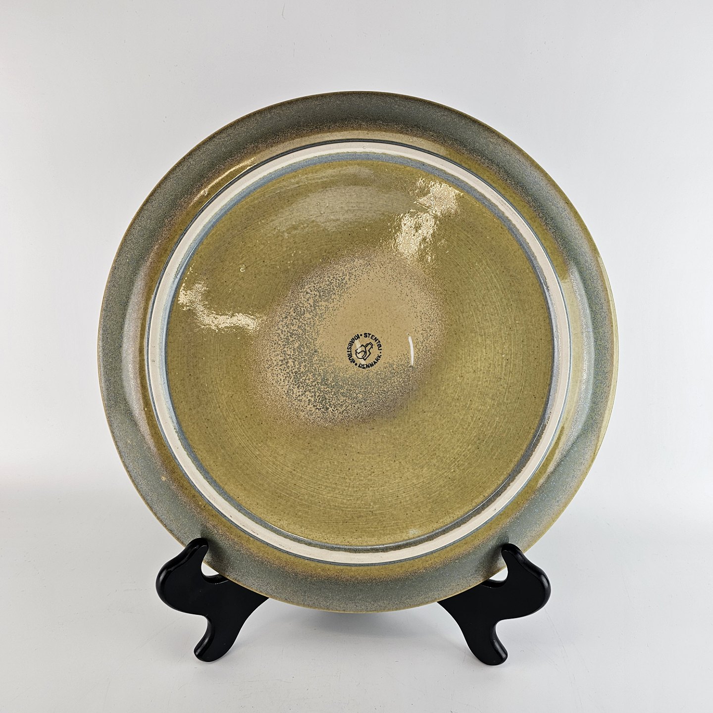 Rundt fad af stentøj og dekoreret med en grønlig nuancefarvet glasering.