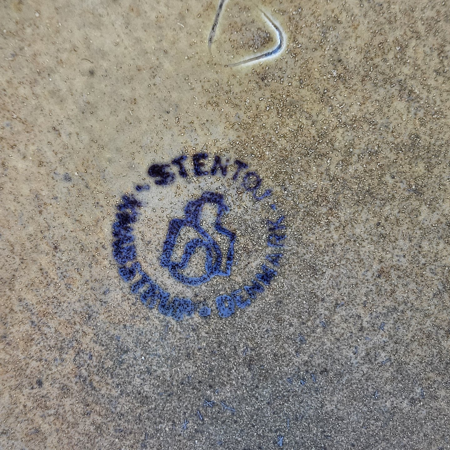 Kande af stentøj og dekoreret med en grønlig nuancefarvet glasering.