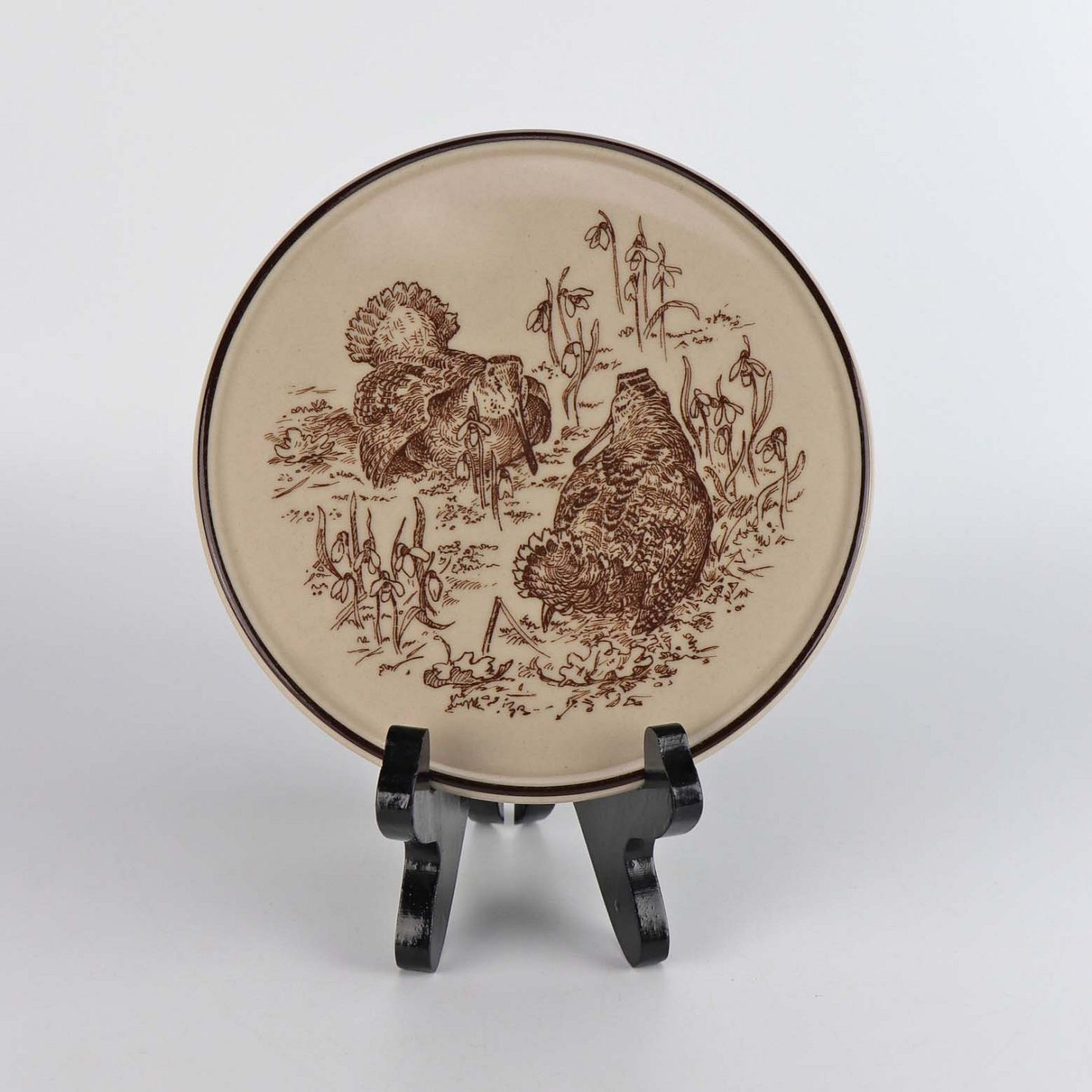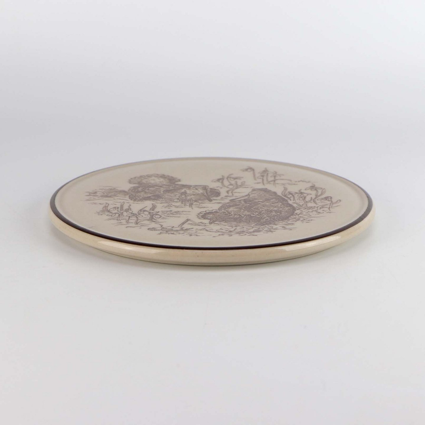 Stel i beigefarvet stentøj med forskellige dyremotiver i brun nuance