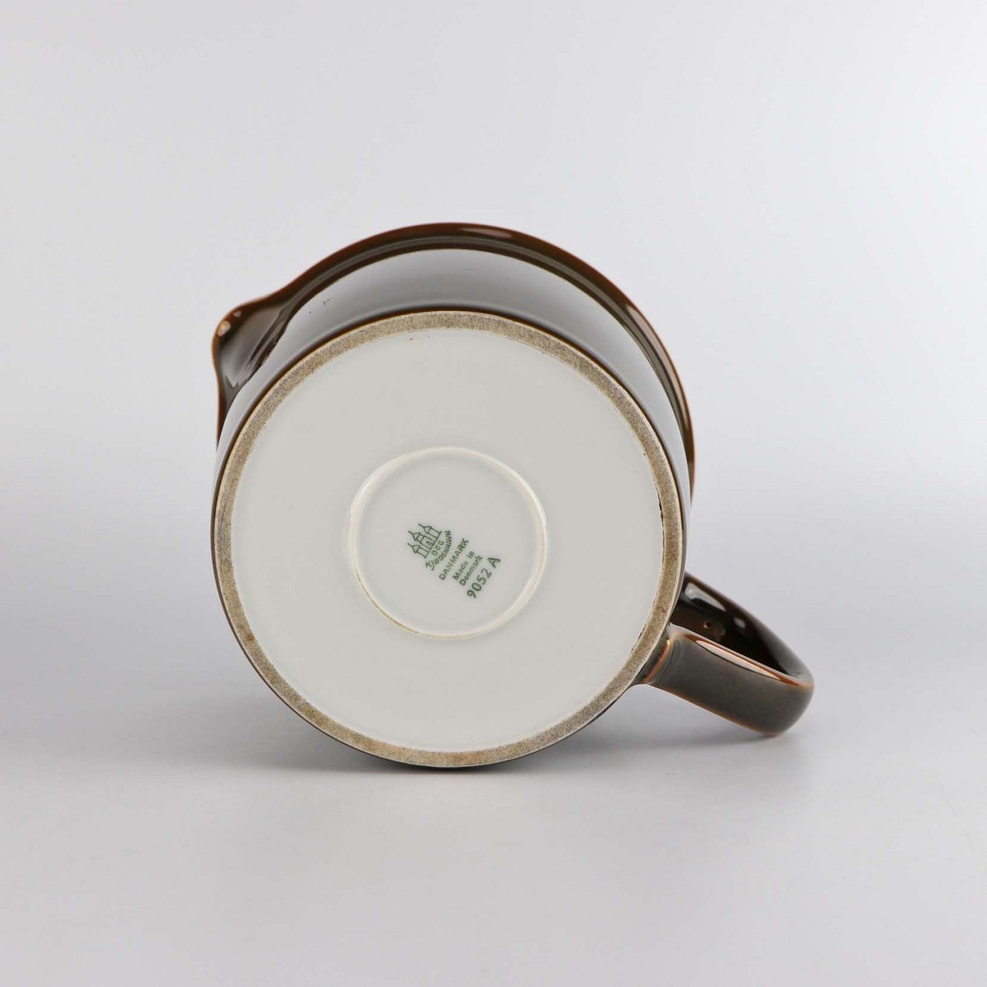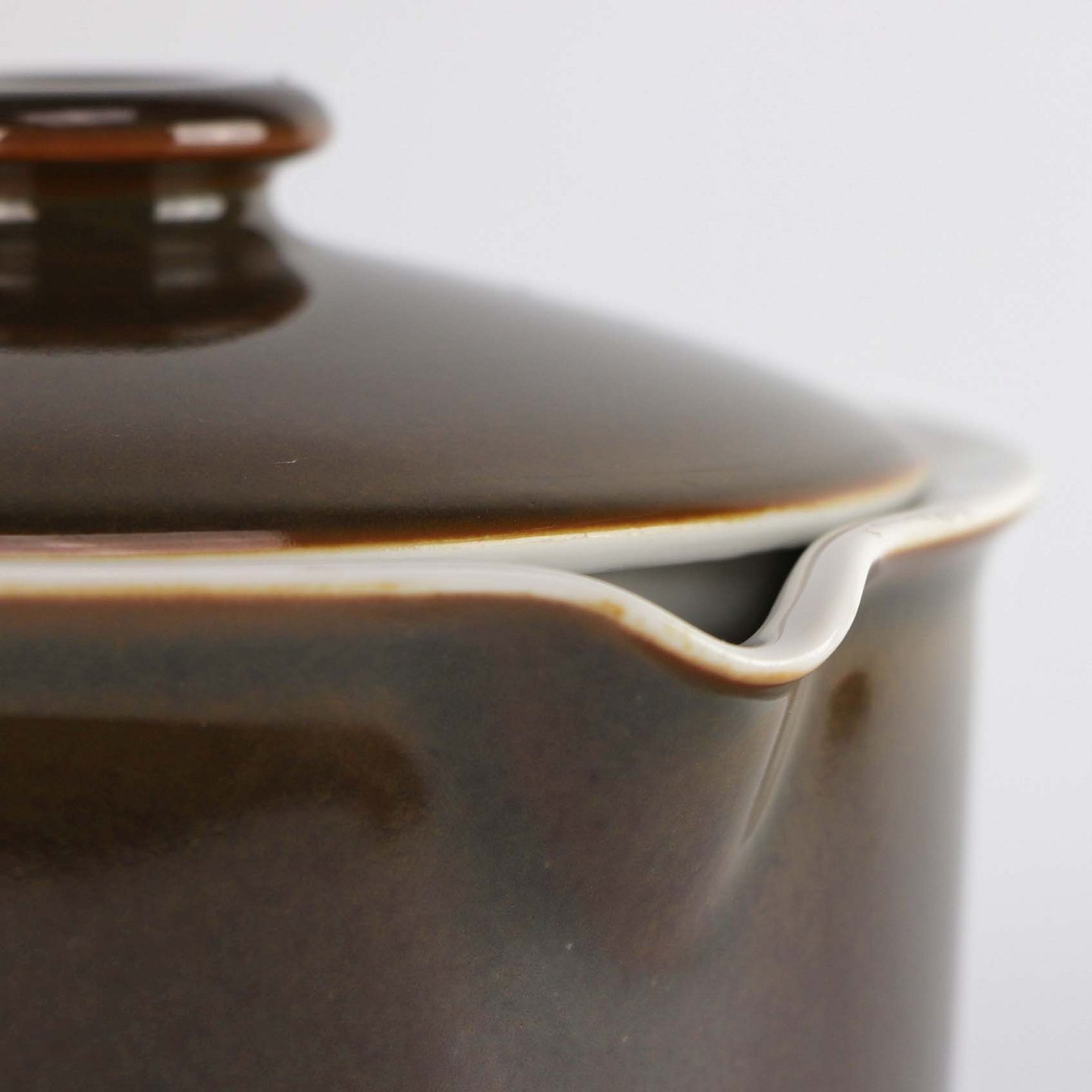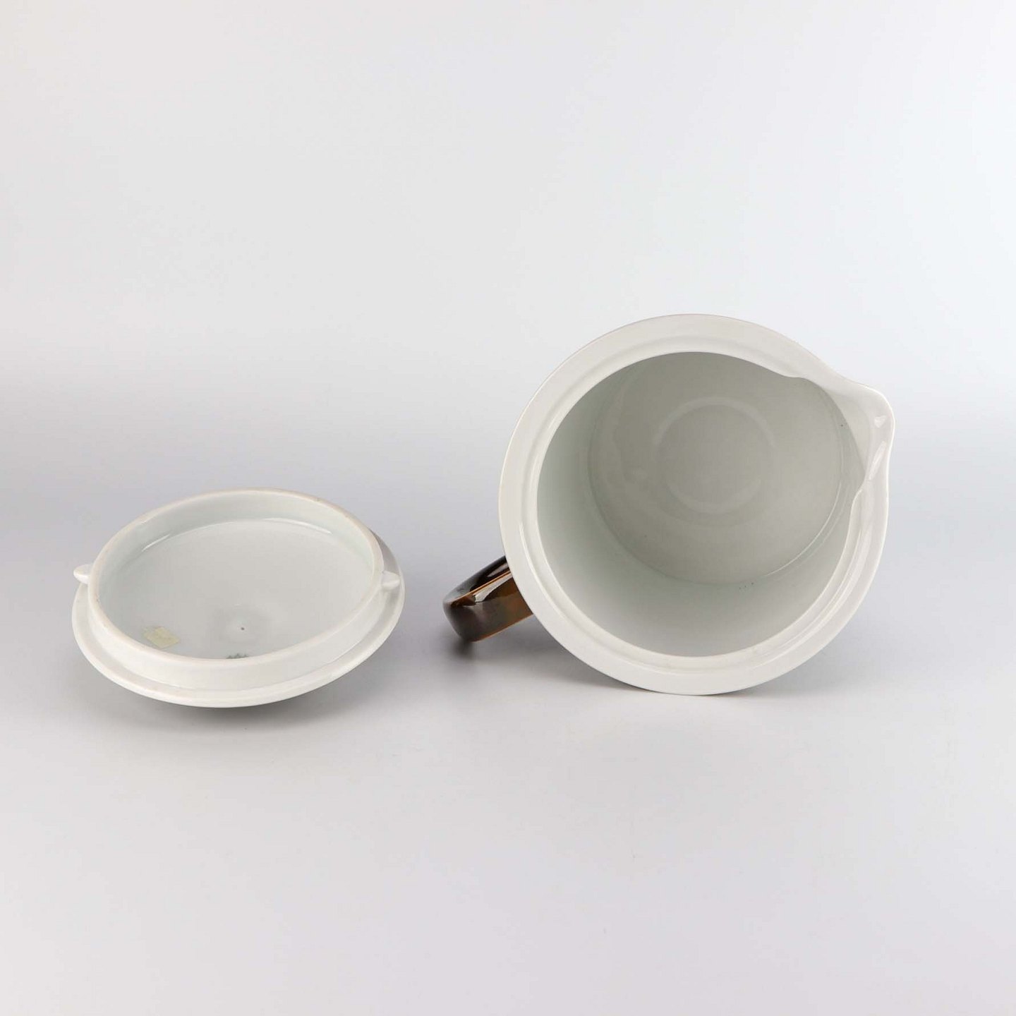 Stel i hvidt porcelæn med brun glasur på ydersiden.