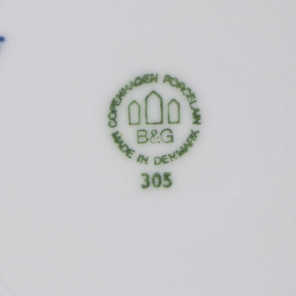 Stel i glat hvidt porcelæn med abstrakt mønster i blå nuancer